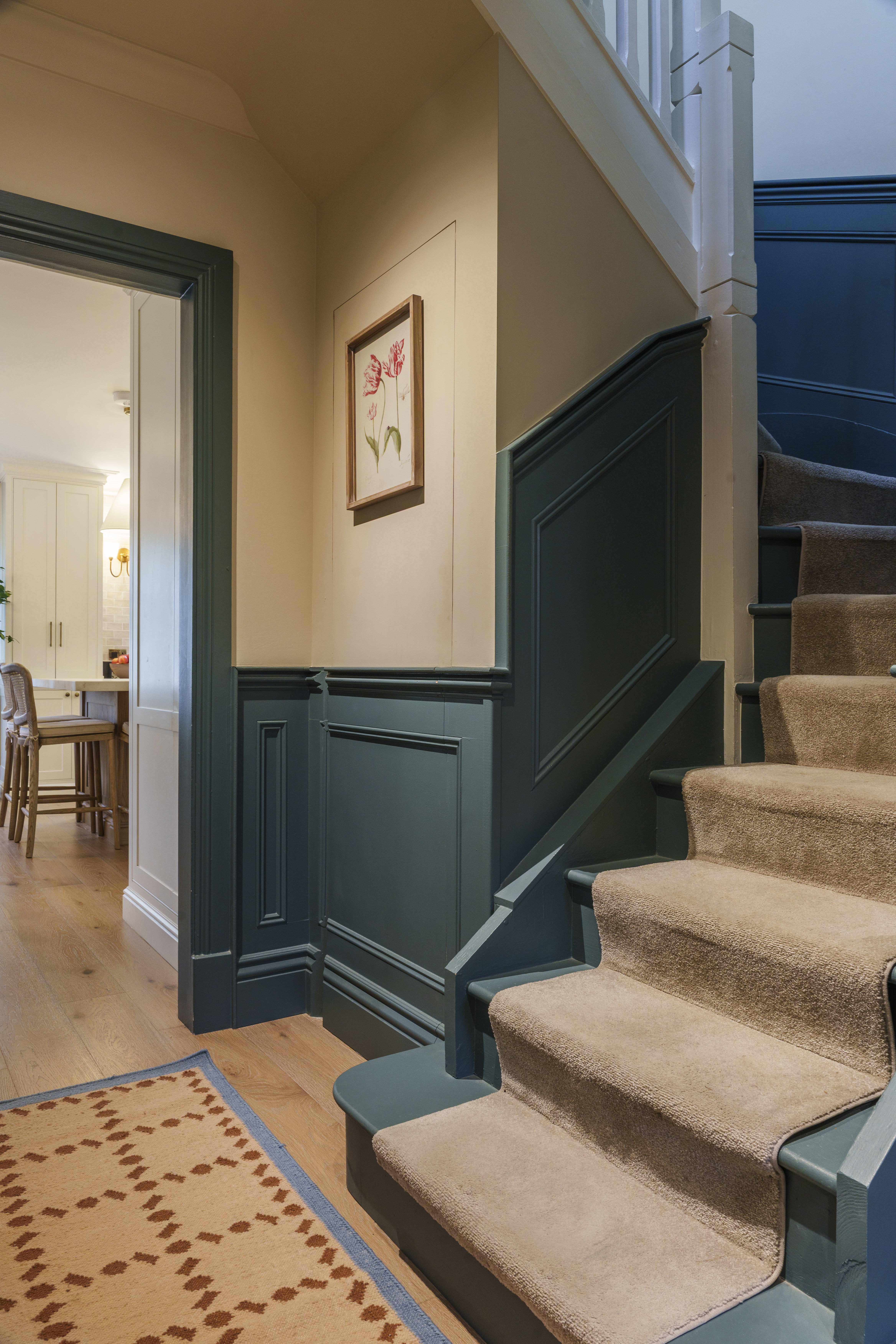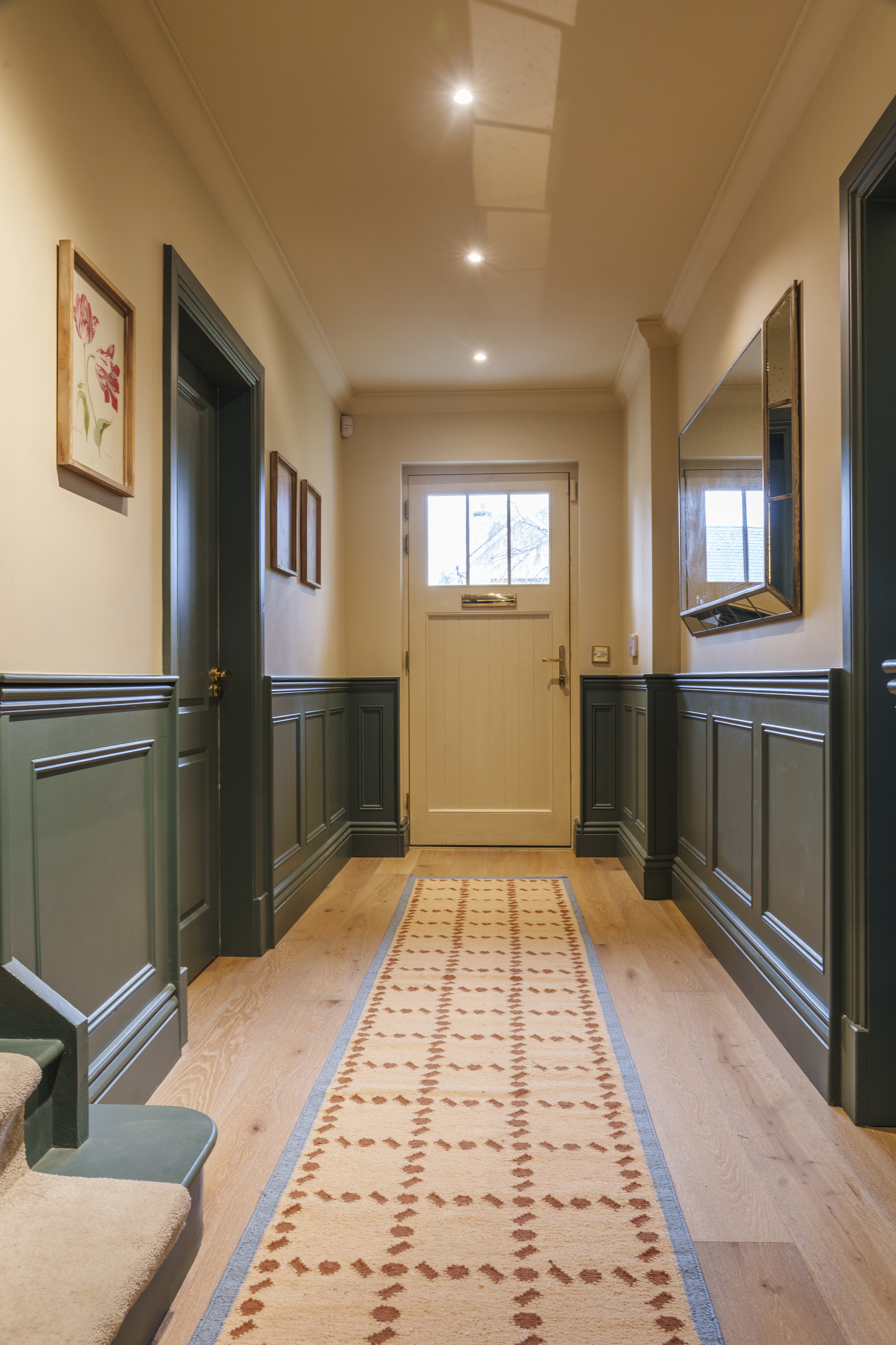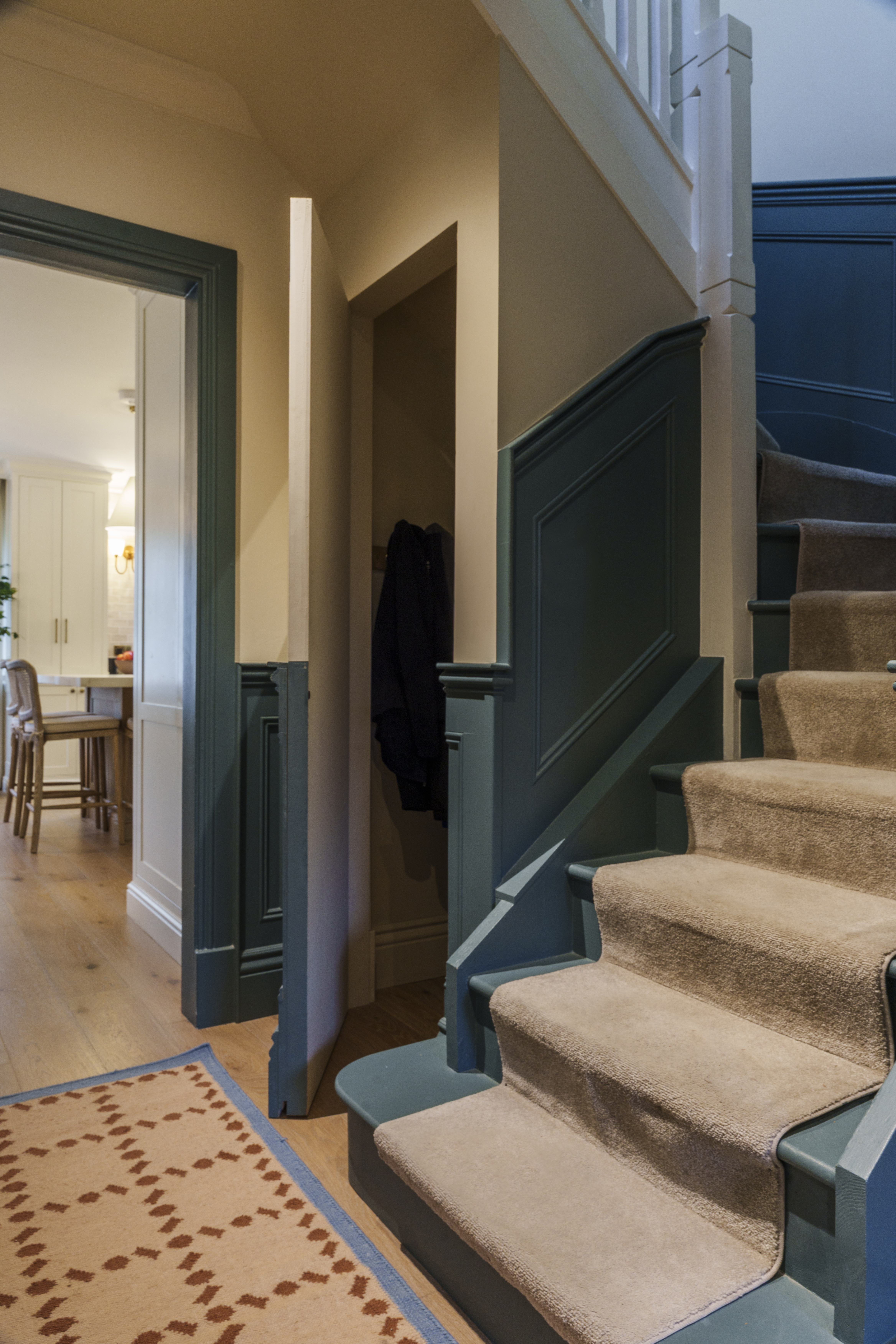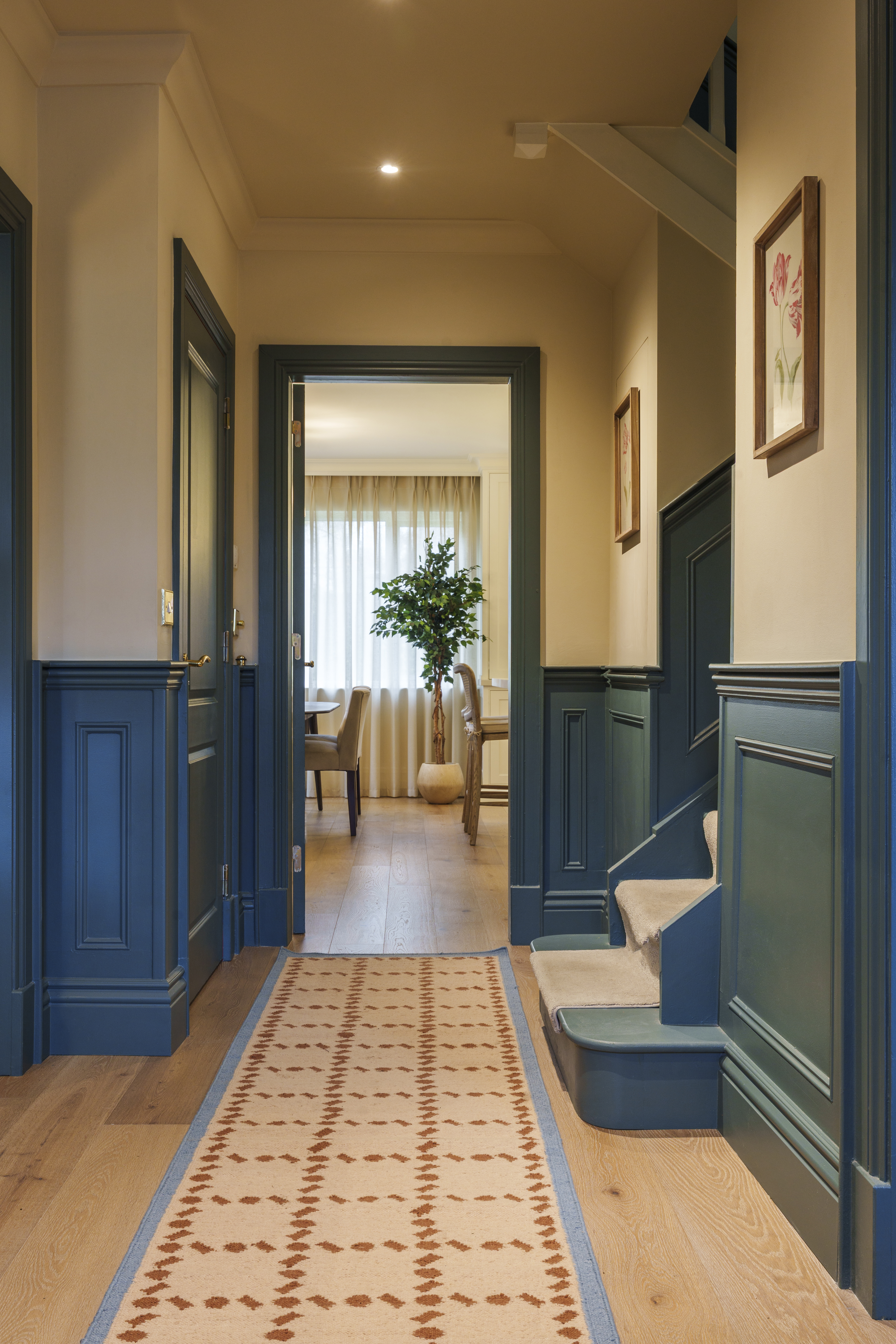 While the original hallway felt bland, simply a throughway, Deirdre explains how they addressed this. “We replaced the marfil crème floor with a warm oak hardwood, and we added proportion with colour and palette, using Farrow & Ball’s Inchyra Blue on the lower wall panels contrasting softly with an off-white above and across the ceiling. A hollow, dull corner portion was redesigned and built out to add congruence and balance to the hallway, and in doing so created a valuable, disguised tall storage room.”