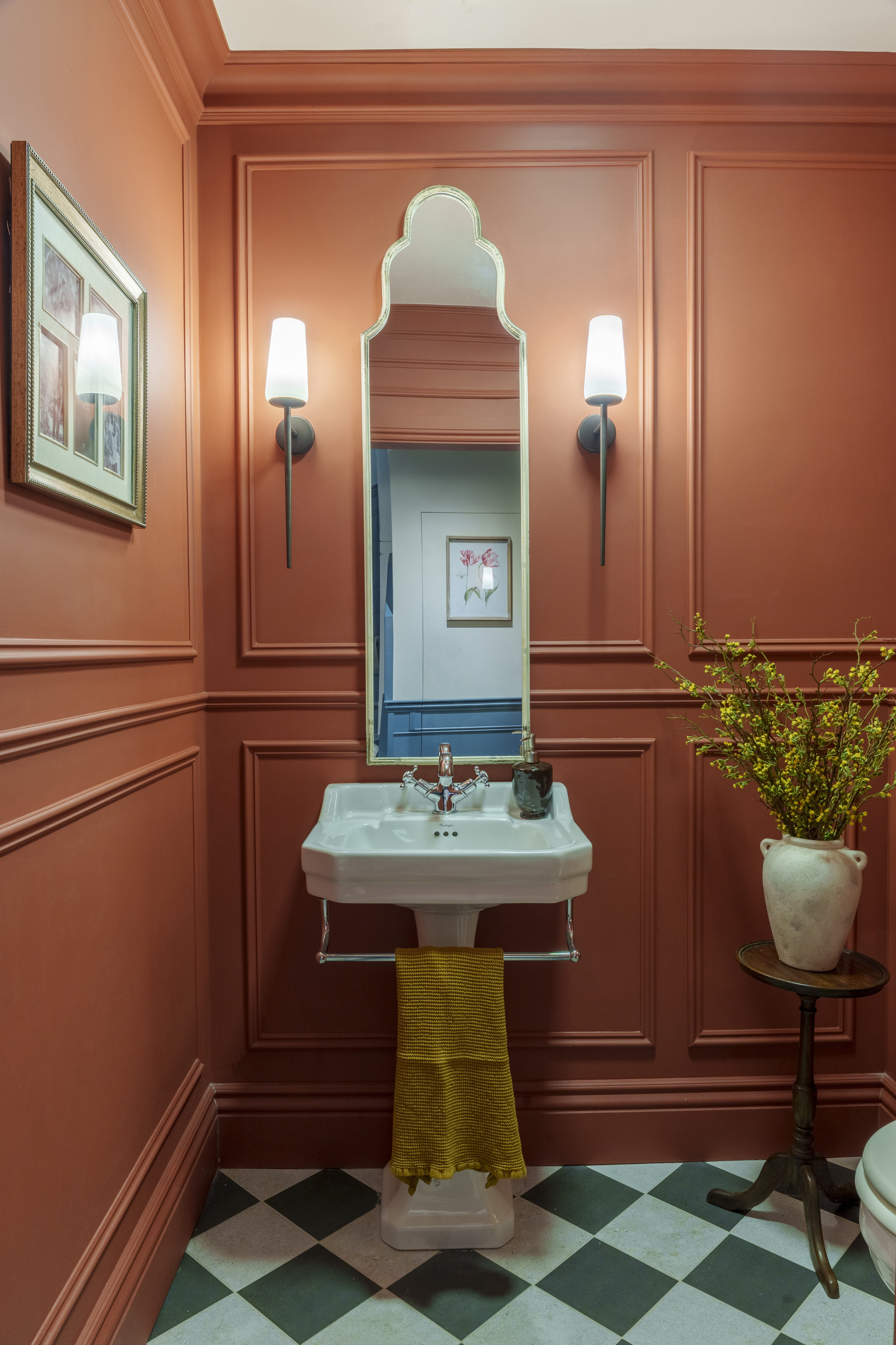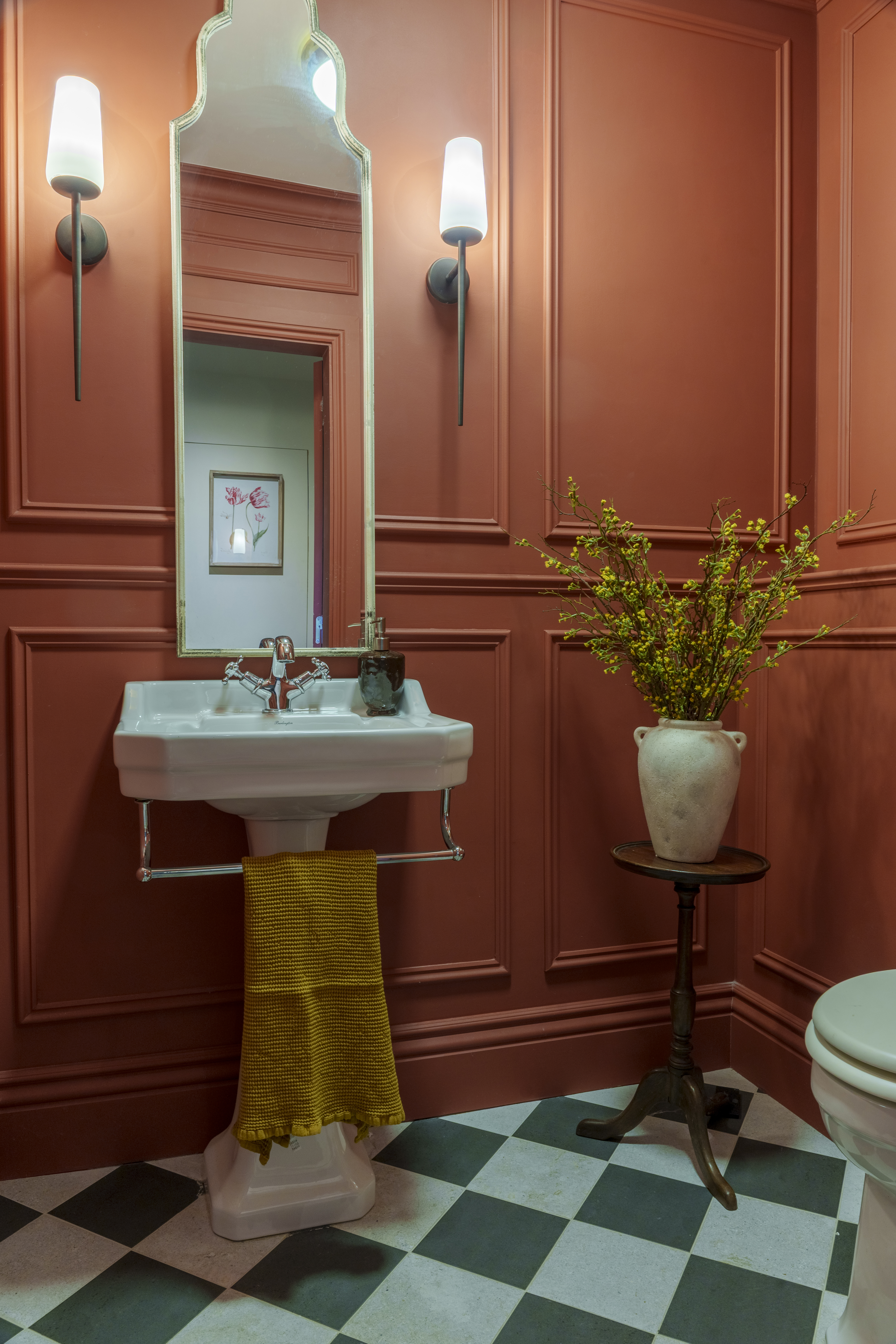 The WC off the hall was small, and had cream floor and wall tiles that lacked warmth. “We painted the walls, skirtings and coving in the rich terracotta of Farrow & Ball’s Picture Gallery Red,” Deirdre says, “with ogee panels adding texture, quiet sophistication and depth. An ornate tall, slim mirror framed in antique silver reflects the gentle glow of two elegant wall sconces. A classic checkered black-and-white tiled floor grounds the room. The reaction of surprise from guest to this little room is a real standout.”