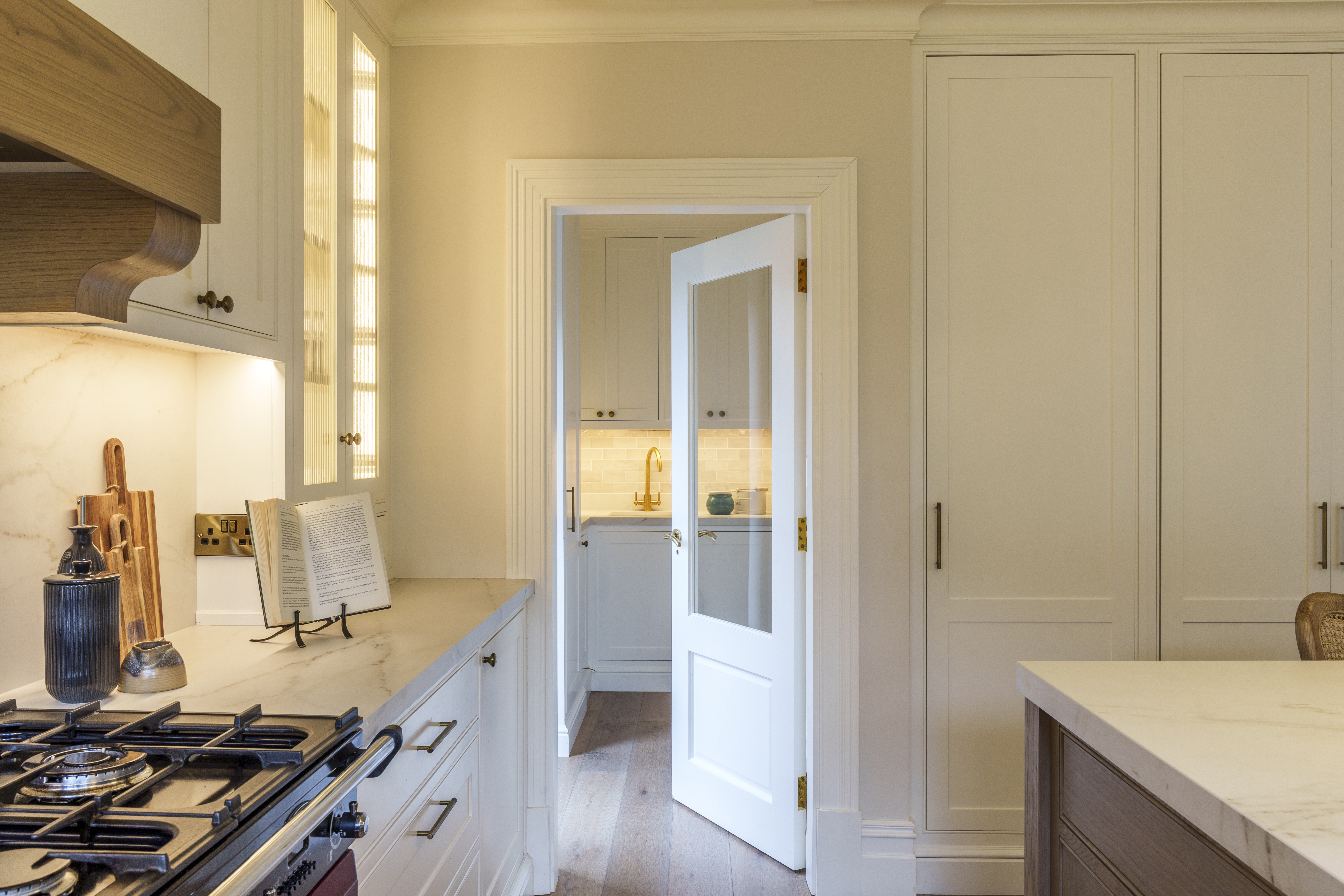 The new kitchen is an elegant blend of soft tones and textures. “Soft cream hand-painted cabinetry by Newtown Woodworks in Kildare wrap the room in an inviting glow, while the illumination from elegant pendant lights and sconces casts a tender, evening-like warmth over every surface,” Deirdre explains.