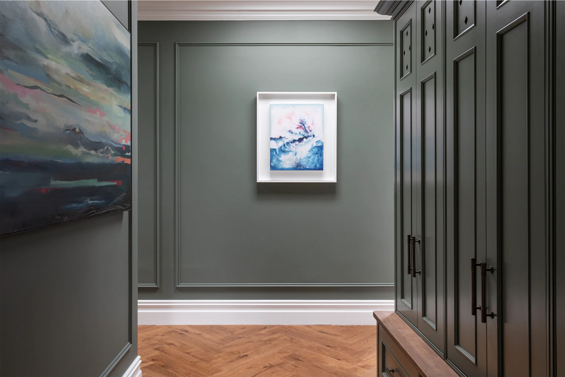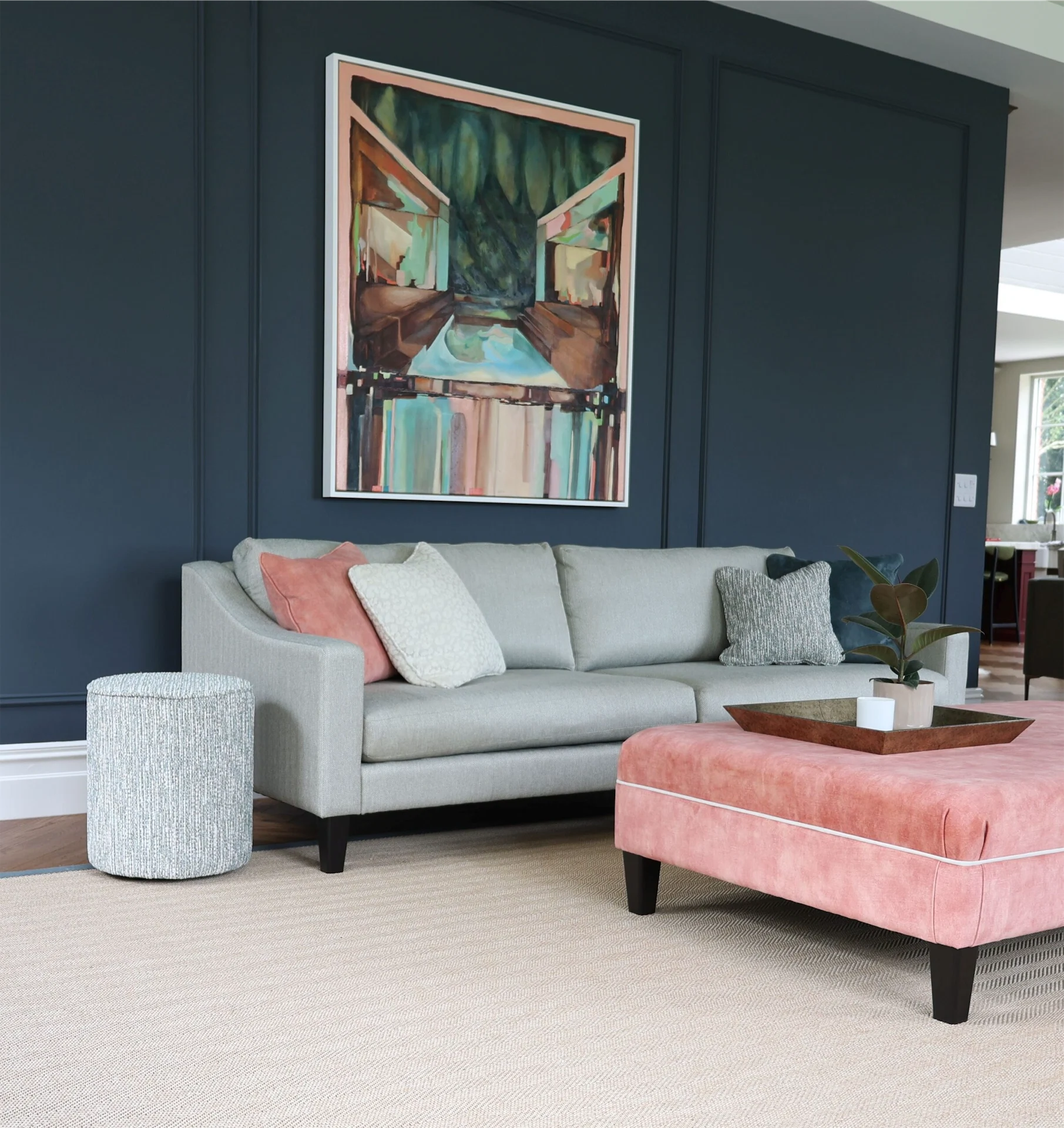 Where I and my company, dtale design, came in, was to collaborate on design specification to create a warm, contemporary, and sophisticated scheme. Working closely with the clients, I honed in on elegant colours, finishes, lighting and furnishings that balanced the scale of the extension. The client’s refined palette included a collection of Irish fine art which was central of the design scheme, including bold expressionist art from Irish artist Andrea Flanagan.