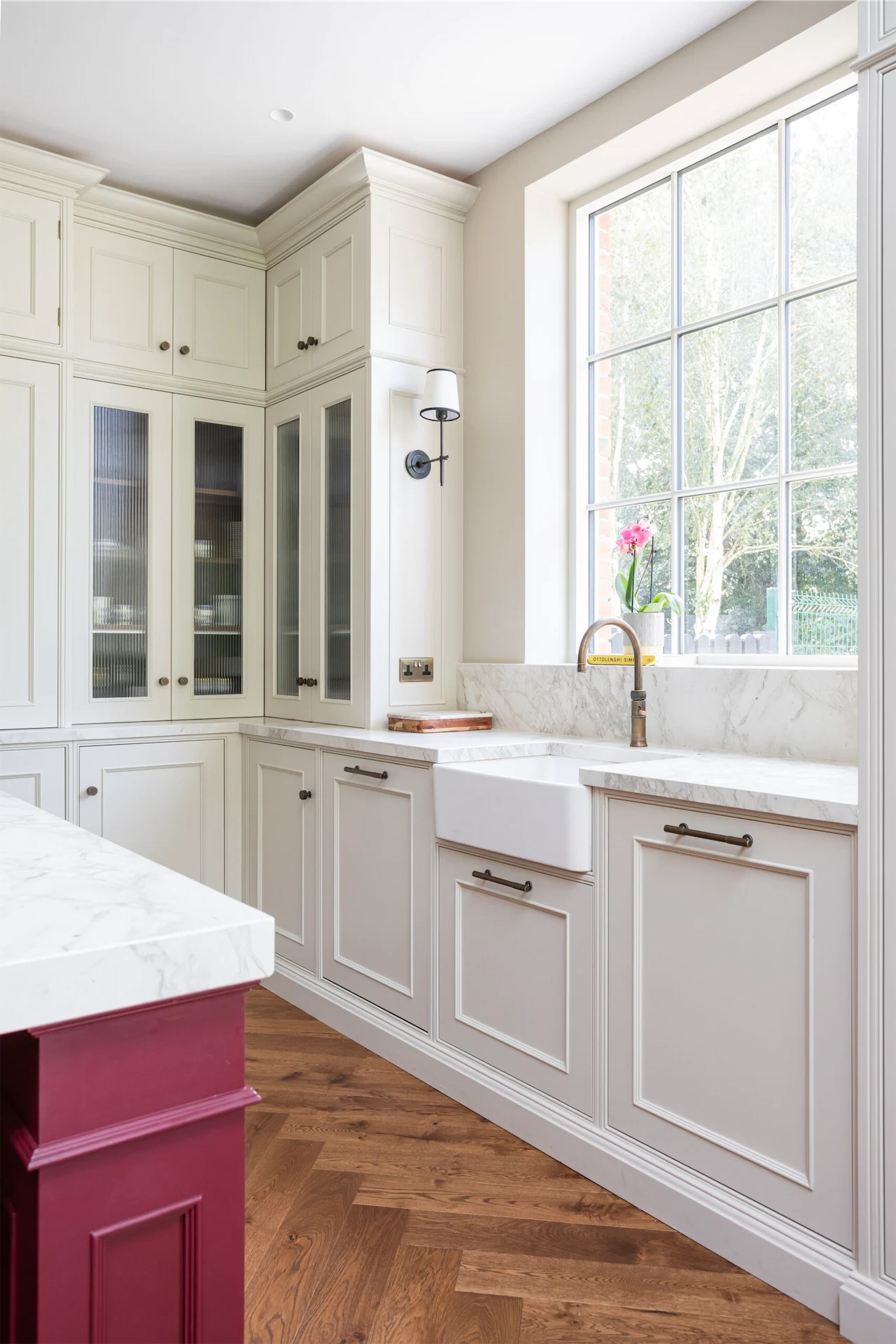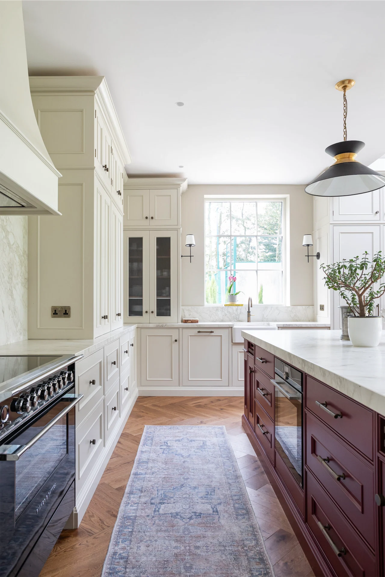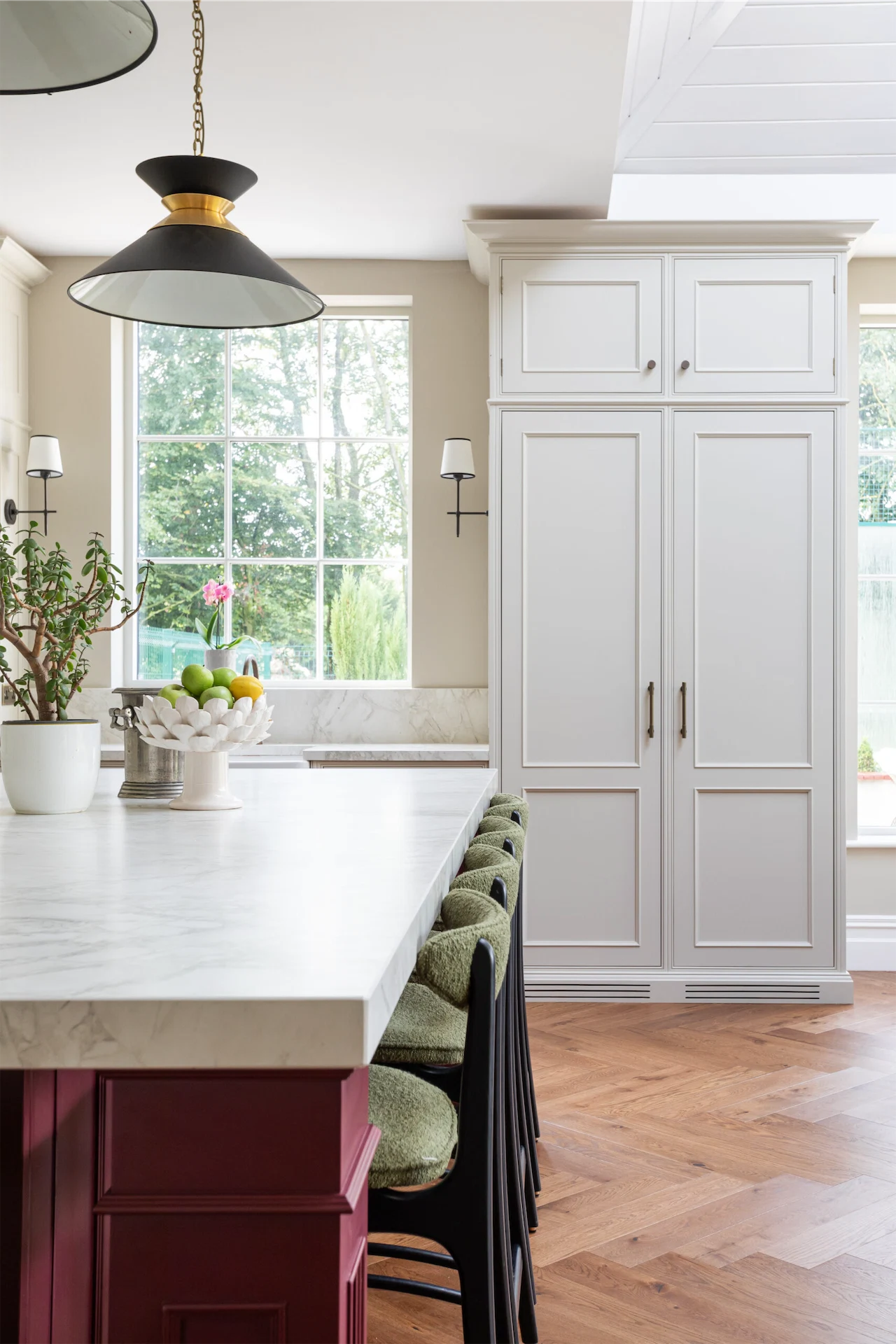 Beaded in frame cabinetry was installed throughout the kitchen and pantry to ceiling height, hand-painted in Farrow and Ball’s subtle Shaded White. An oversized seamless island, with the same handcrafted beaded slip door style, is painted in Farrow and Ball’s Preference Red. Antique brass hardware is by Armac Martin and the cherry on top, the beautiful Dekton Portum worktop and extended backsplash.