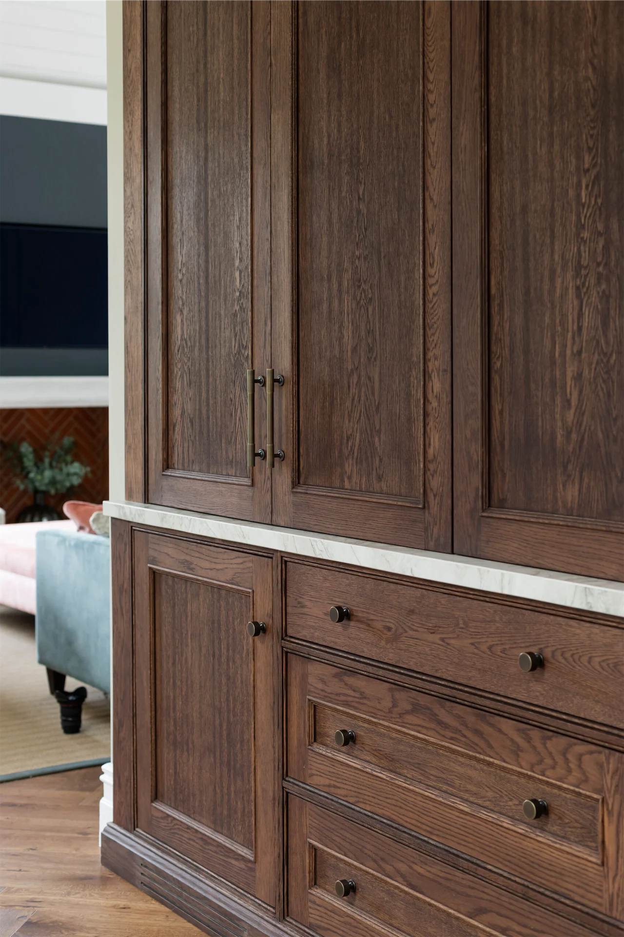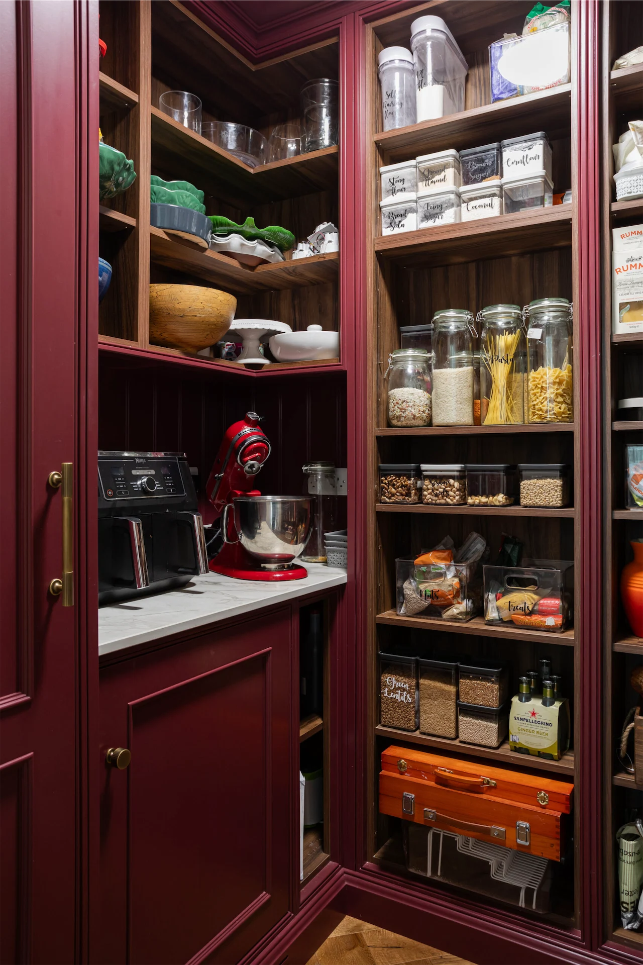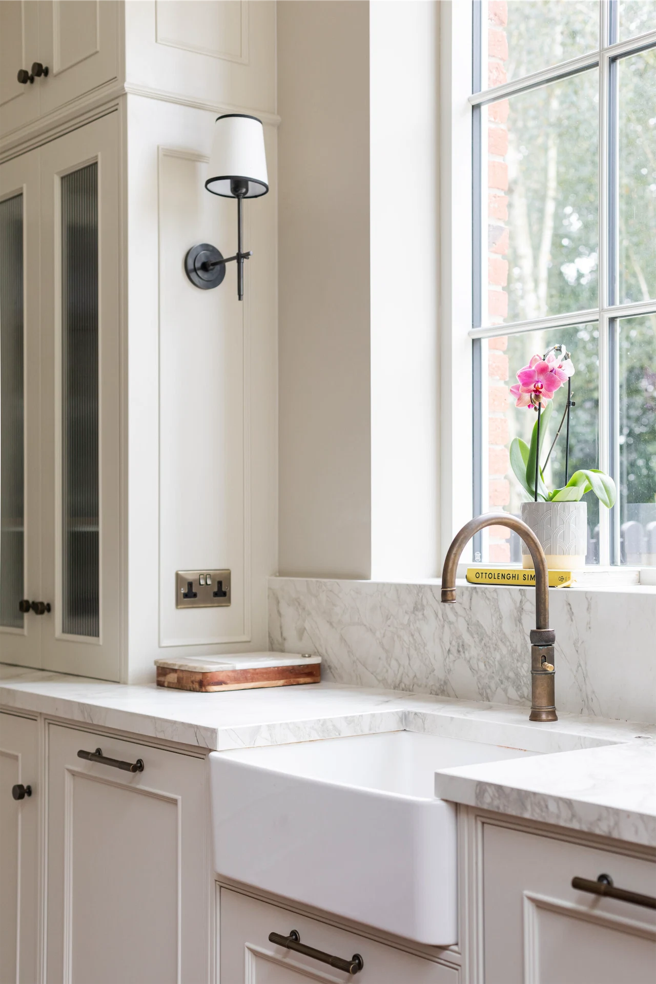 Beaded in frame cabinetry was installed throughout the kitchen and pantry to ceiling height, hand-painted in Farrow and Ball’s subtle Shaded White. An oversized seamless island, with the same handcrafted beaded slip door style, is painted in Farrow and Ball’s Preference Red. Antique brass hardware is by Armac Martin and the cherry on top, the beautiful Dekton Portum worktop and extended backsplash.