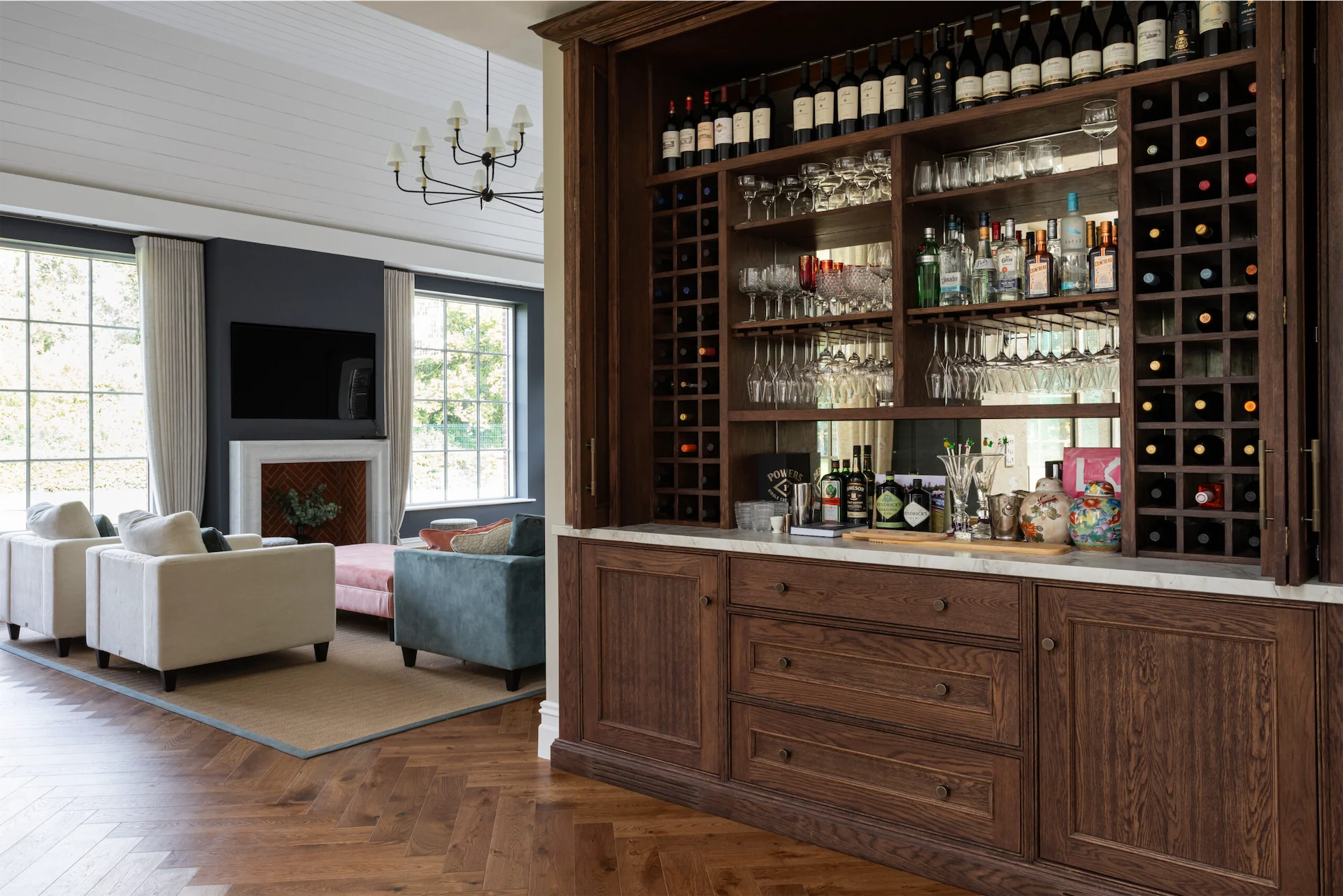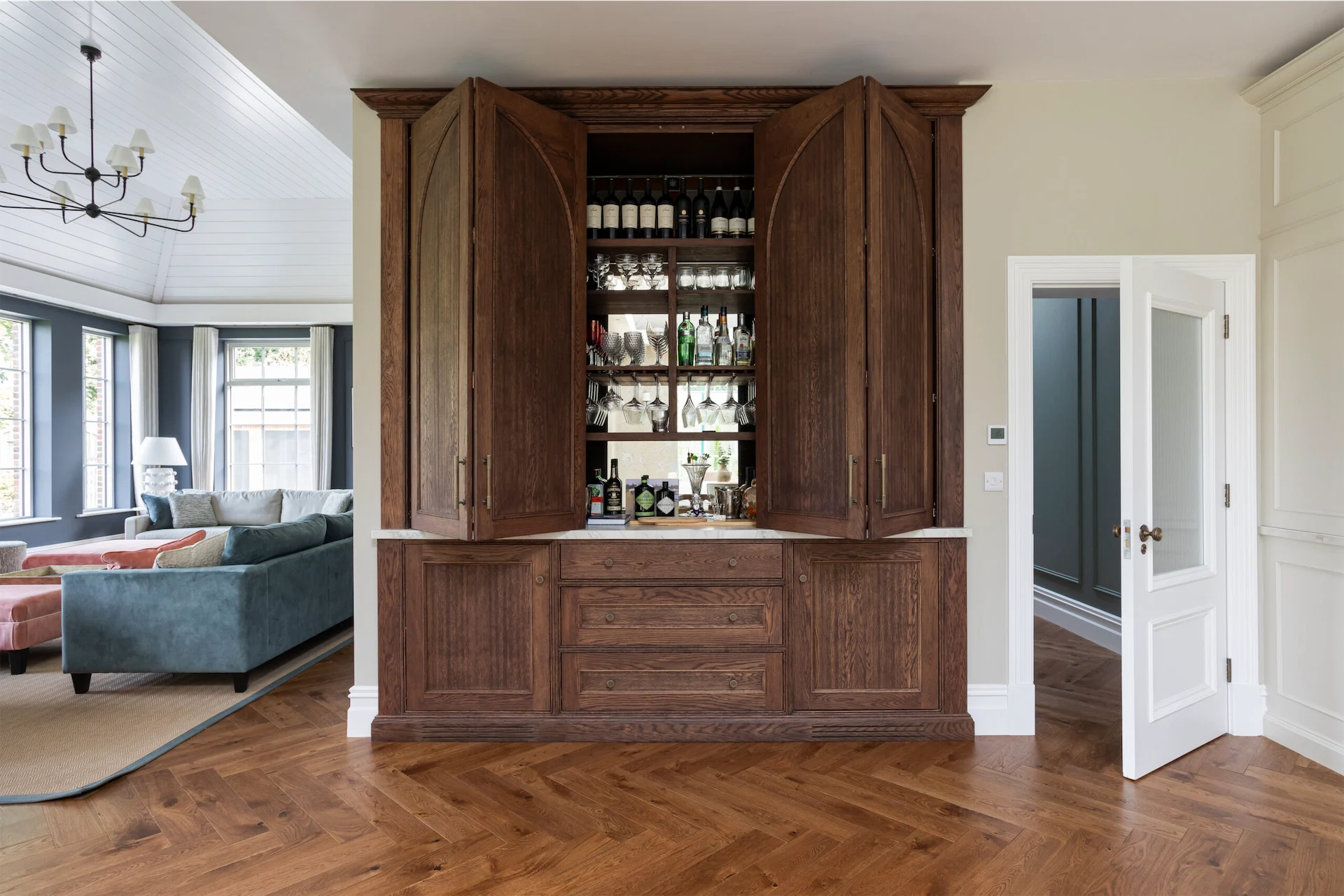 By all accounts, the impressive bar crafted by Shiels in solid oak with a chocolate oil stain is the talking point. Nods to the original house adorn the feature cabinetry, with arched bifold doors in keeping with the style of the beautiful front entrance door and the use of original stained glass panels inside tell the tales of bygone years. It’s an exceptional piece of Irish craft.