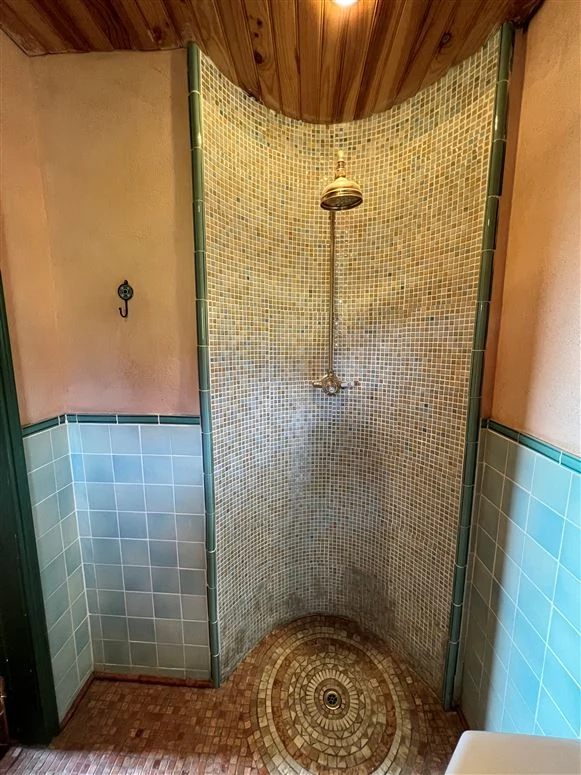 In the case of the studio, the living room is located within the round room which is a very interesting feature. In addition, there is a study / lounge, bedroom and bathroom. Again, beautiful mosaic work and stained glass windows are to be enjoyed throughout.