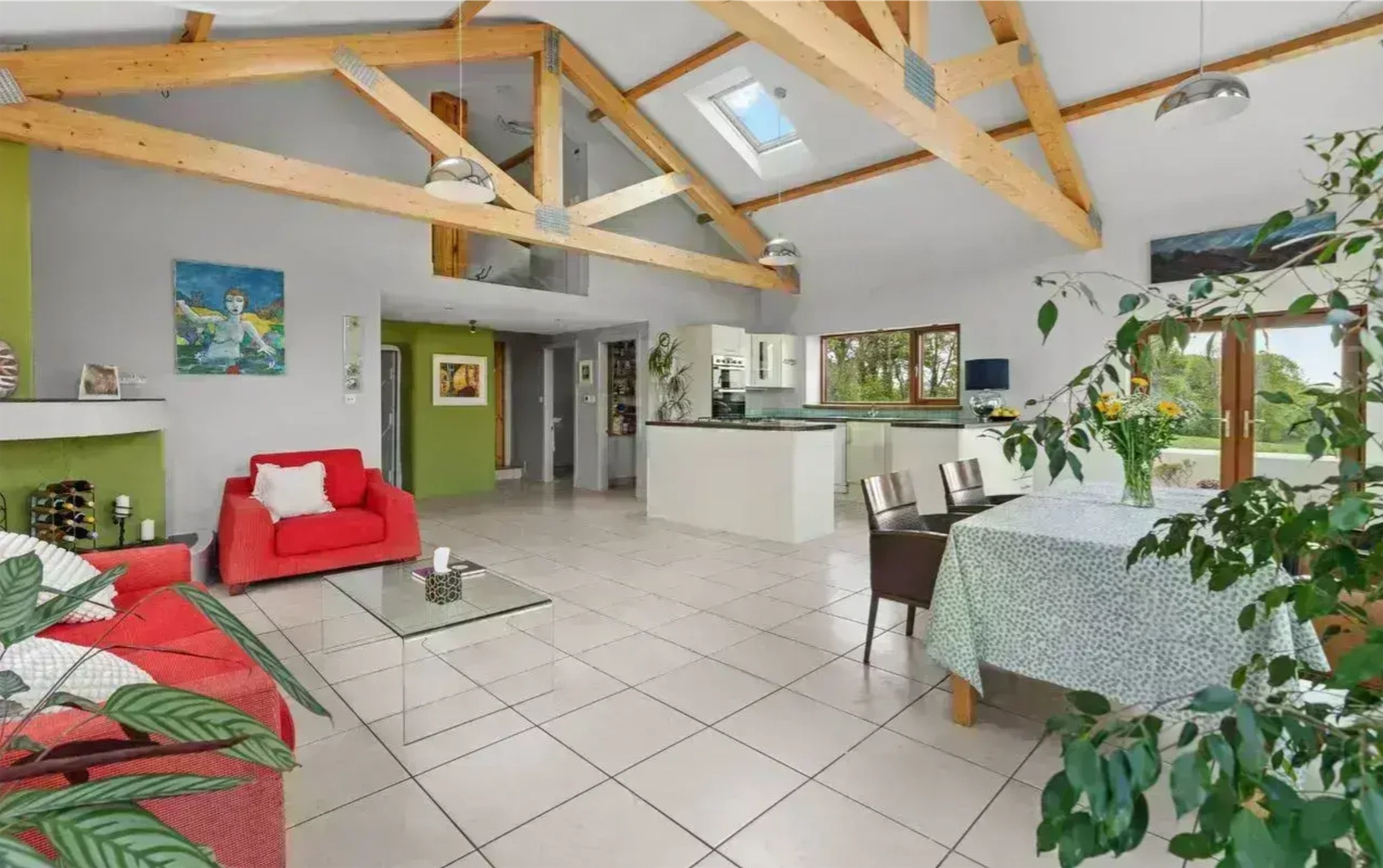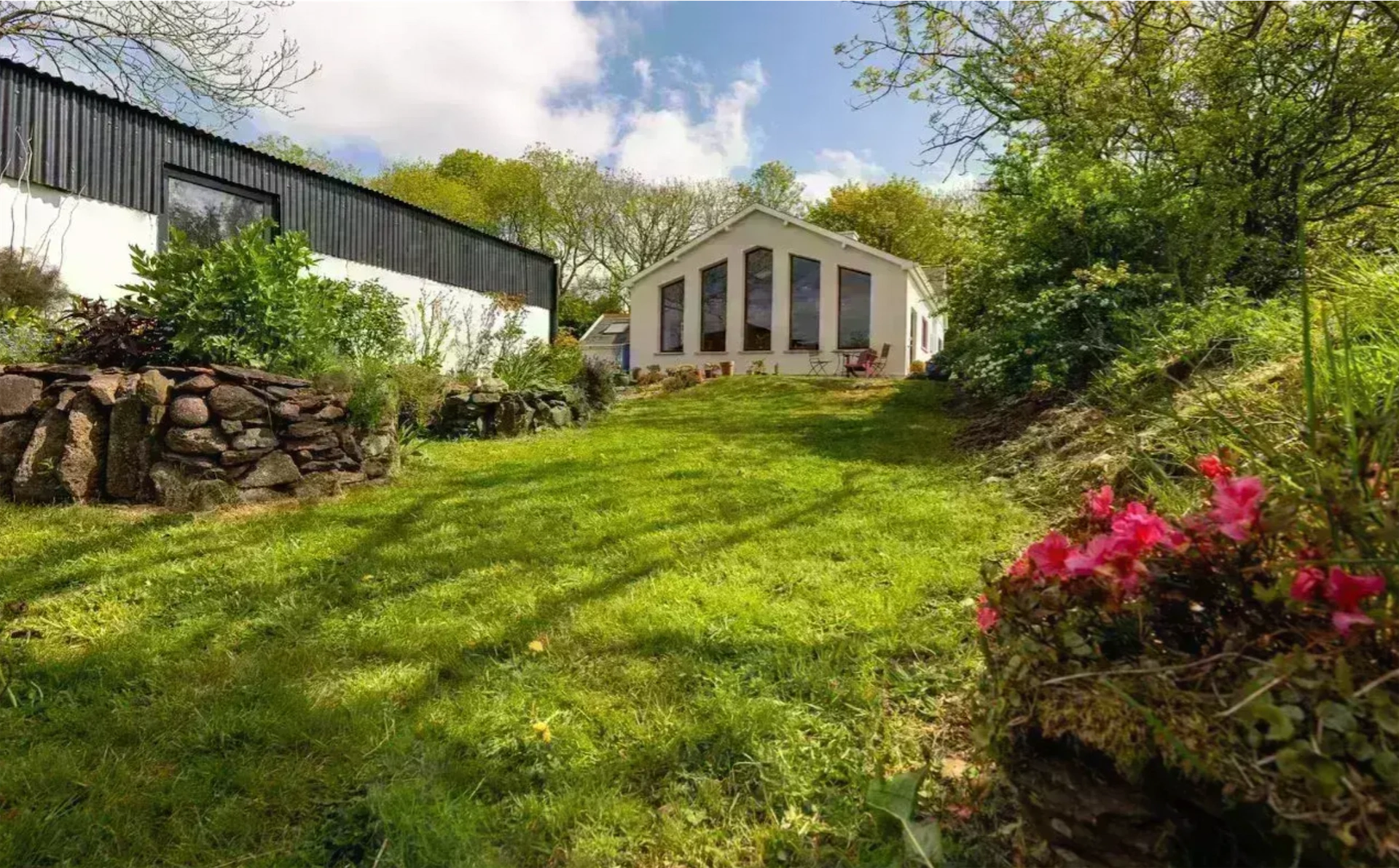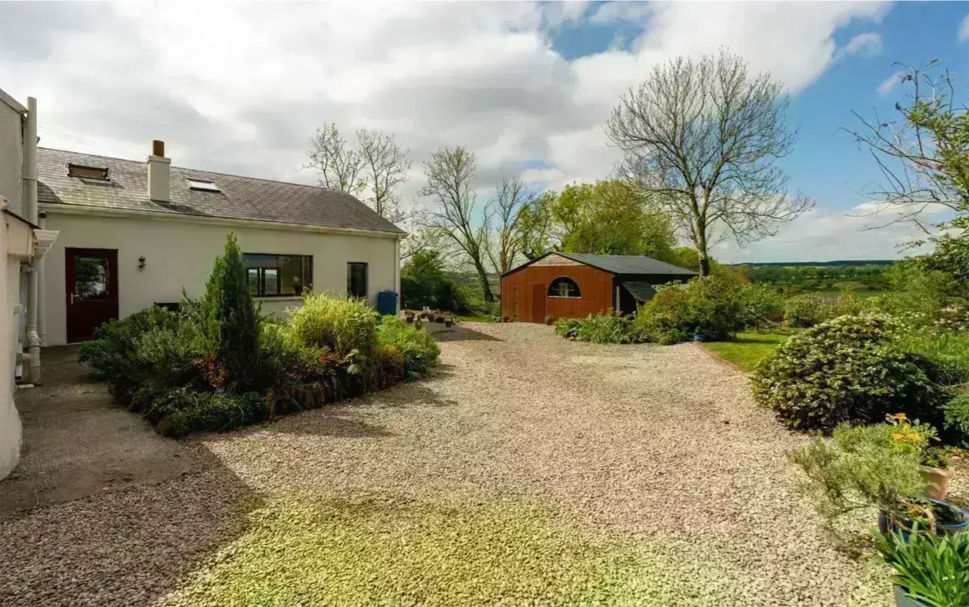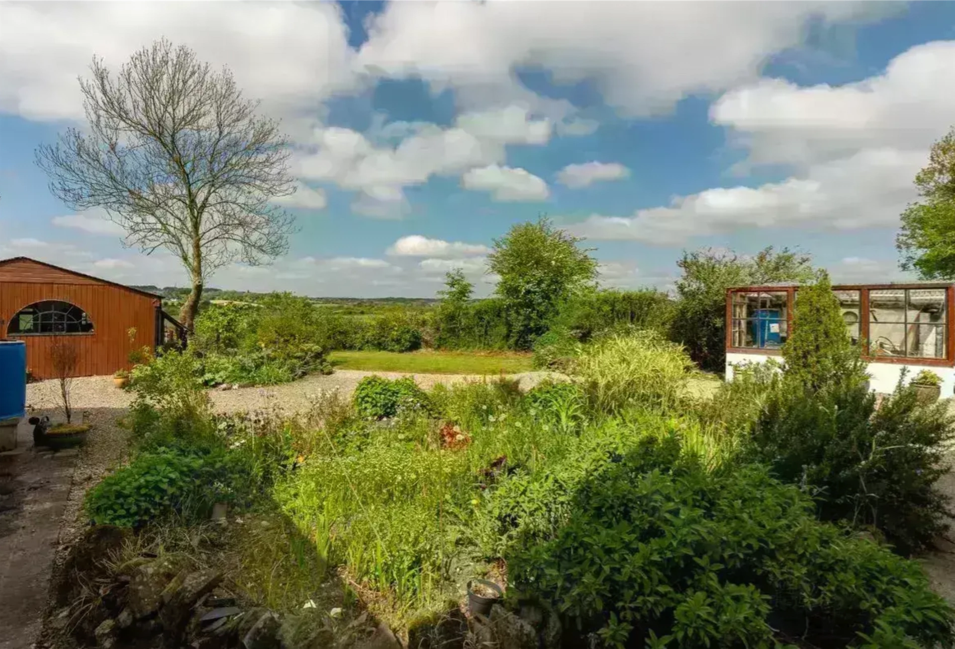 Set on around 0.6 acres, this home has a peaceful location, with the garden featuring raised beds, native trees, a vegetable garden and two greenhouses. There are also several outbuildings, including a grass-roofed studio and a large workshop. The home also features an air source heat pump and solar panels.