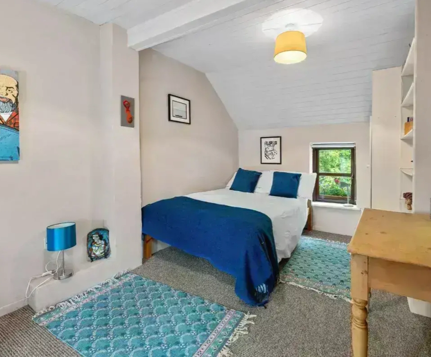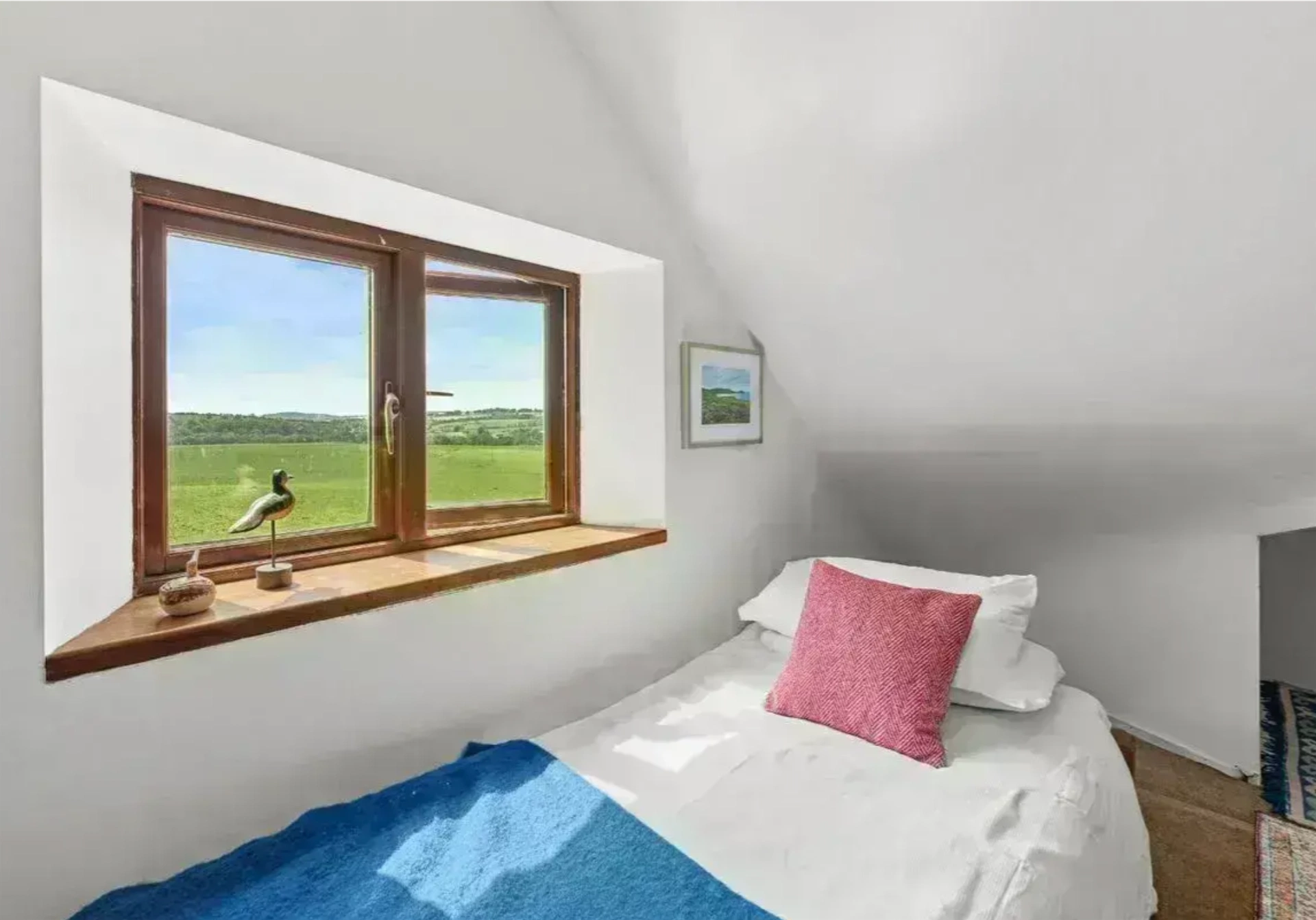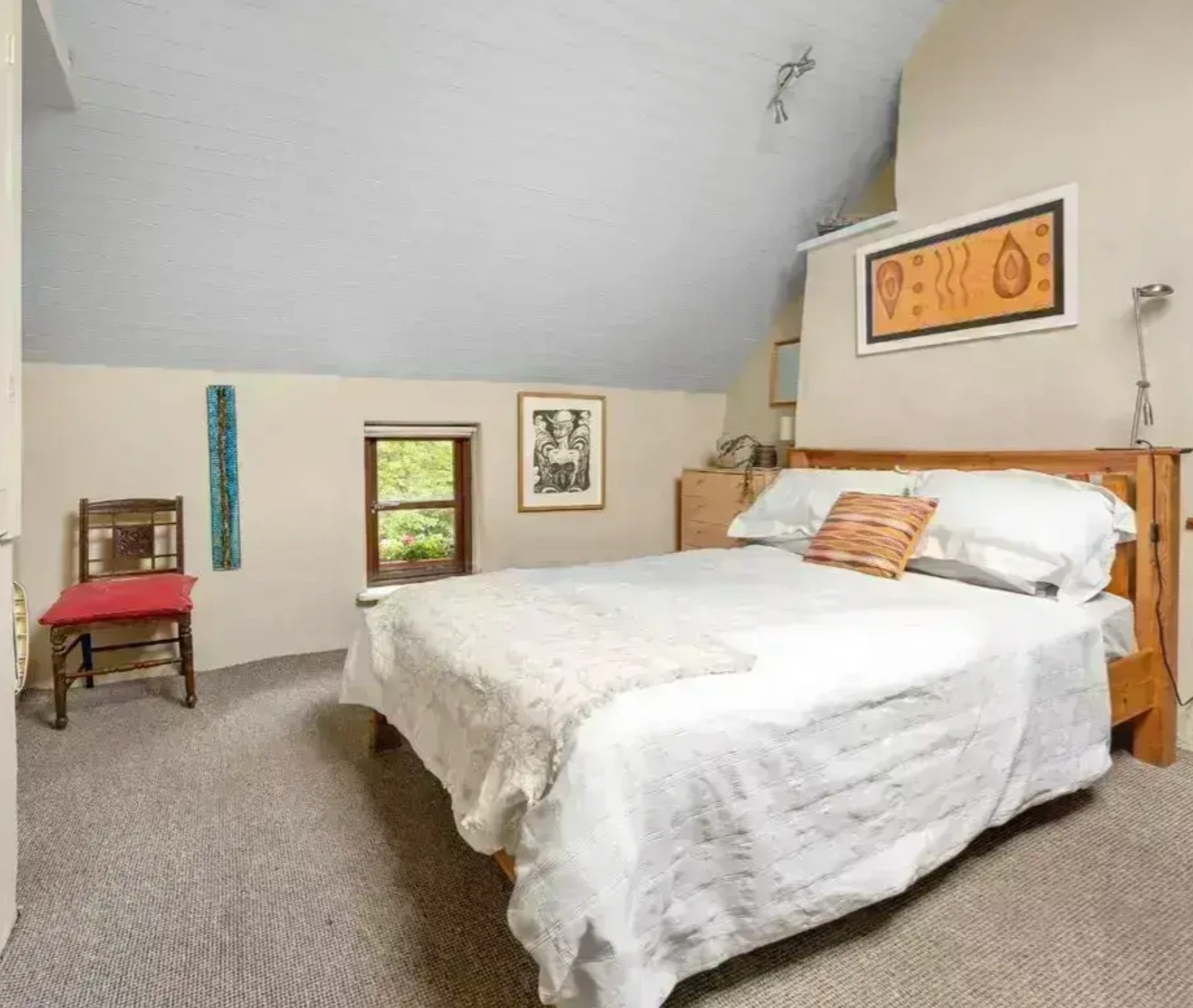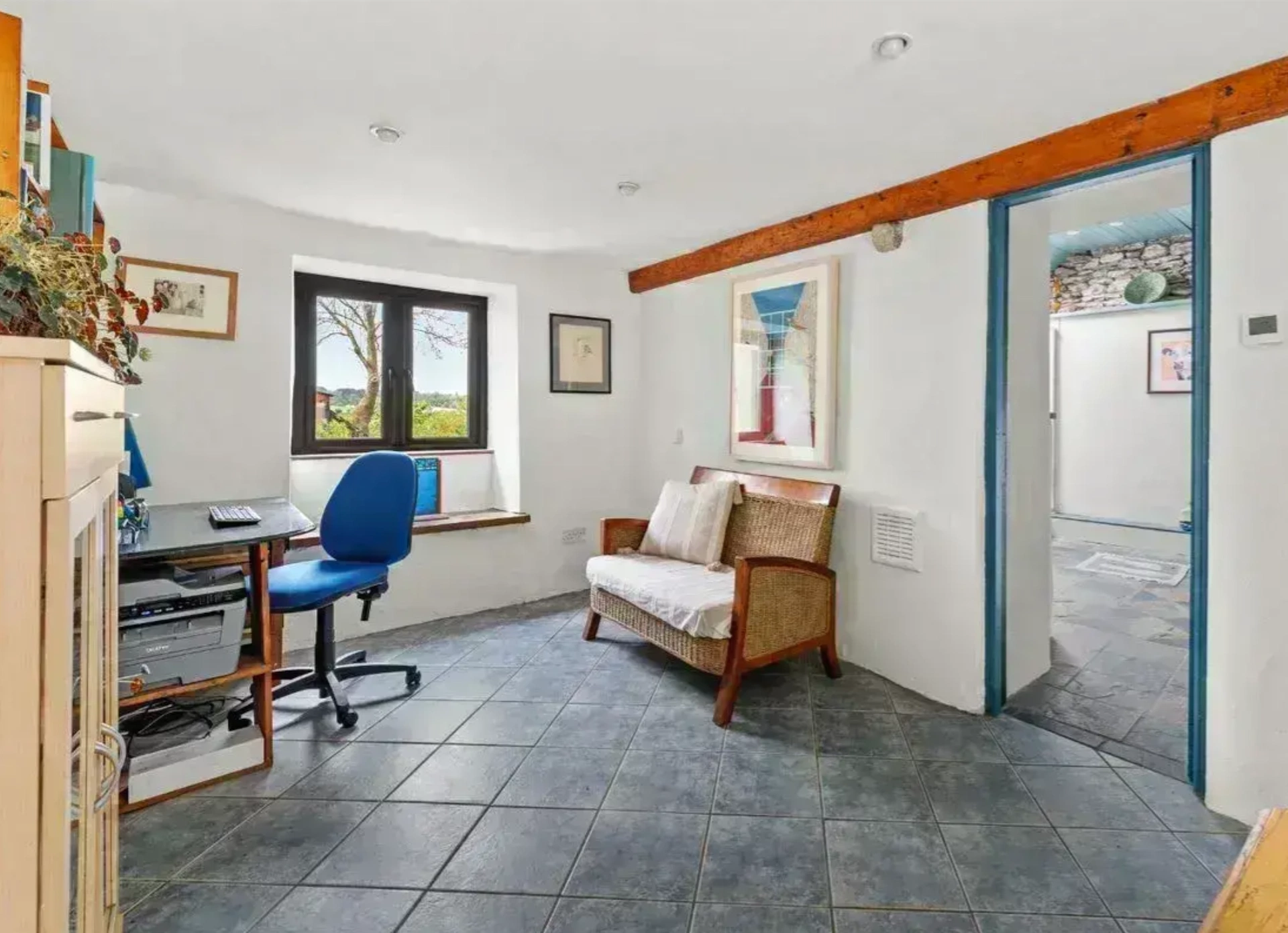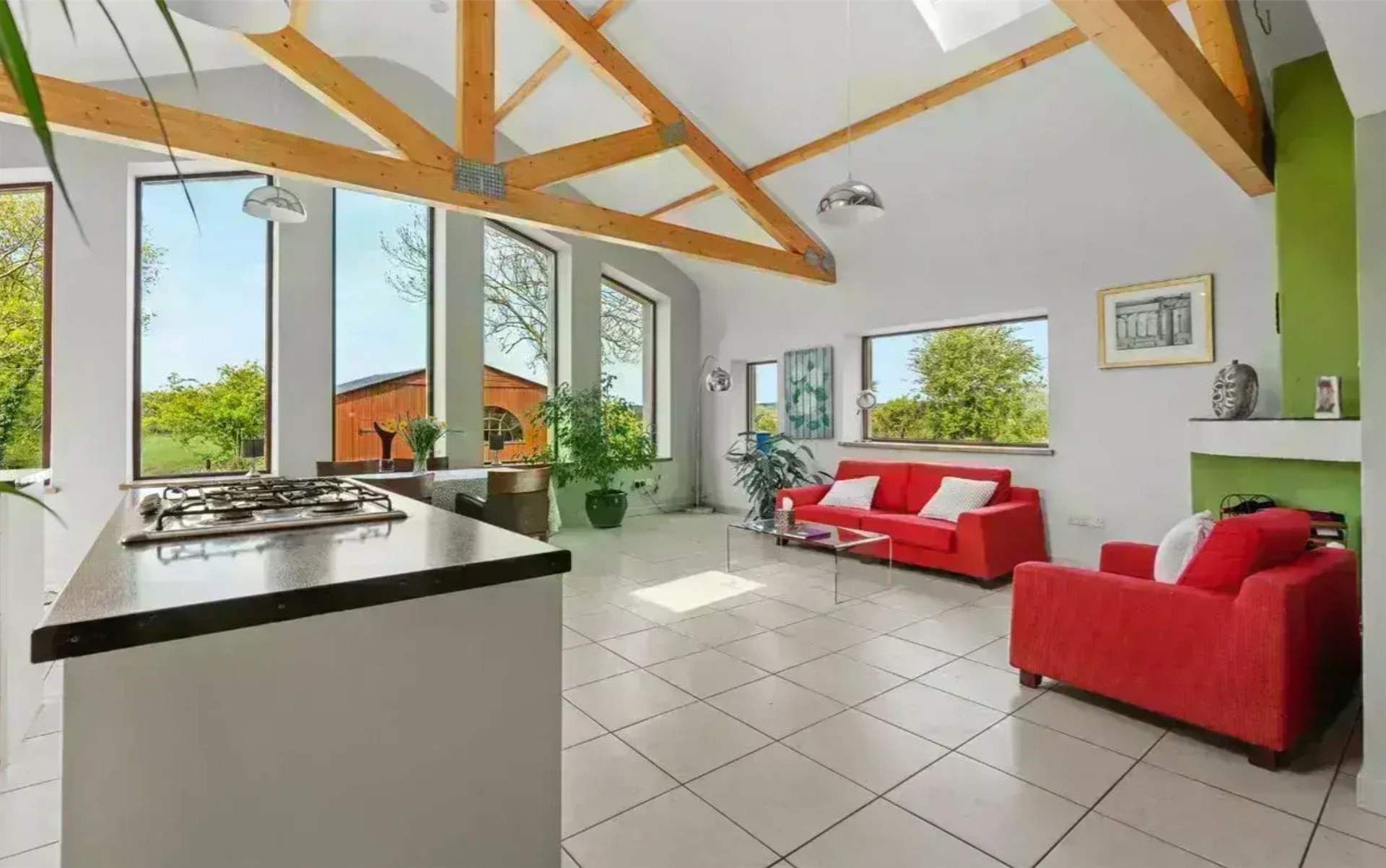 Set on around 0.6 acres, this home has a peaceful location, with the garden featuring raised beds, native trees, a vegetable garden and two greenhouses. There are also several outbuildings, including a grass-roofed studio and a large workshop. The home also features an air source heat pump and solar panels.