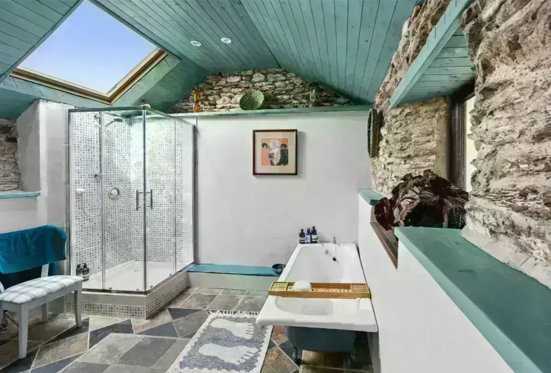 With a high vaulted ceiling, exposed timber beams, large windows and double doors that lead to the garden, it feels spacious, and is full of natural light. The modernity of this space sits alongside the home’s history and character, with the ground floor bathroom featuring exposed stone walls, as well as a cast iron bath.