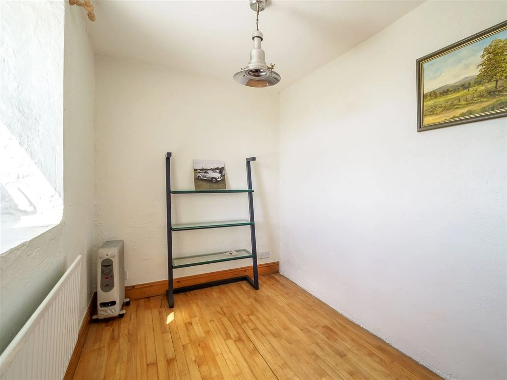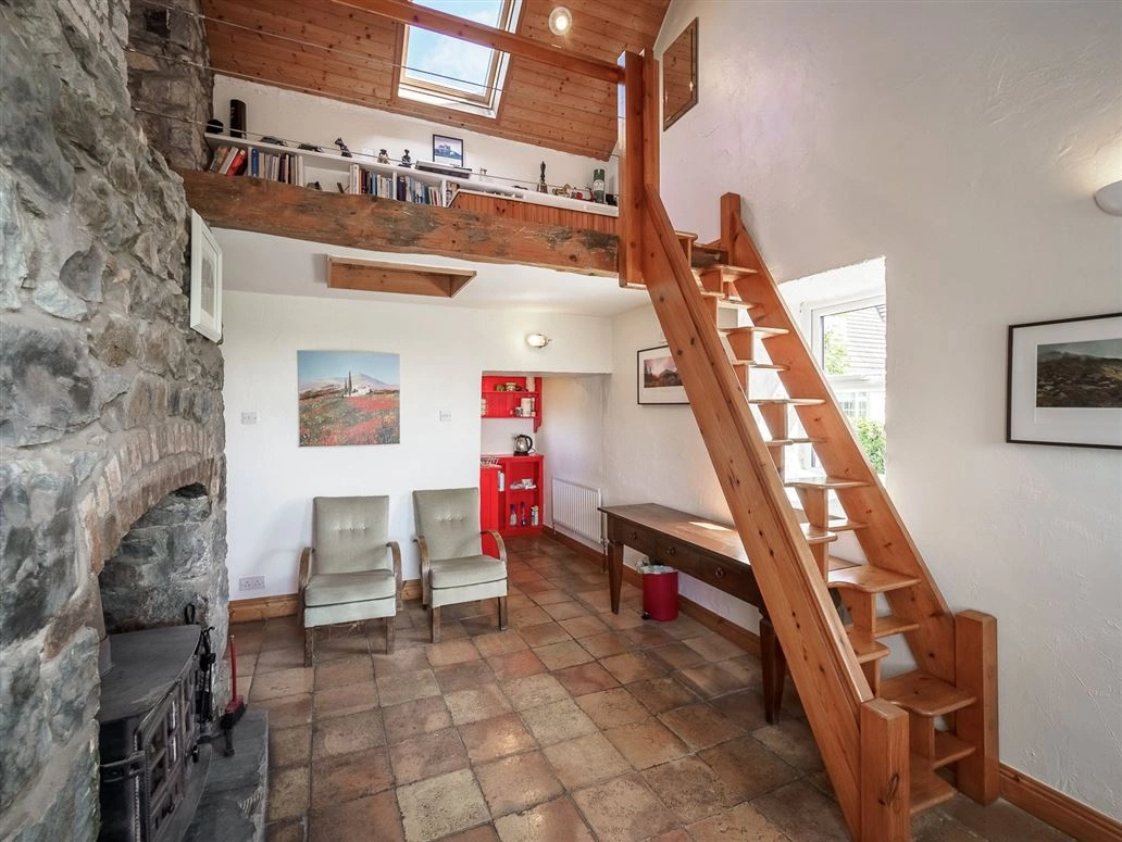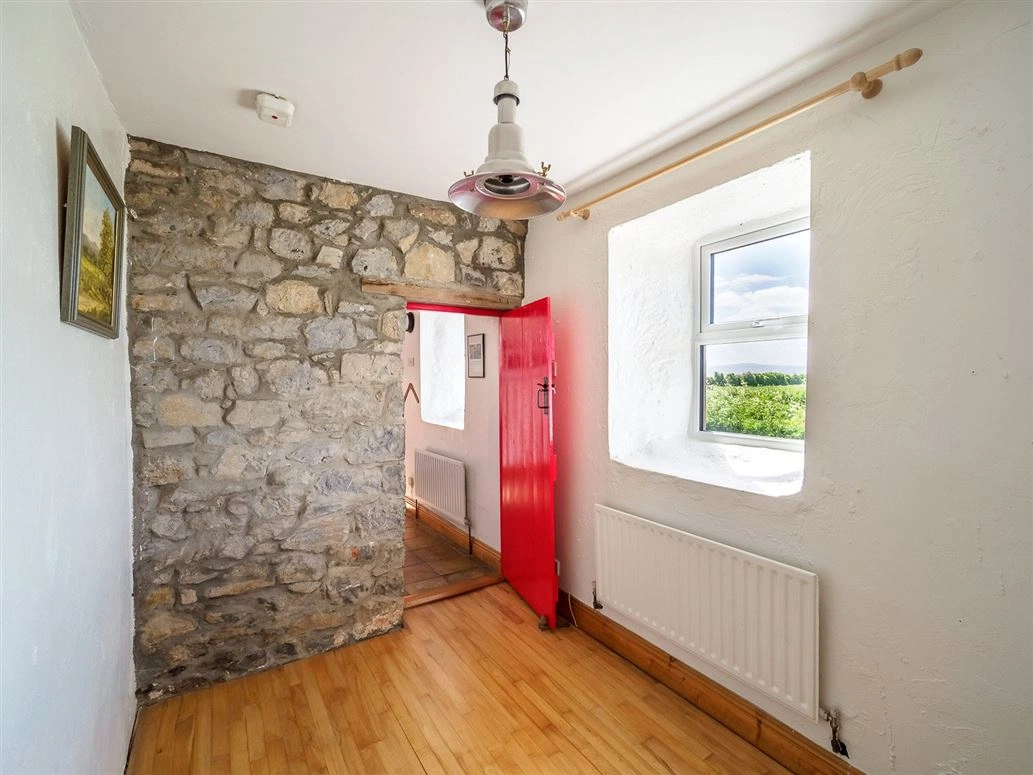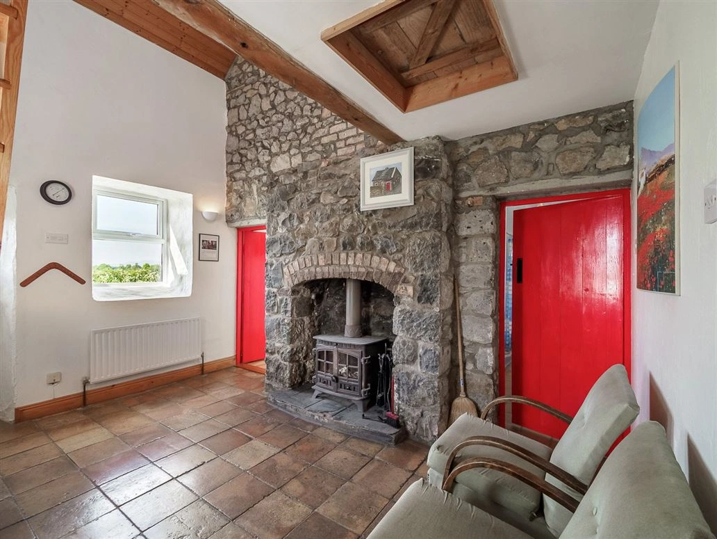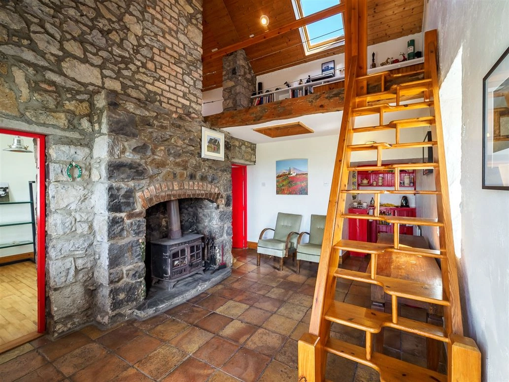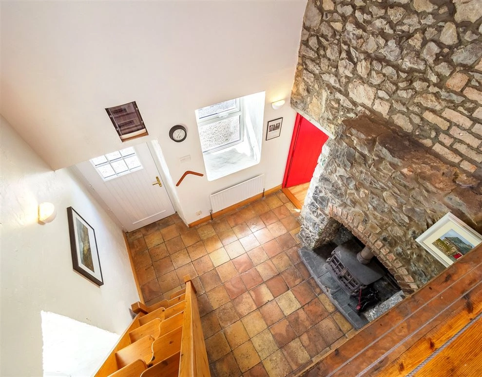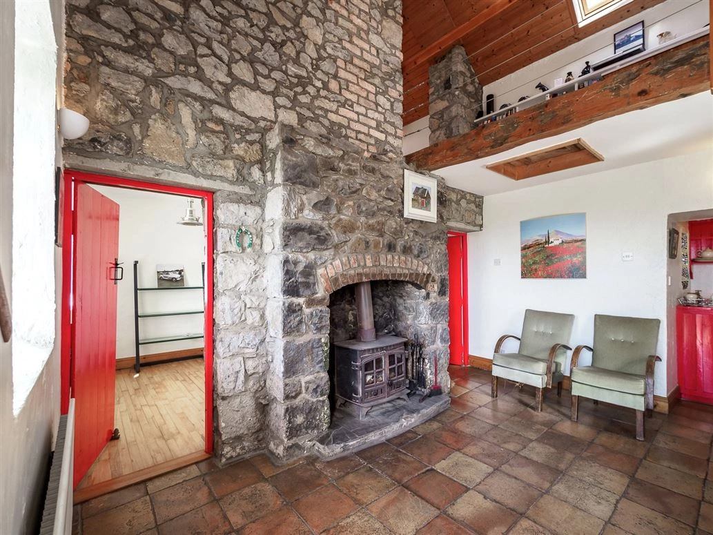 The front door opens onto a tiled hallway/living room/kitchen. Traditional stonework lines one wall which melds into a large fireplace. A solid fuel stove – used to heat the radiators – sits at its hearth. Triple glazed PVC windows have also been fitted throughout the cottage to help retain heat.