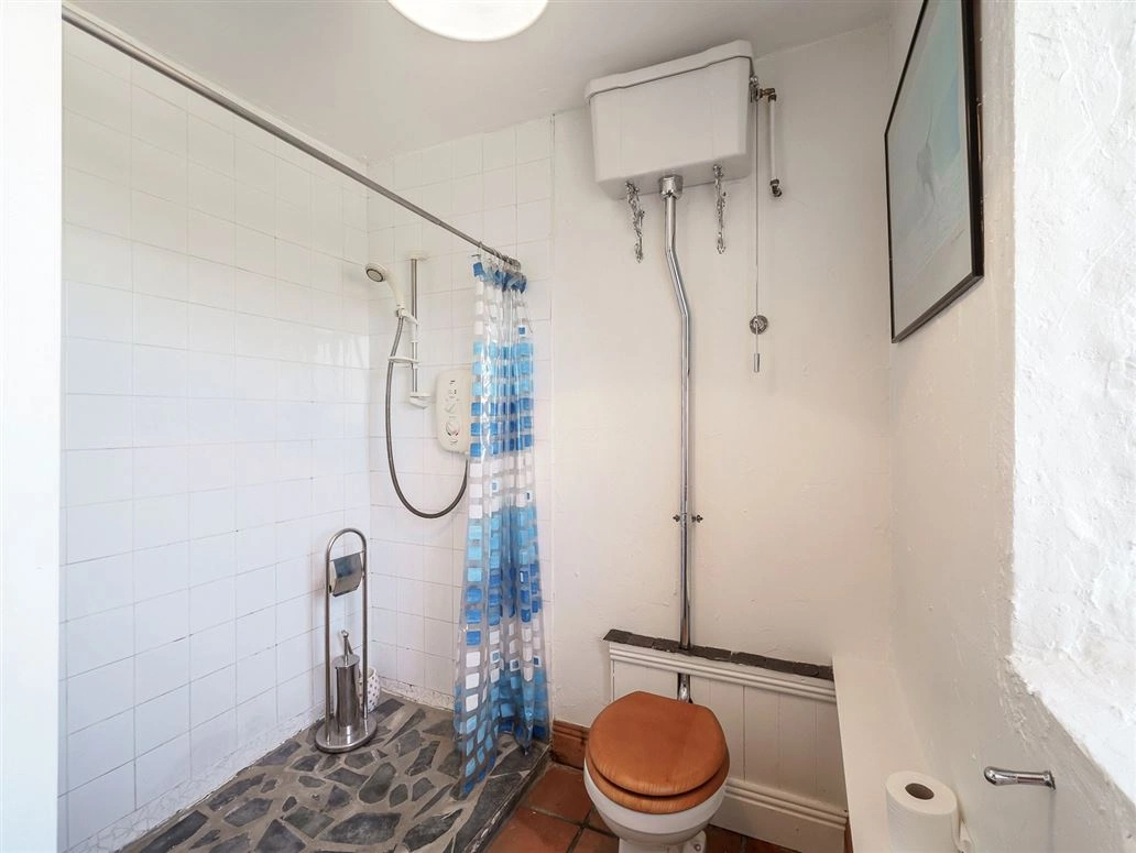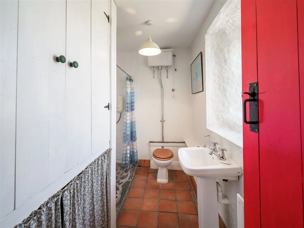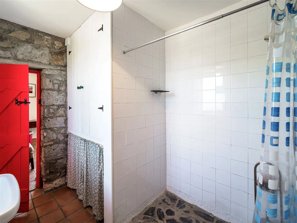 The family bathroom and one of the two bedrooms can be found on this level. The same stonework continues in both rooms – making for striking statement features in each. Tiles line both the floor and the wall in the bathroom, which also has wooden shelving and a curtained cubby hole for storage.
