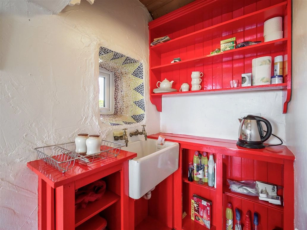 The kitchen is a small nook to the back of the room, with a Belfast sink and brightly painted presses. An unusual mosaic feature borders the one small window.