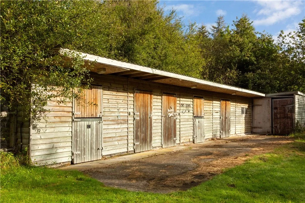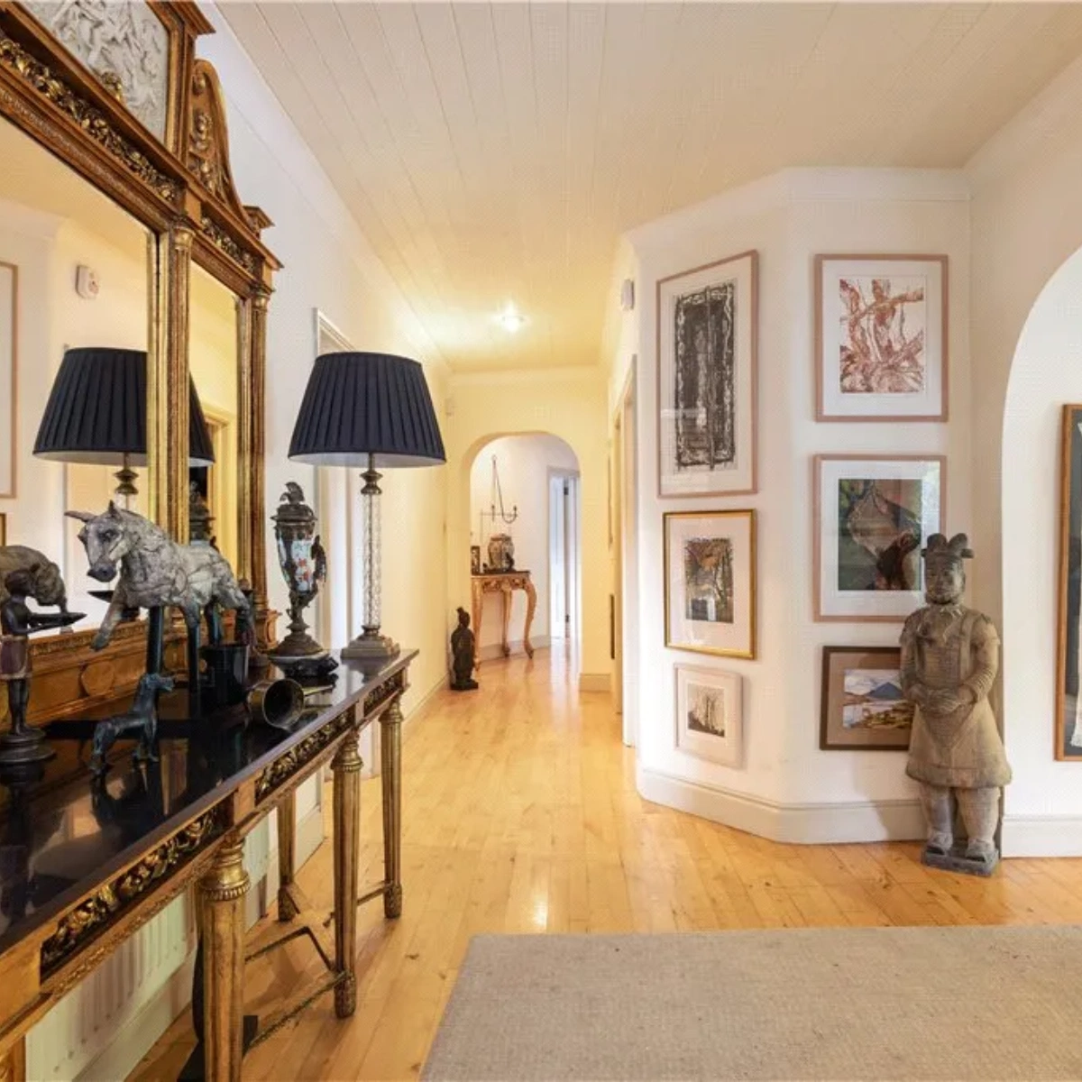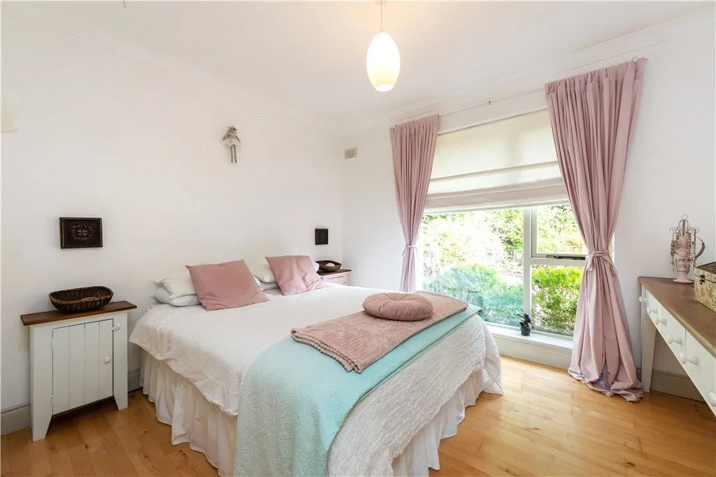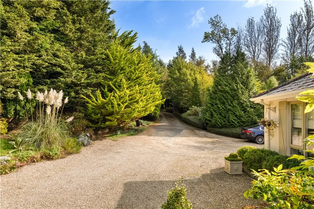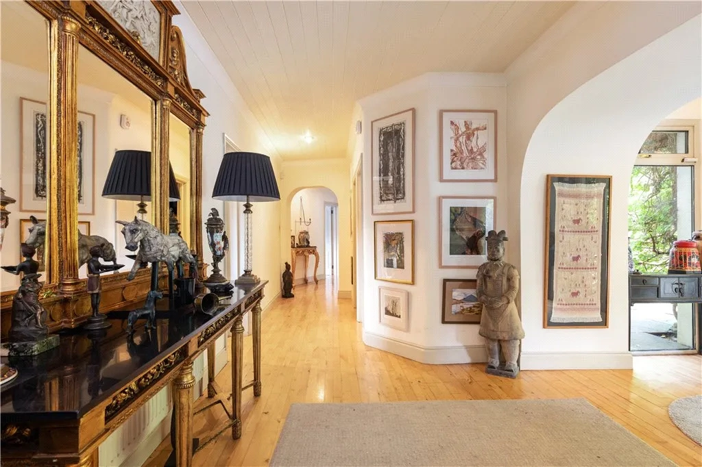 Outside, the meticulously landscaped gardens feature mature trees and shrubs, along with a hidden garden with a serene pond. The lower level is equipped with four stables and a tack room, accessible from the main house or a secondary entrance from the main road. Here, you’ll also find a riding arena and access to a tributary that connects to the River Dargle – ideal for watersport enthusiasts.