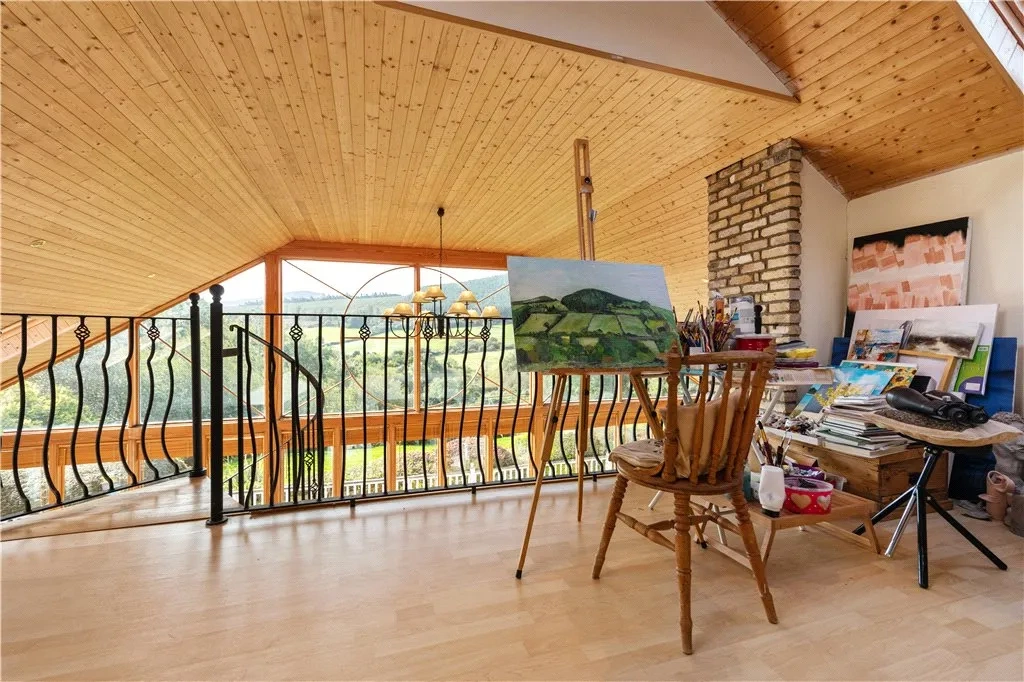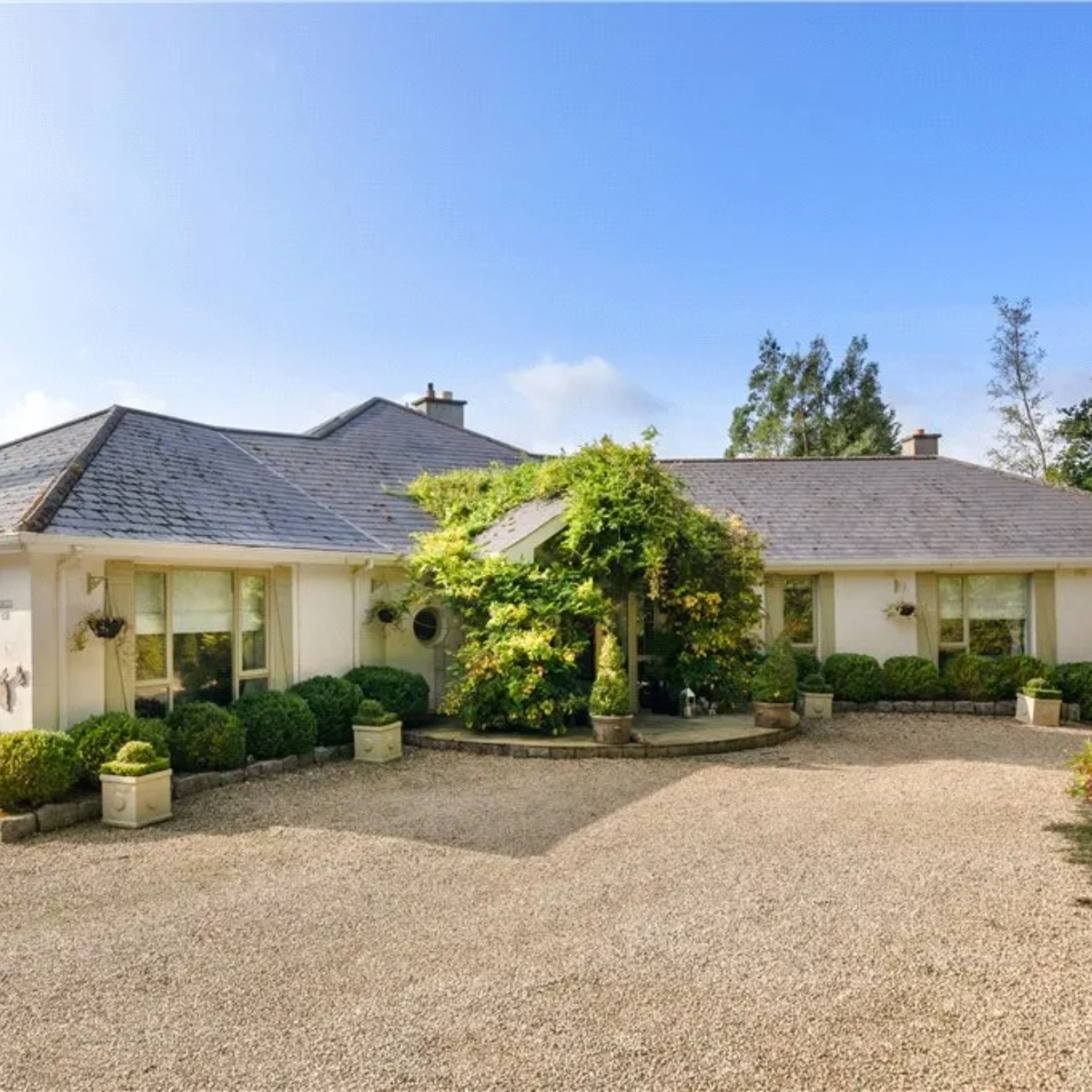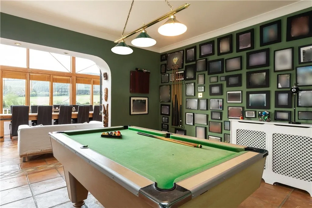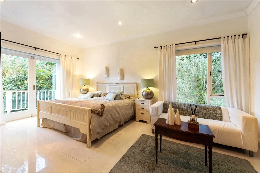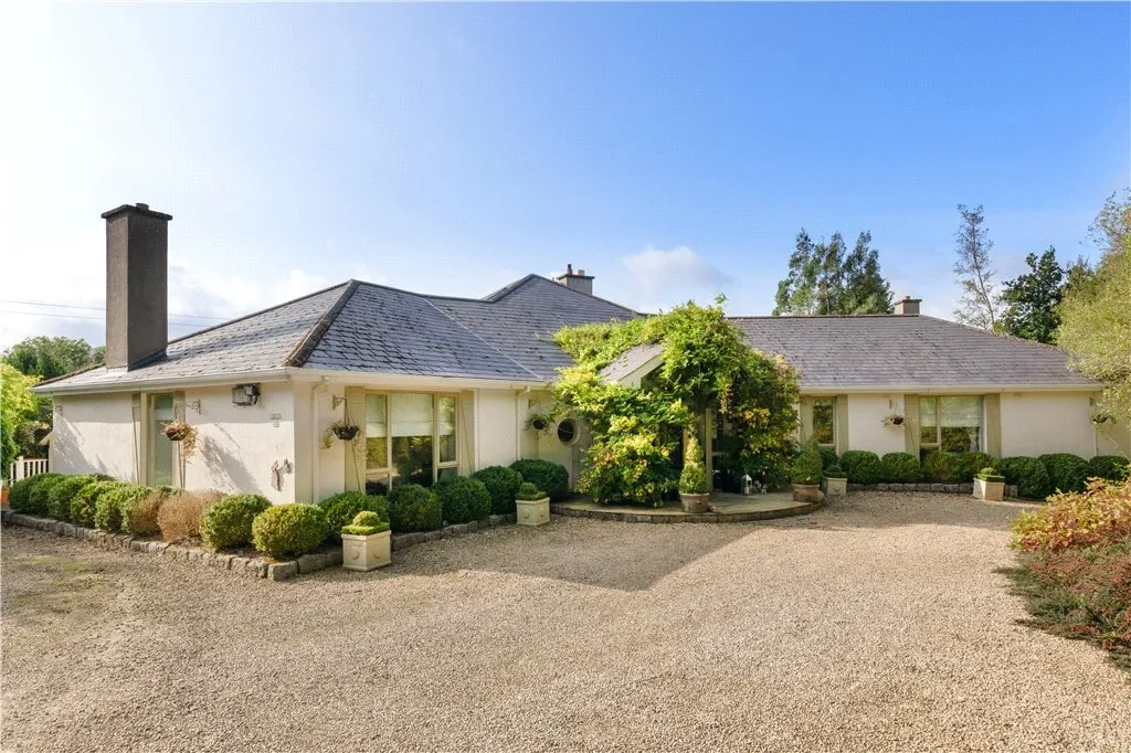 Outside, the meticulously landscaped gardens feature mature trees and shrubs, along with a hidden garden with a serene pond. The lower level is equipped with four stables and a tack room, accessible from the main house or a secondary entrance from the main road. Here, you’ll also find a riding arena and access to a tributary that connects to the River Dargle – ideal for watersport enthusiasts.