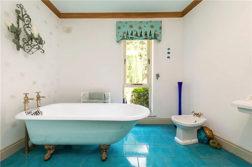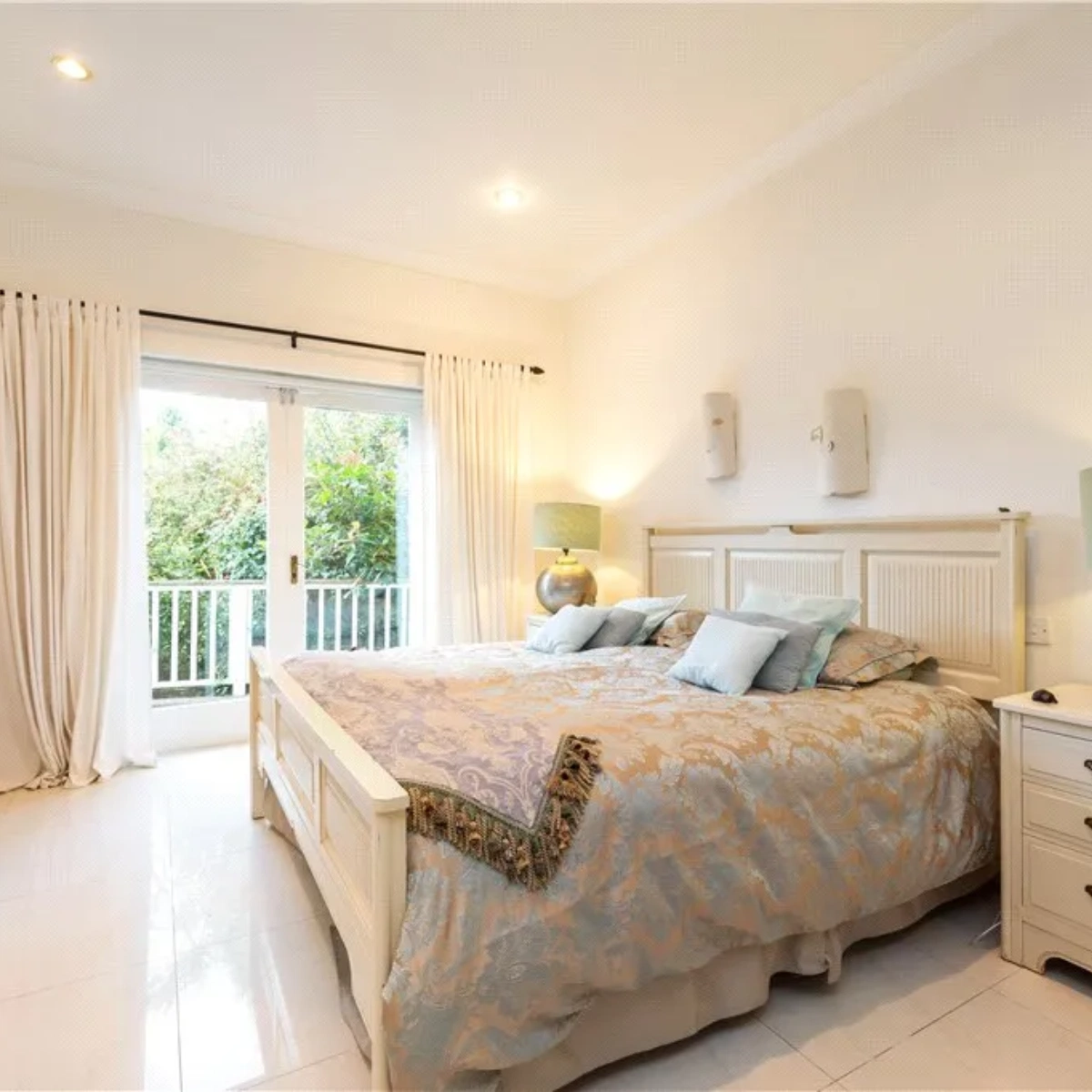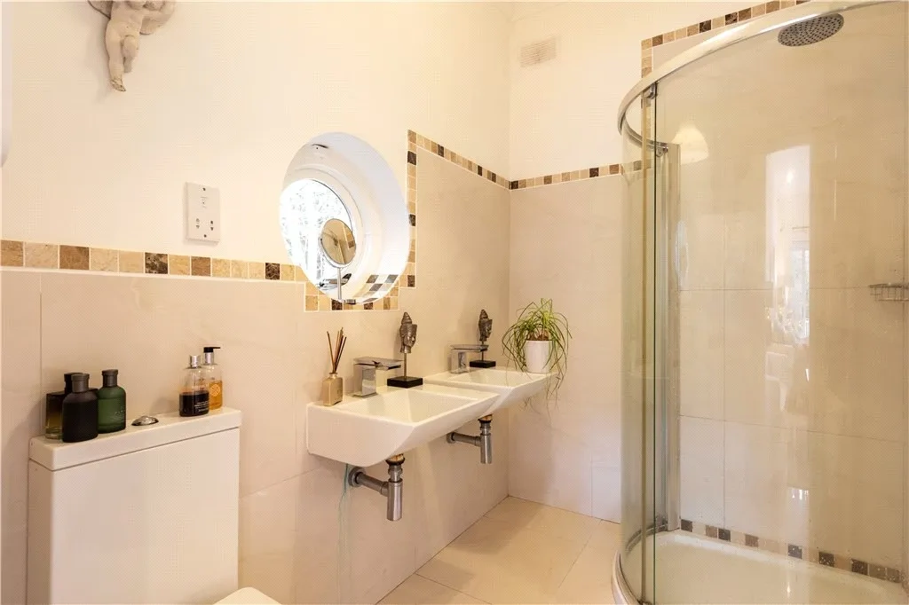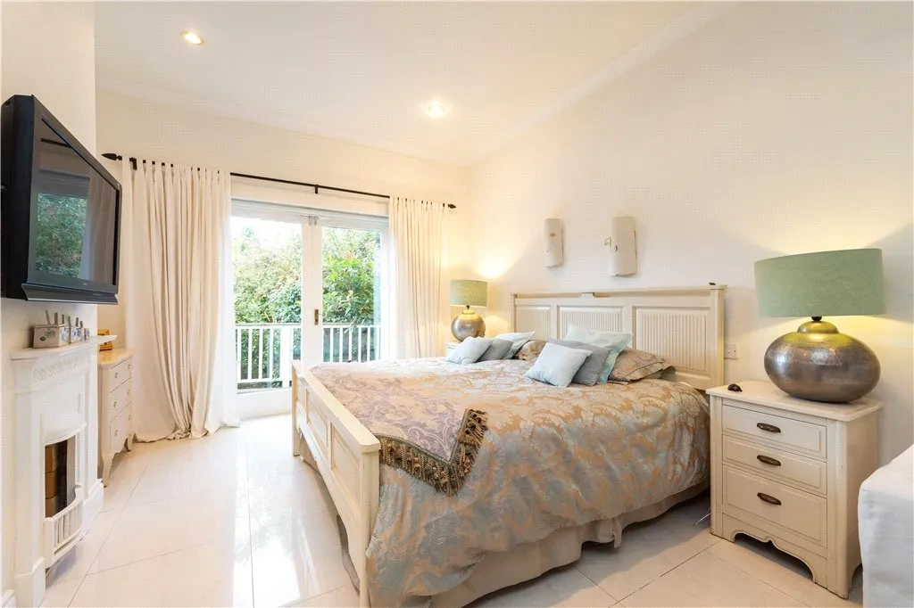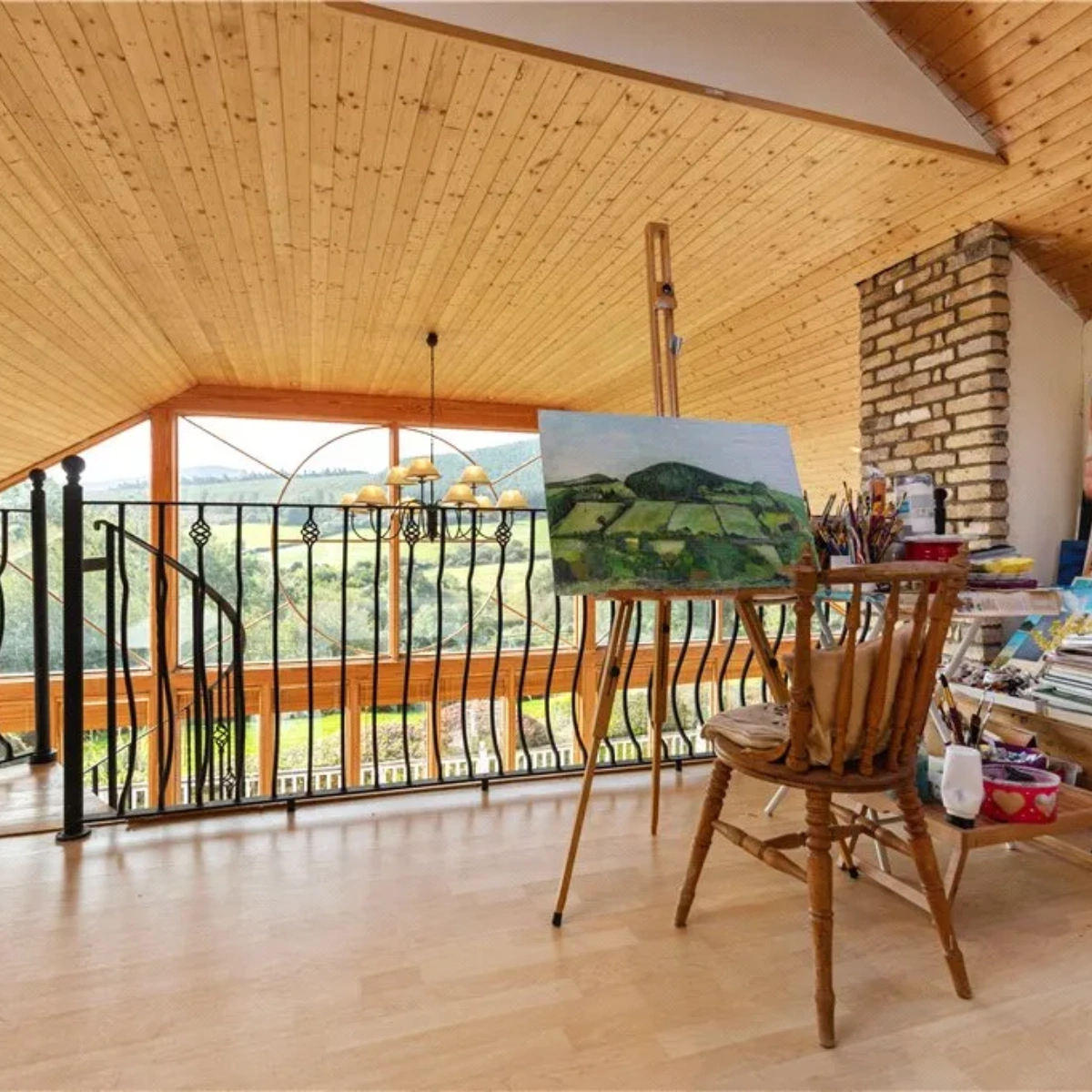 Outside, the meticulously landscaped gardens feature mature trees and shrubs, along with a hidden garden with a serene pond. The lower level is equipped with four stables and a tack room, accessible from the main house or a secondary entrance from the main road. Here, you’ll also find a riding arena and access to a tributary that connects to the River Dargle – ideal for watersport enthusiasts.