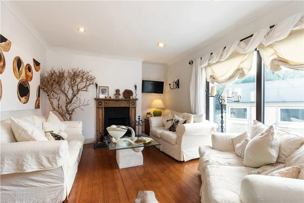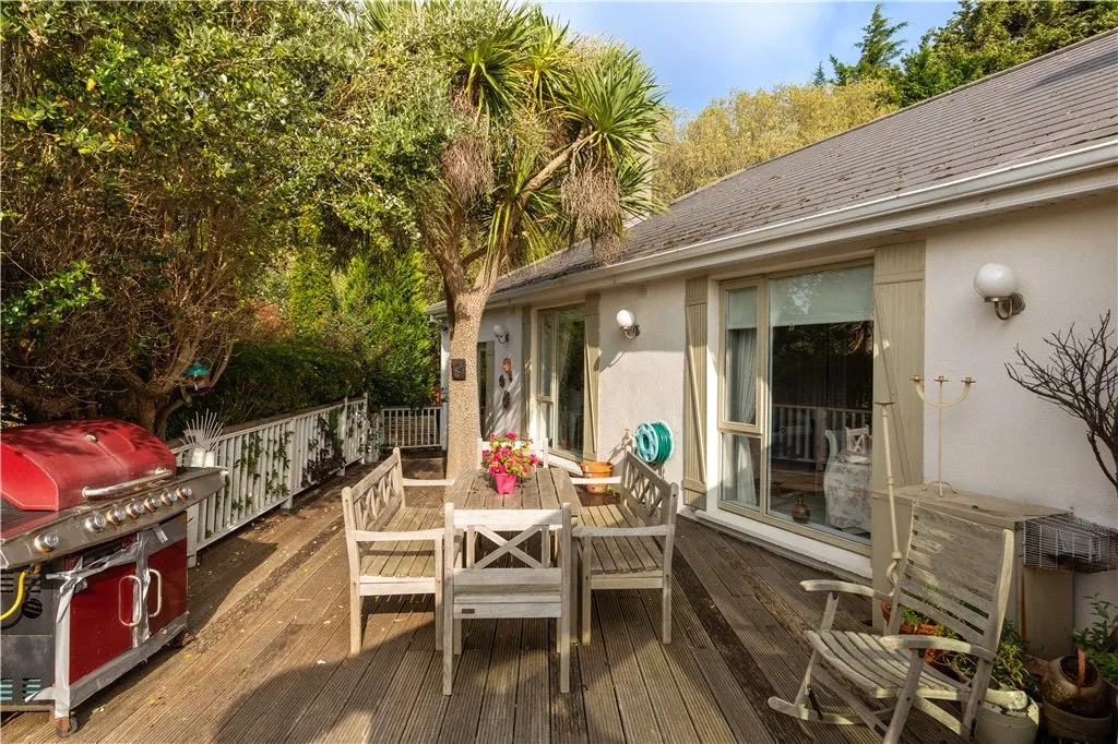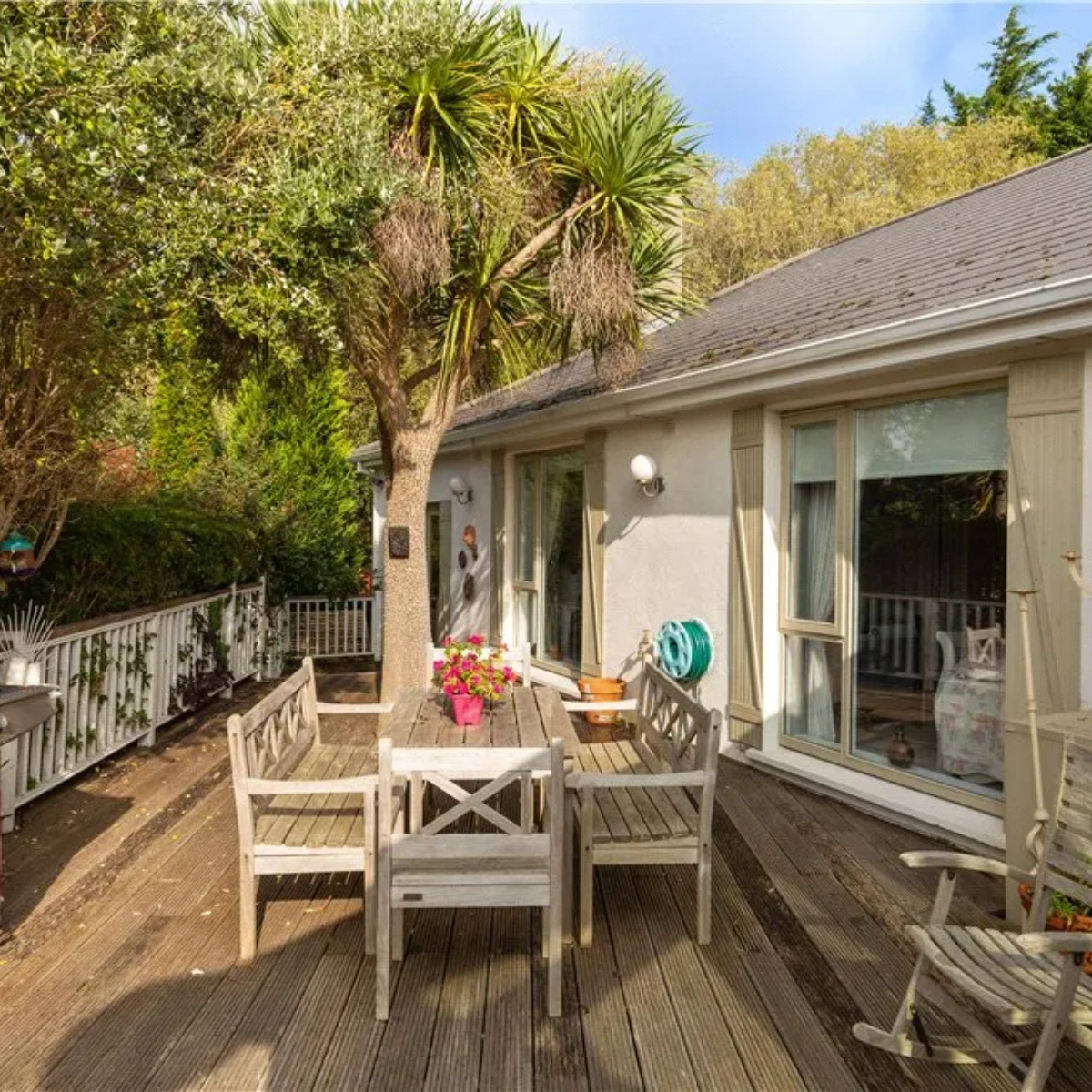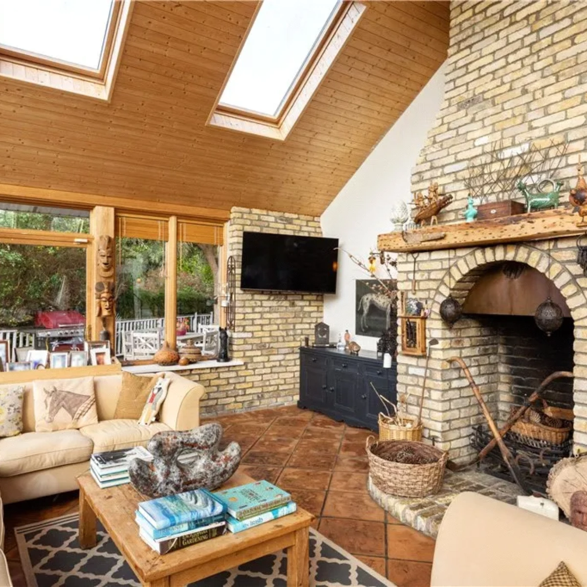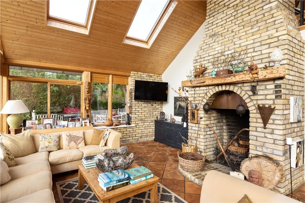 Constructed with quality craftsmanship in 1992, standout features include an expansive picture window found along the entire back wall of the home, a solid open fireplace adorned with reclaimed brickwork, a country-style oak shaker kitchen with a built-in butcher block, and a Belling dual-fuel oven with an attached pantry/utility room. Numerous patio double doors lead to the wraparound hardwood decking area – the perfect spot for al fresco dining when the weather allows.
