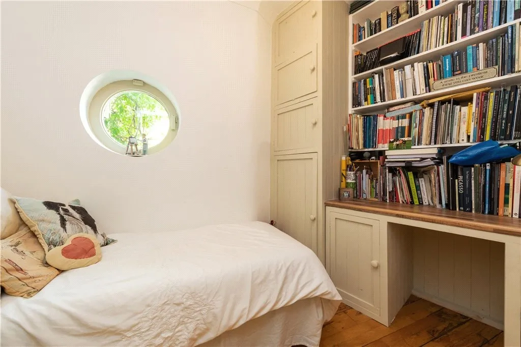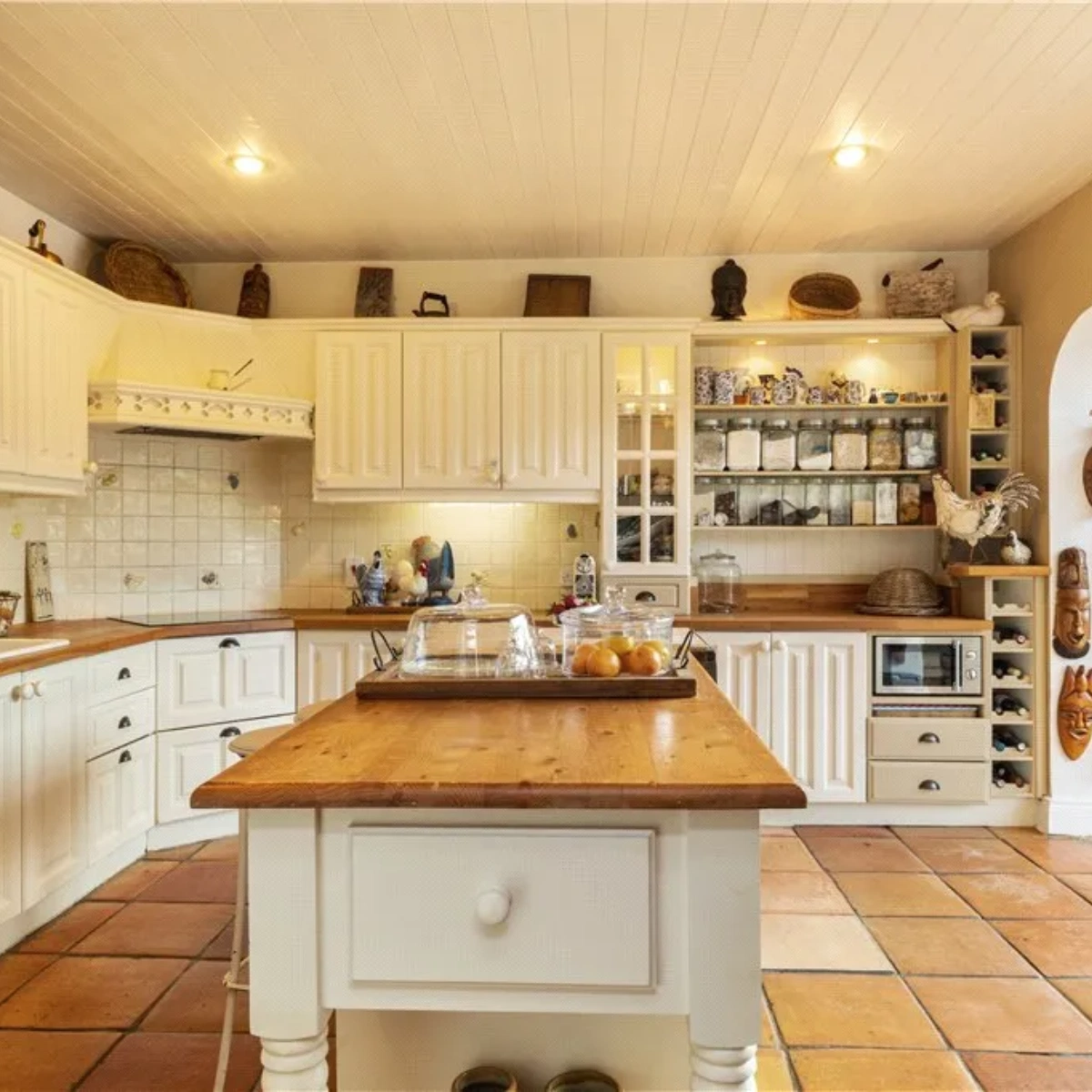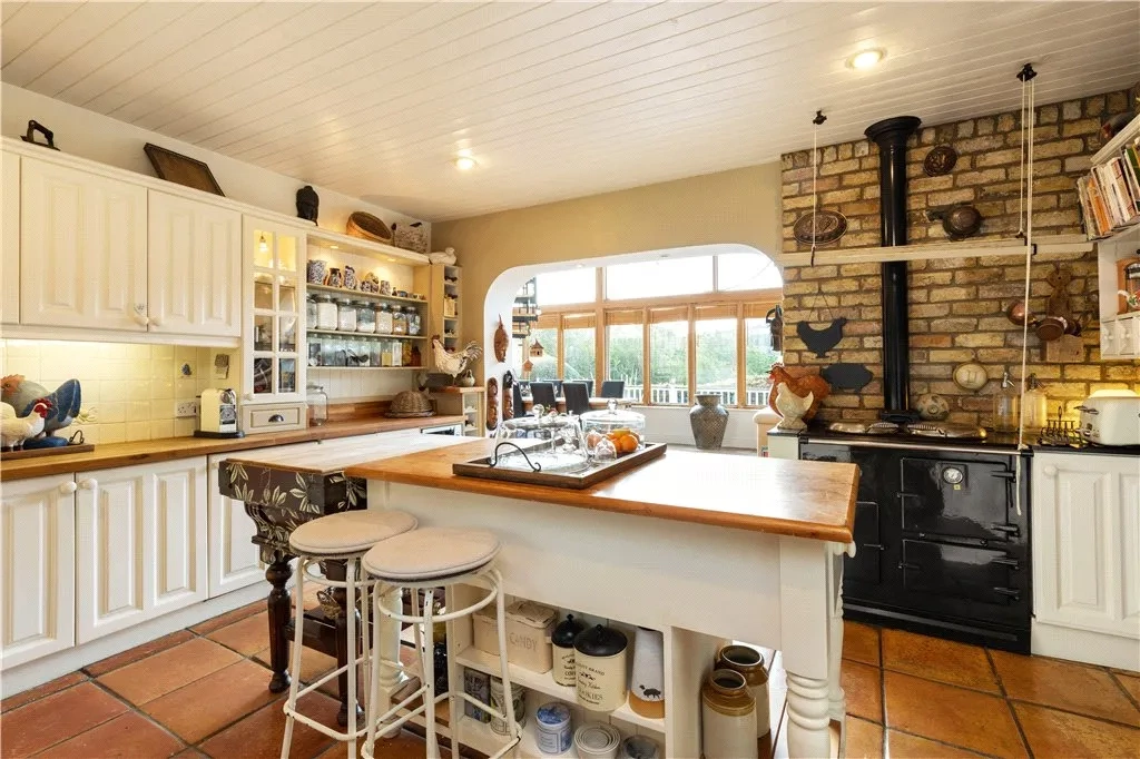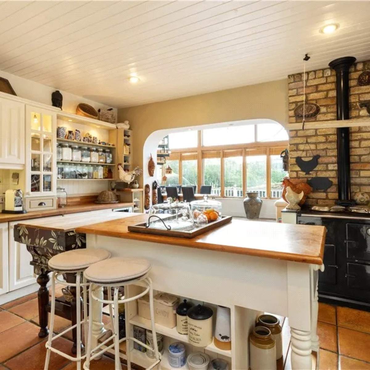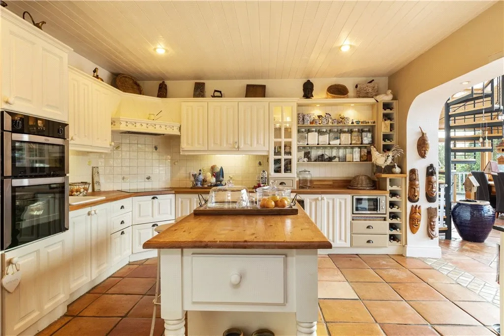 The true heart of the home is the central kitchen, however, seamlessly connected to the family room and a conveniently located utility room. Cream-coloured cabinets line the wall, while a wooden-topped island with seating stands in the middle of the room. Appliances include an oven, microwave and AGA.