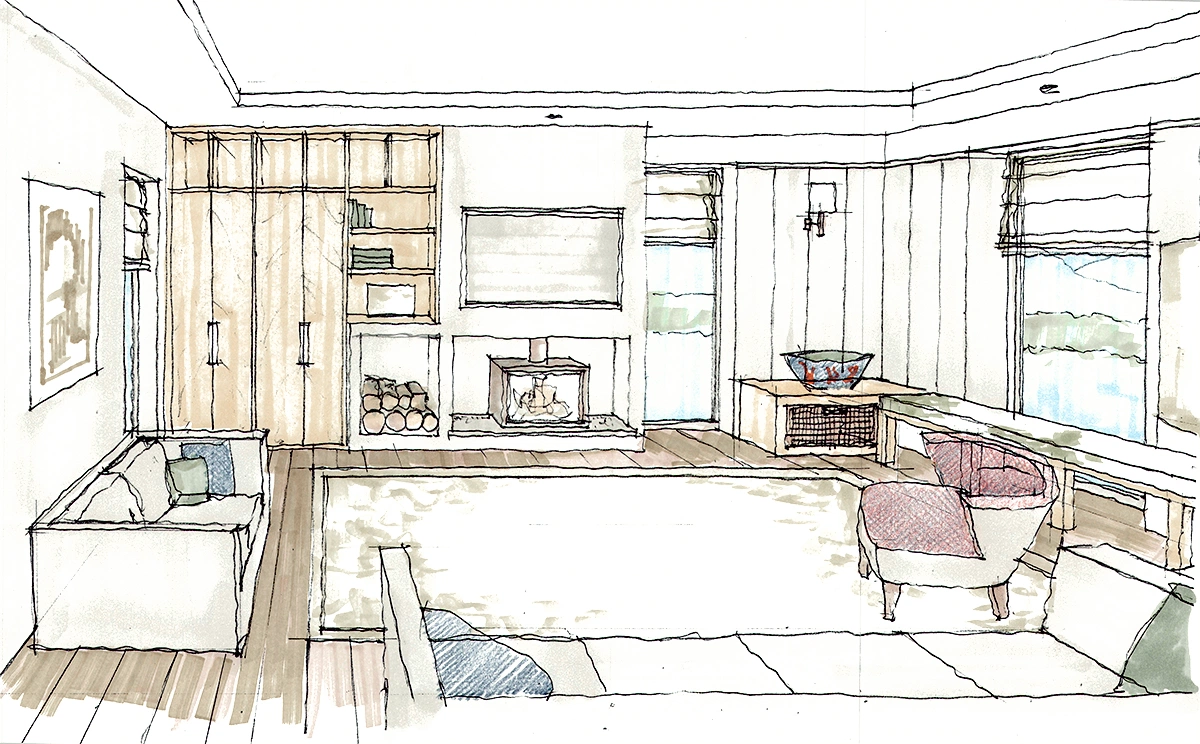 The room focuses on a recessed fire in the traditional manner and features a dark, glazed tile backdrop with custom, dark panelling above, housing a wide screen TV and bookshelves. This, combined with the linen L-shaped couch, textured cotton armchair and large leather ottoman, creates a homely atmosphere.
