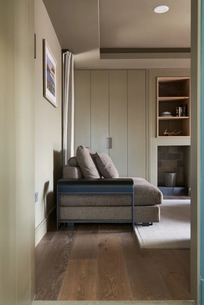 This cosy family room was designed for a modern country lodge in Co Kerry by Studio Brazil Interiors. Drawing inspiration from the surrounding landscape, the project incorporates earthy tones and soft textures.