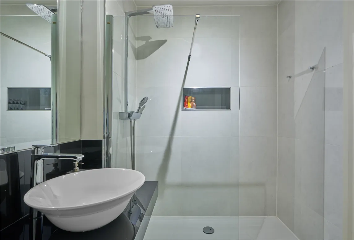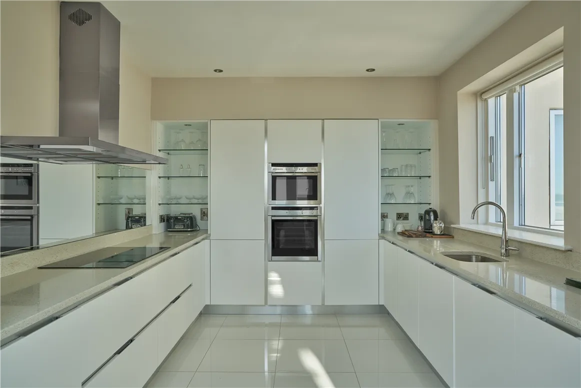 Adjacent to this is the kitchen, which is a sleek room with plenty of worktop space, white units and glass shelving, as well as its own sea view.