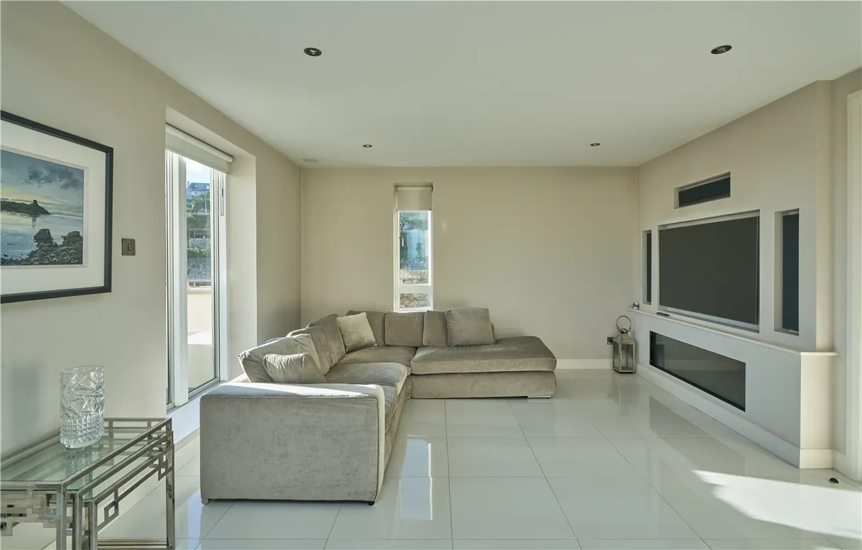 The dining area is generously sized, ideal for entertaining as many people would comfortably fit into it. The living space has a built-in TV unit and electric fireplace, perfect for cosy evenings in, while glass doors open out to a balcony that overlooks the sea.