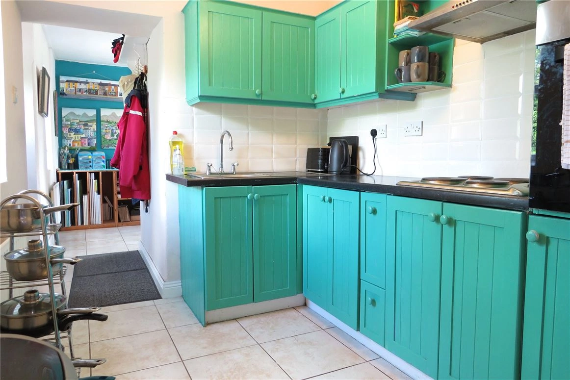 The kitchen can be found further inside the house, where colourful wooden cabinets have been fitted for storage. White splashback lines the walls, with the same tiles continuing from the entranceway into this room. An integrated hob and oven have also been installed for ease of use.