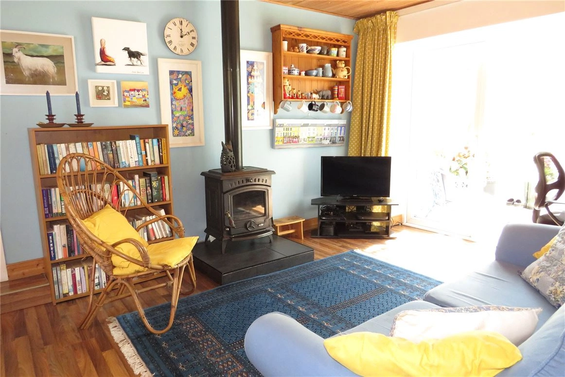 Bordered by a low gated stone wall, a short gravelled path leads to the front of the property. Inside, the layout comprises an entrance porch, kitchen, living room with solid fuel stove, a beautiful sunroom, dining room, ensuite bedroom and bathroom.
