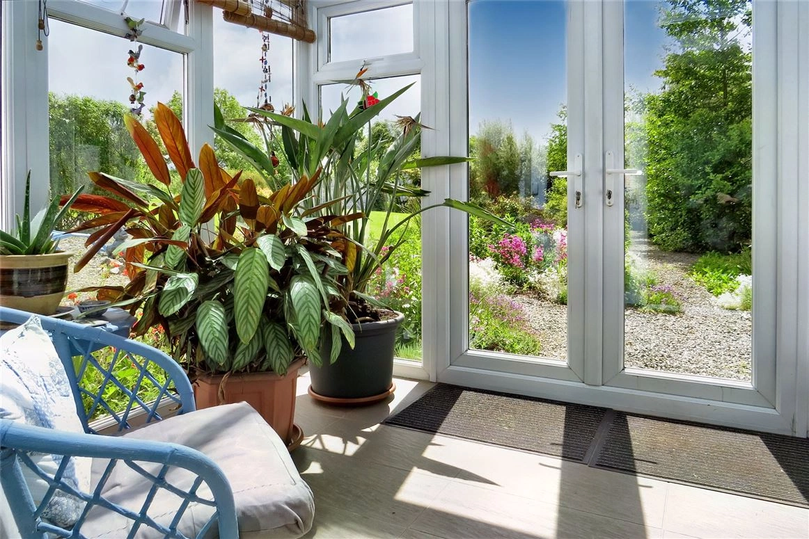 Warm timber flooring has been fitted in the living room, which also features a solid fuel stove with back boiler used to heat the radiators and water. This room leads into the sunroom. Featuring ceiling-to-floor windows and double French glass doors, it’s the perfect place to enjoy a cup of coffee on a quiet Sunday morning.