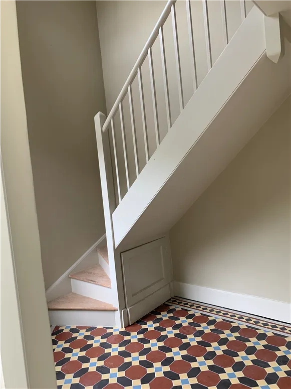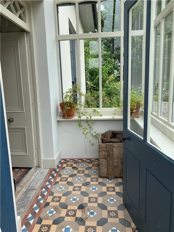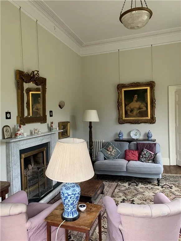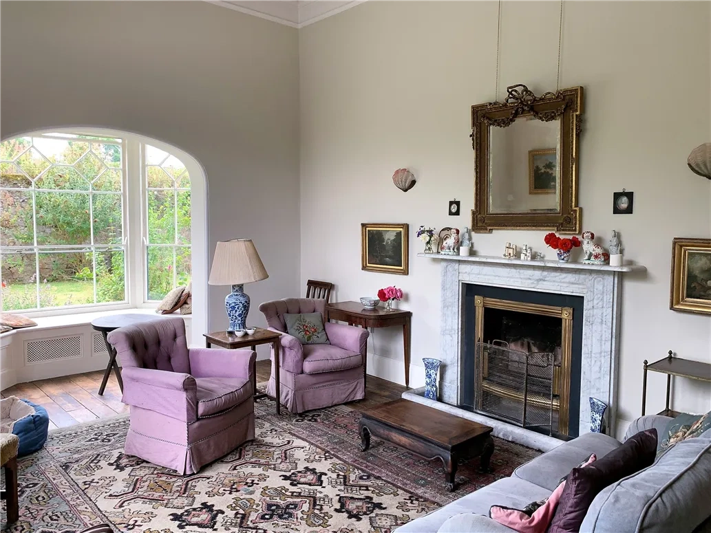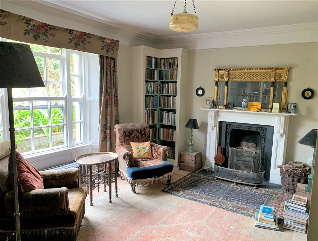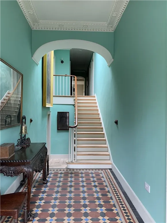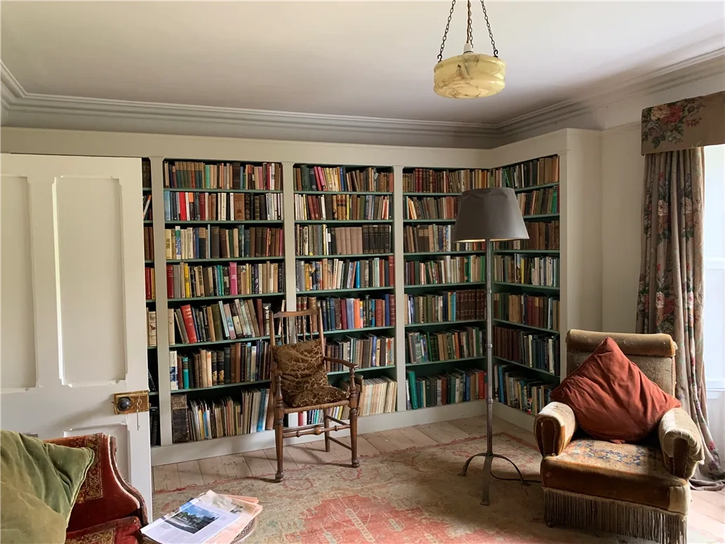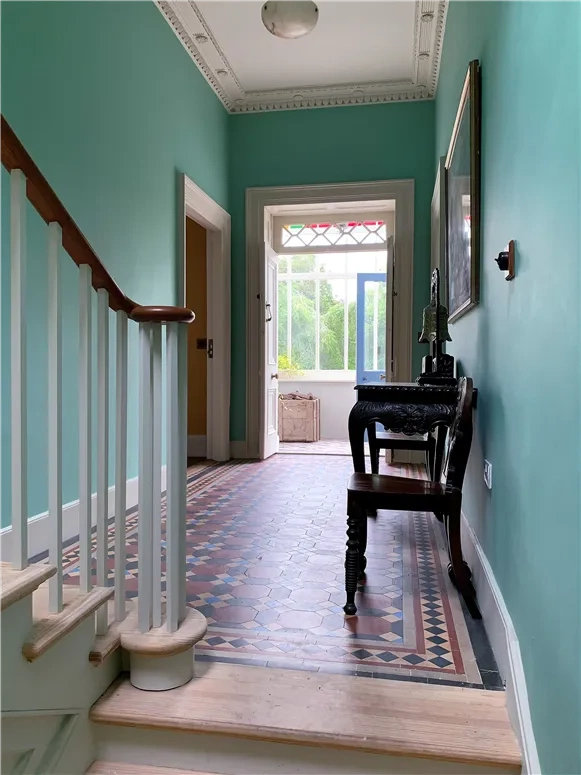 A glazed porch opens to the entrance hall, where you’ll find ornate tile flooring and doors off to the main reception rooms. Original period features include high ceilings, cornicing and large sash windows together with polished salvaged floorboards, open fireplaces and marble chimneypieces. The drawing room has a lovely bay window with a window seat to the south while the library has an open fireplace, original floorboards and fitted bookshelves.