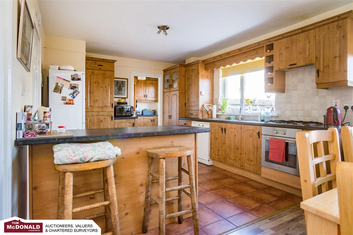 The light-filled entrance hallway leads to the kitchen/dining room. The kitchen has ample storage with cabinets and drawers lining the walls along with a handy breakfast bar to one side. Meanwhile, the dining area has a large table ideal for family dinners or entertaining guests.