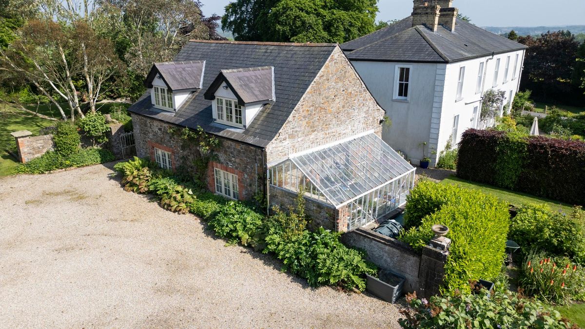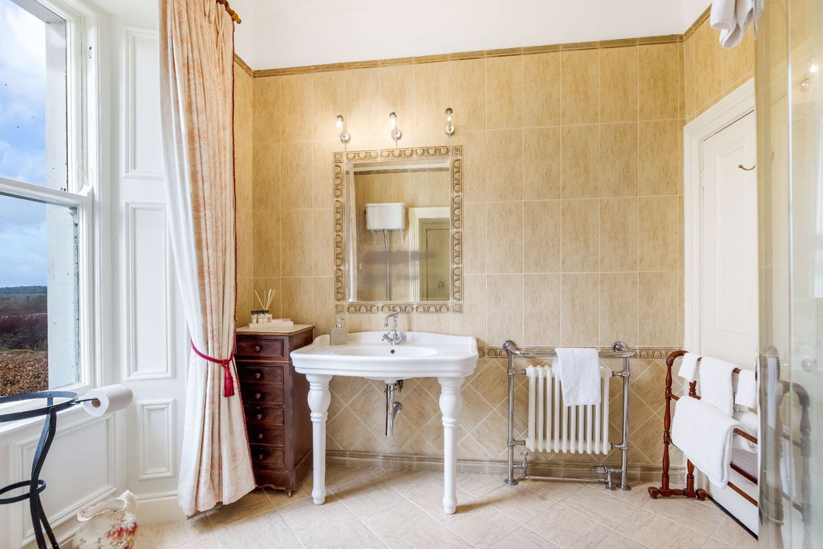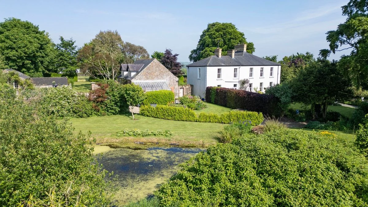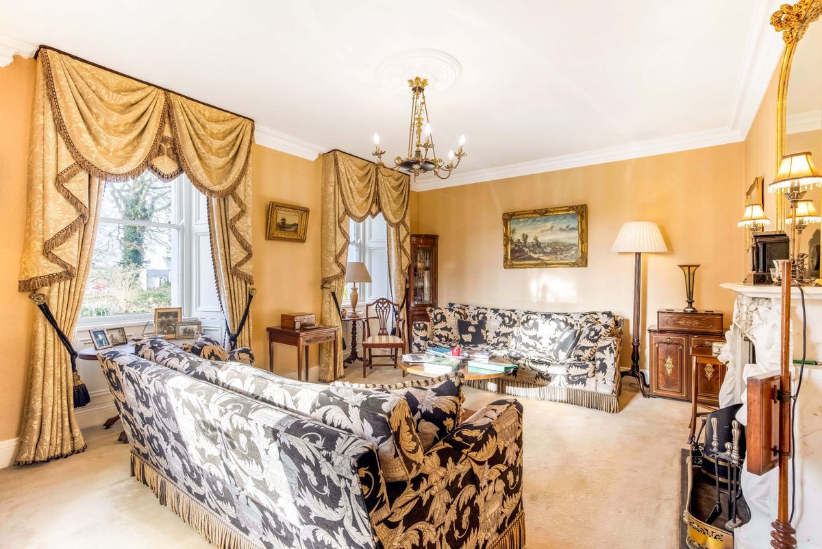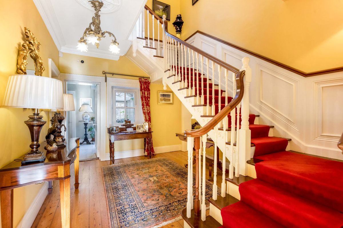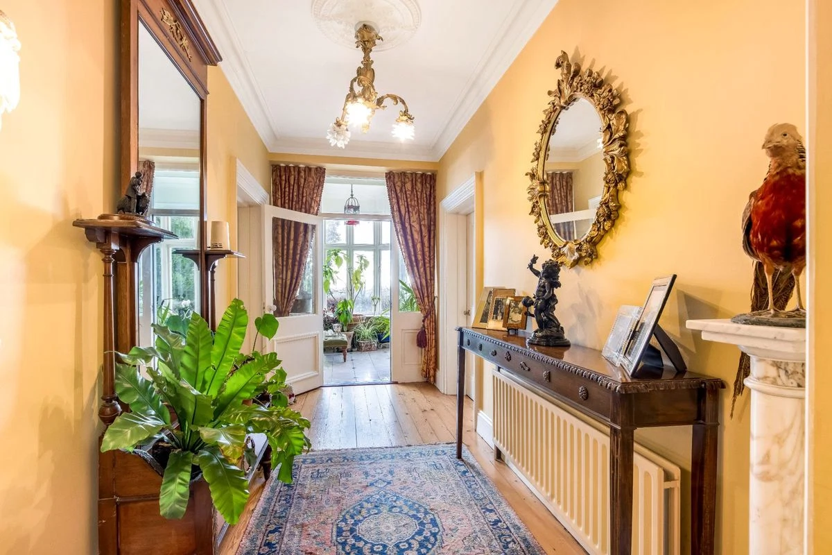 As well as five bedrooms in the main house, it also has a mews that provides a further four bedrooms. The home sits at the end of a long, tree-lined driveway, and you enter the house into a porch full of lush plants. The main entrance hall has the original pitch pine flooring and leads to a drawing room on the left with dual aspect sash windows, and a study on the right.