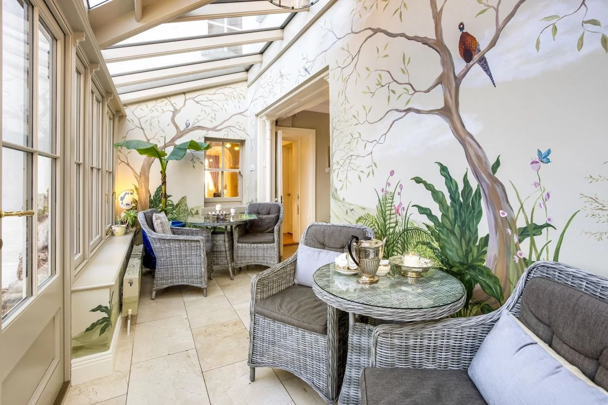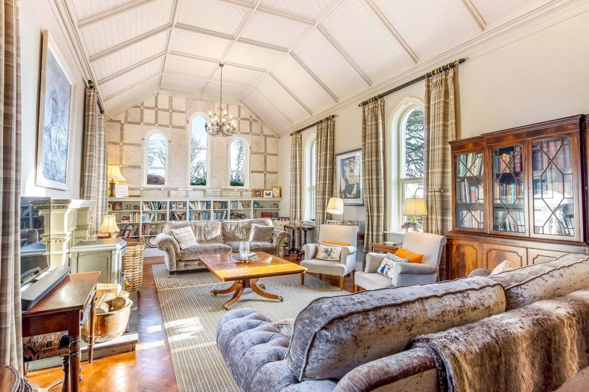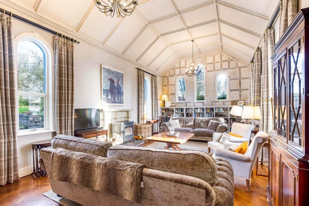 To the back of the house sits the kitchen, off which sits an old Sacristy which has been repurposed as a laundry room. A timber conservatory provides a peaceful place to admire the garden, with a hand-painted mural blending the indoors and outdoors. There is a dining room with period features, while the former church has been converted into a showstopping living room.