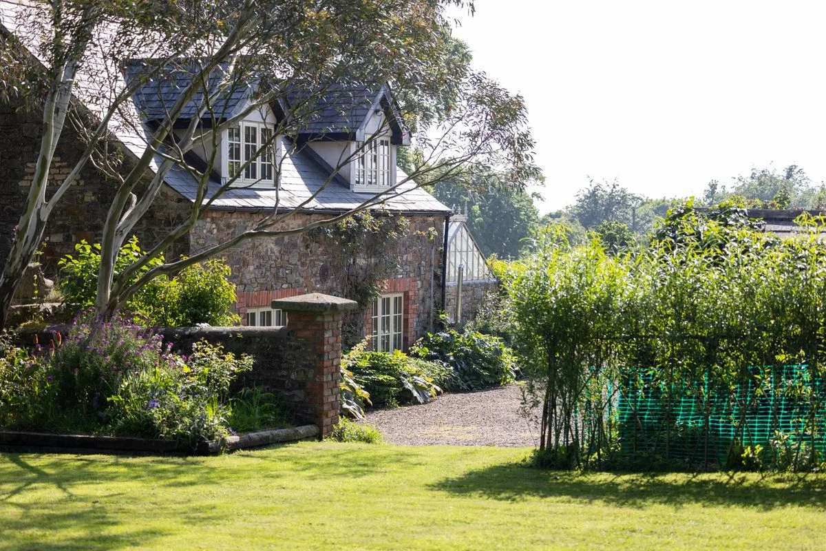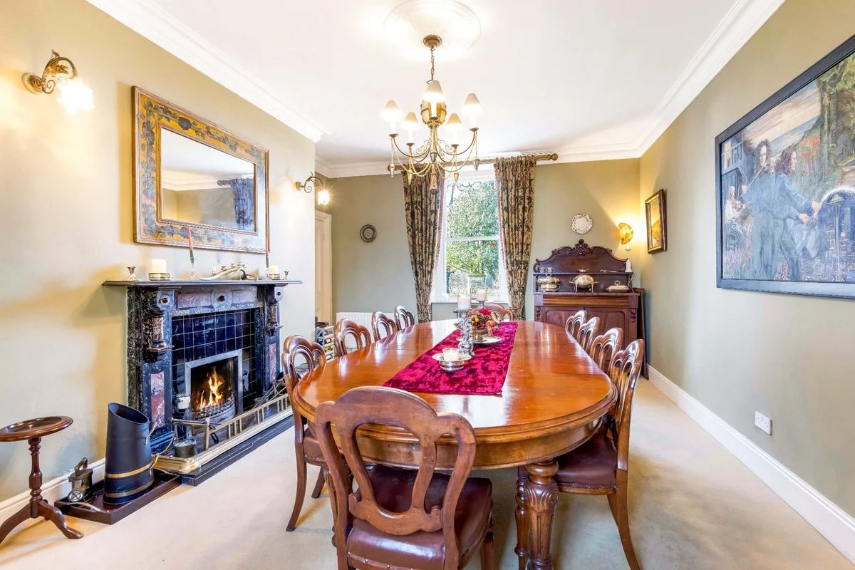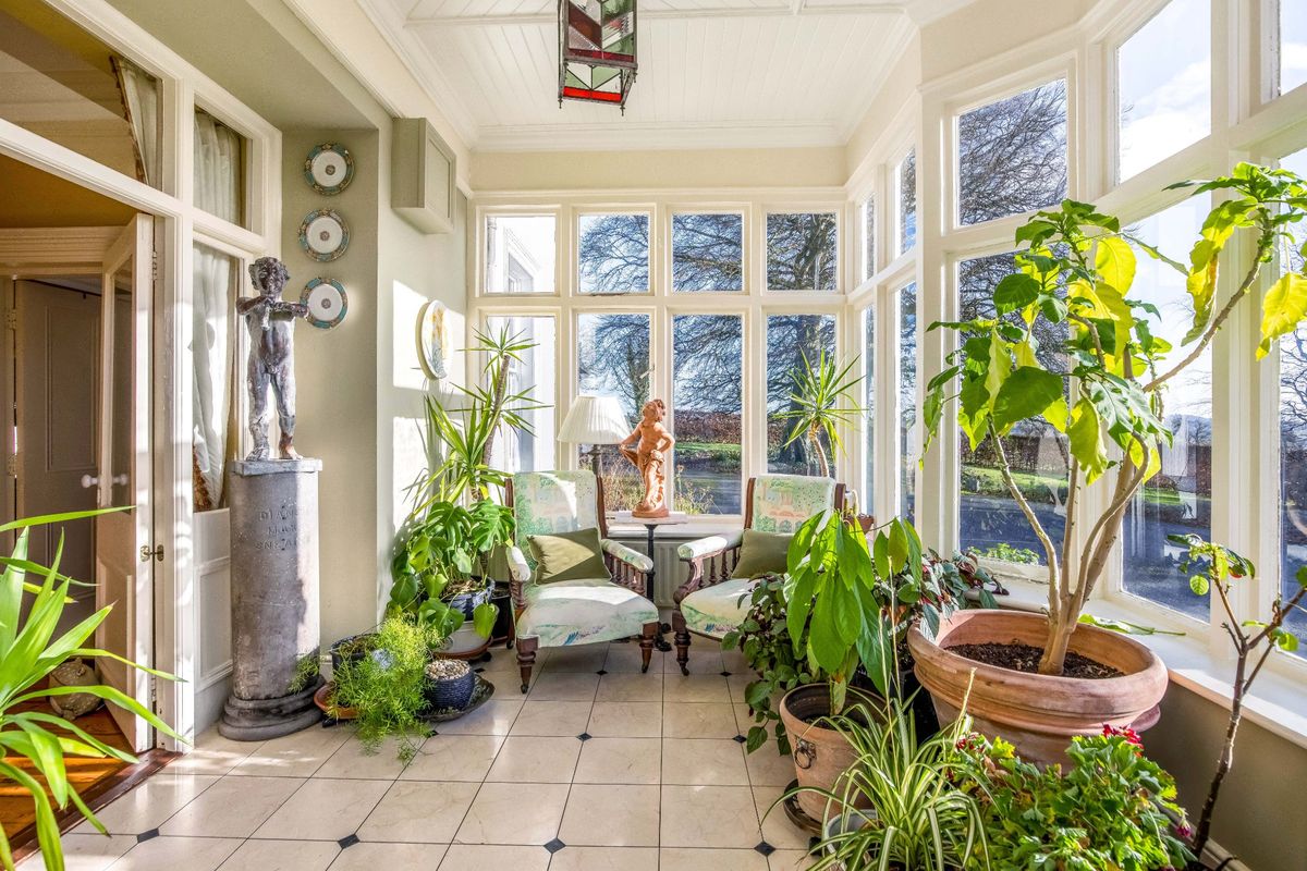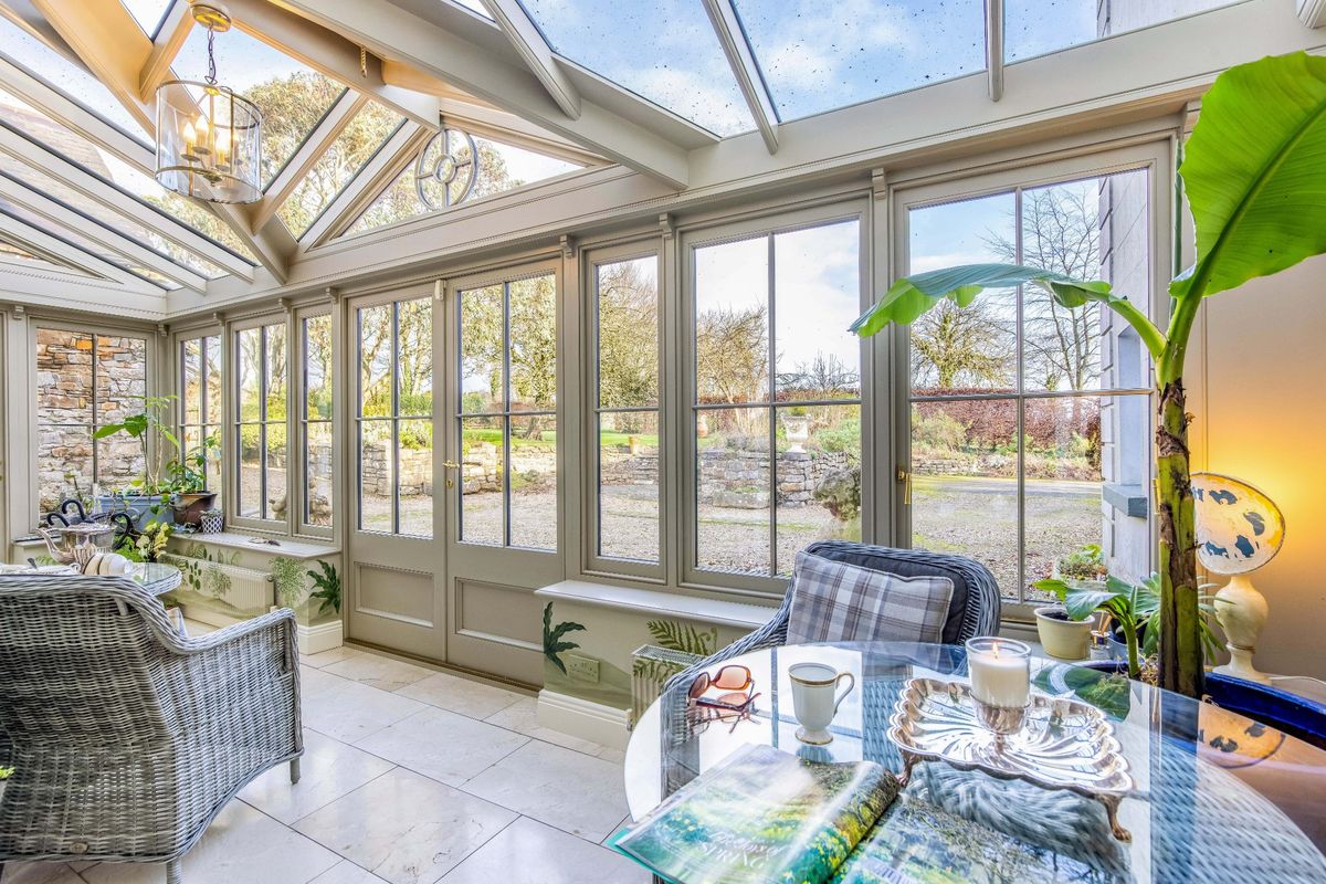 To the back of the house sits the kitchen, off which sits an old Sacristy which has been repurposed as a laundry room. A timber conservatory provides a peaceful place to admire the garden, with a hand-painted mural blending the indoors and outdoors. There is a dining room with period features, while the former church has been converted into a showstopping living room.