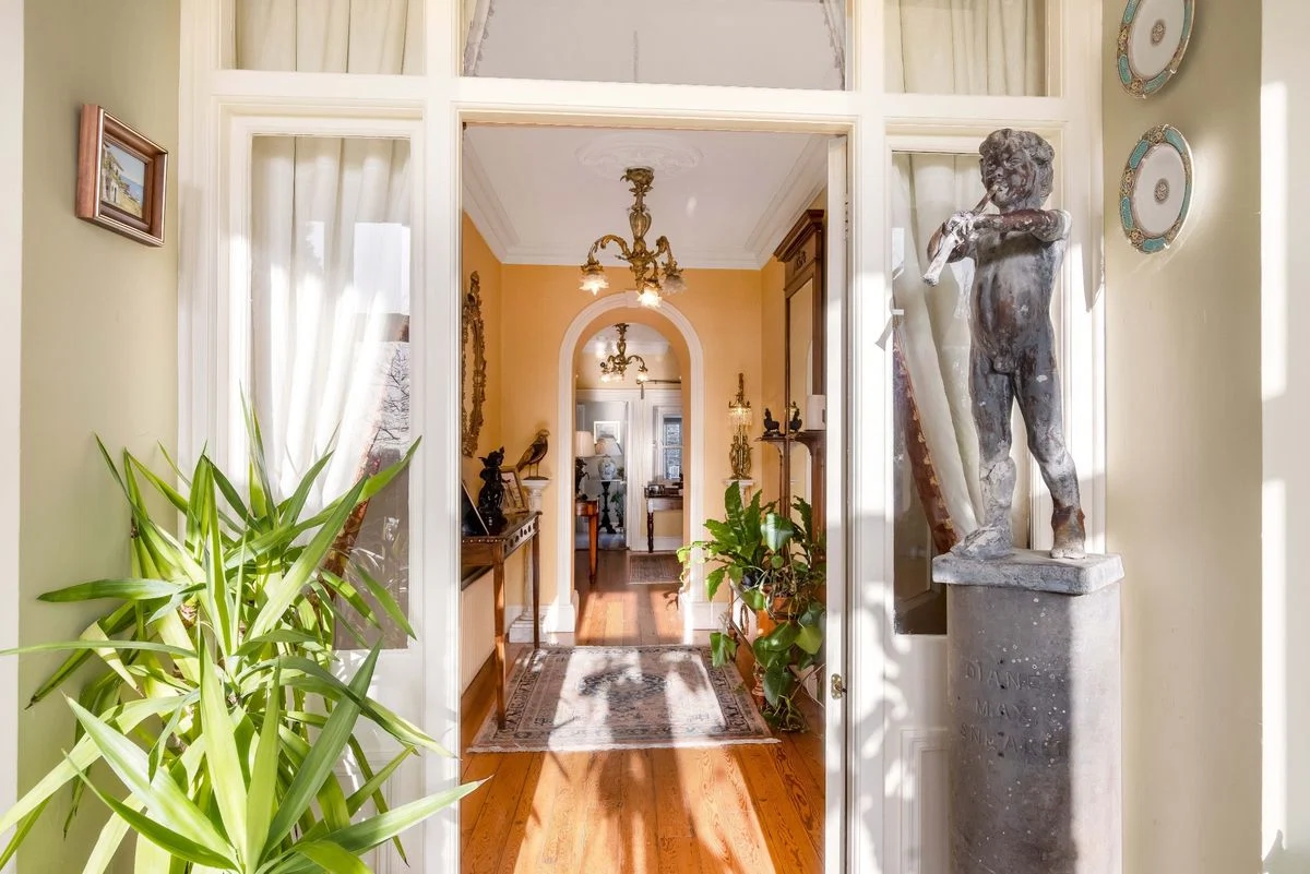 It retains many of its original features, including an open floor plan, a marble wall, arched windows, and a vaulted ceiling. This room has a parquet floor that was sourced from a church in Belfast, another nod to its previous use.