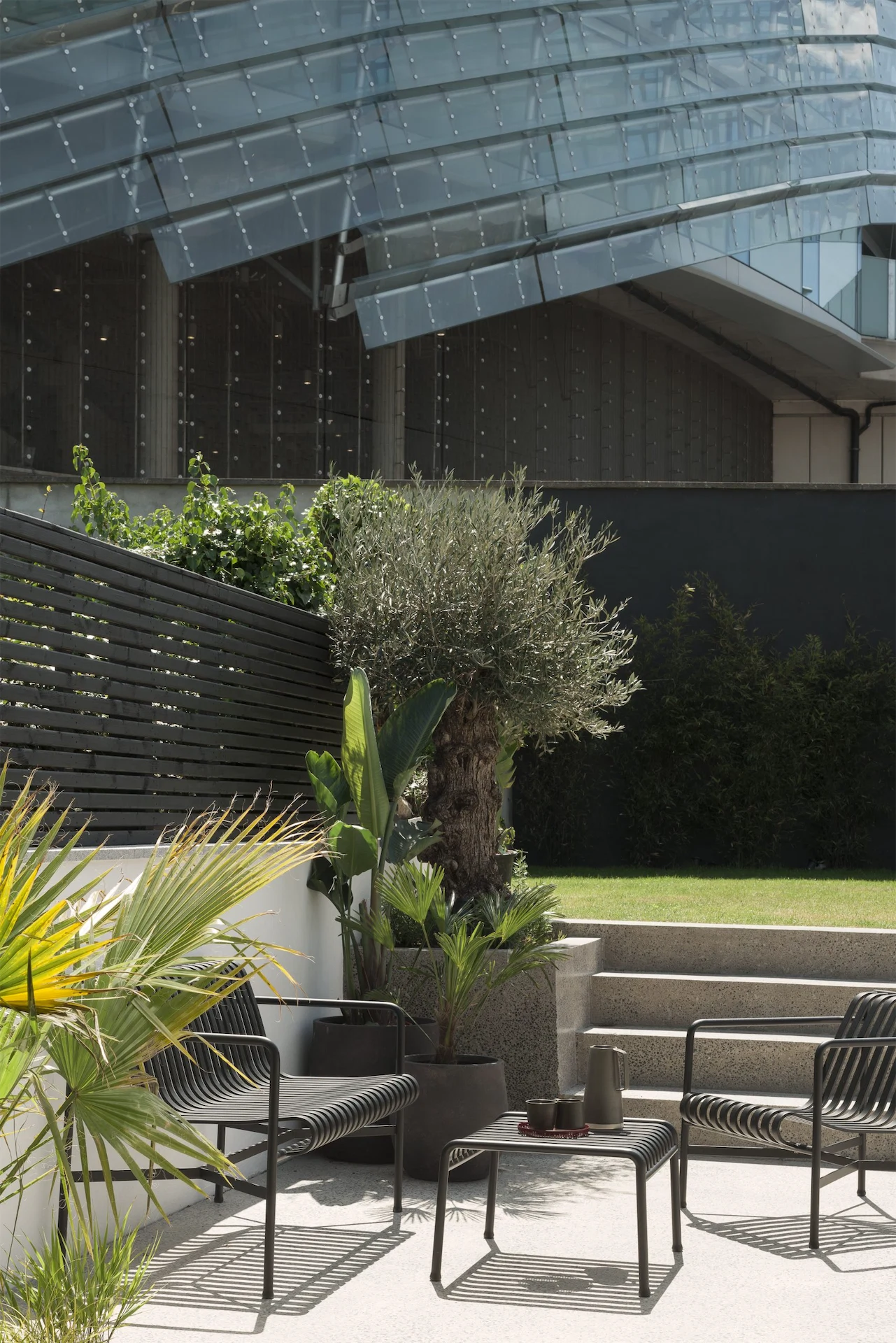 From the front step, the house looks like most of the other terraced homes on its square but inside its traditional layout of small, choppy rooms has been replaced with an open, airy, California-bright interior that transcends its square footage. The only nod to the original home is the reception room to the right of the front door, which was rebuilt in its traditional form with cornicing and sash windows to match the former space.
