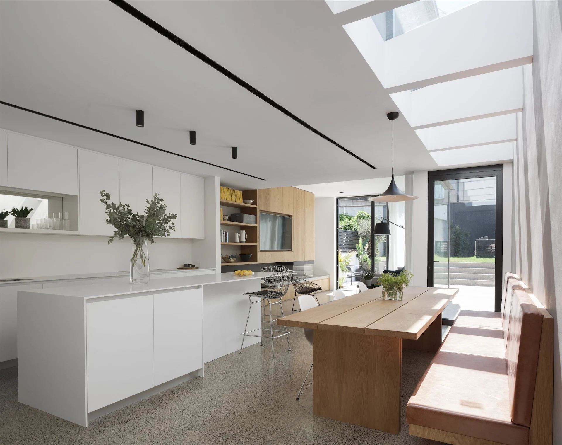The “new” open-plan extension is a multi-functional space that houses the kitchen, living and dining area, backed by a wall of windows and a concrete floor that runs through to the outside south-facing patio, dissolving barriers between the interior and exterior. The external steps and planter box for the beautiful 150-year-old olive tree in the garden were also poured from the same polished concrete, as was the concrete bench in the living area to create a uniform look.