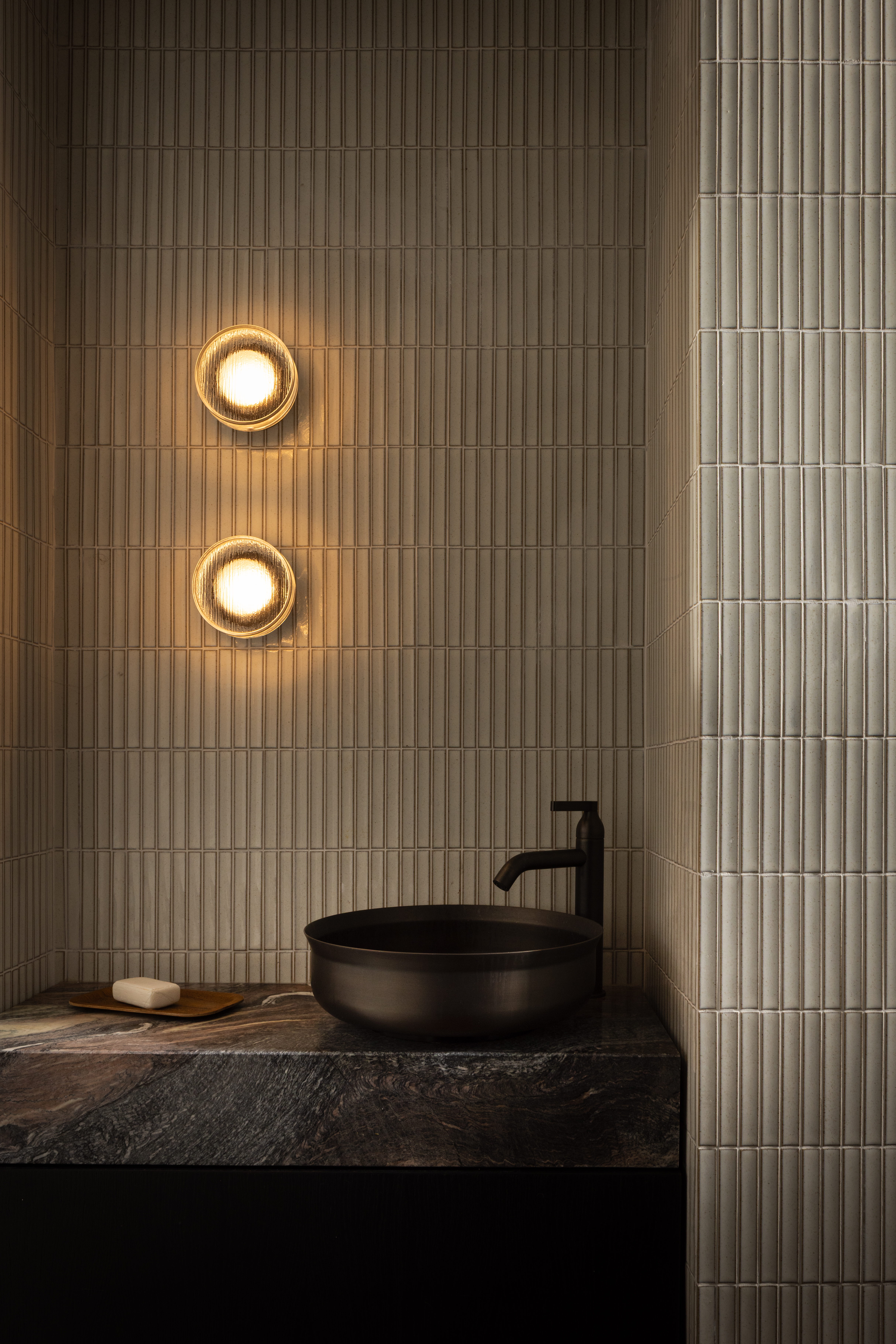 The powder room is a jewel-box moment: an Agape sink and tap in burnished brass, Marset lighting, Japanese Inax tiles, and Cipollino Ondulato stone, understated luxury expressed through material, craft, and restraint.