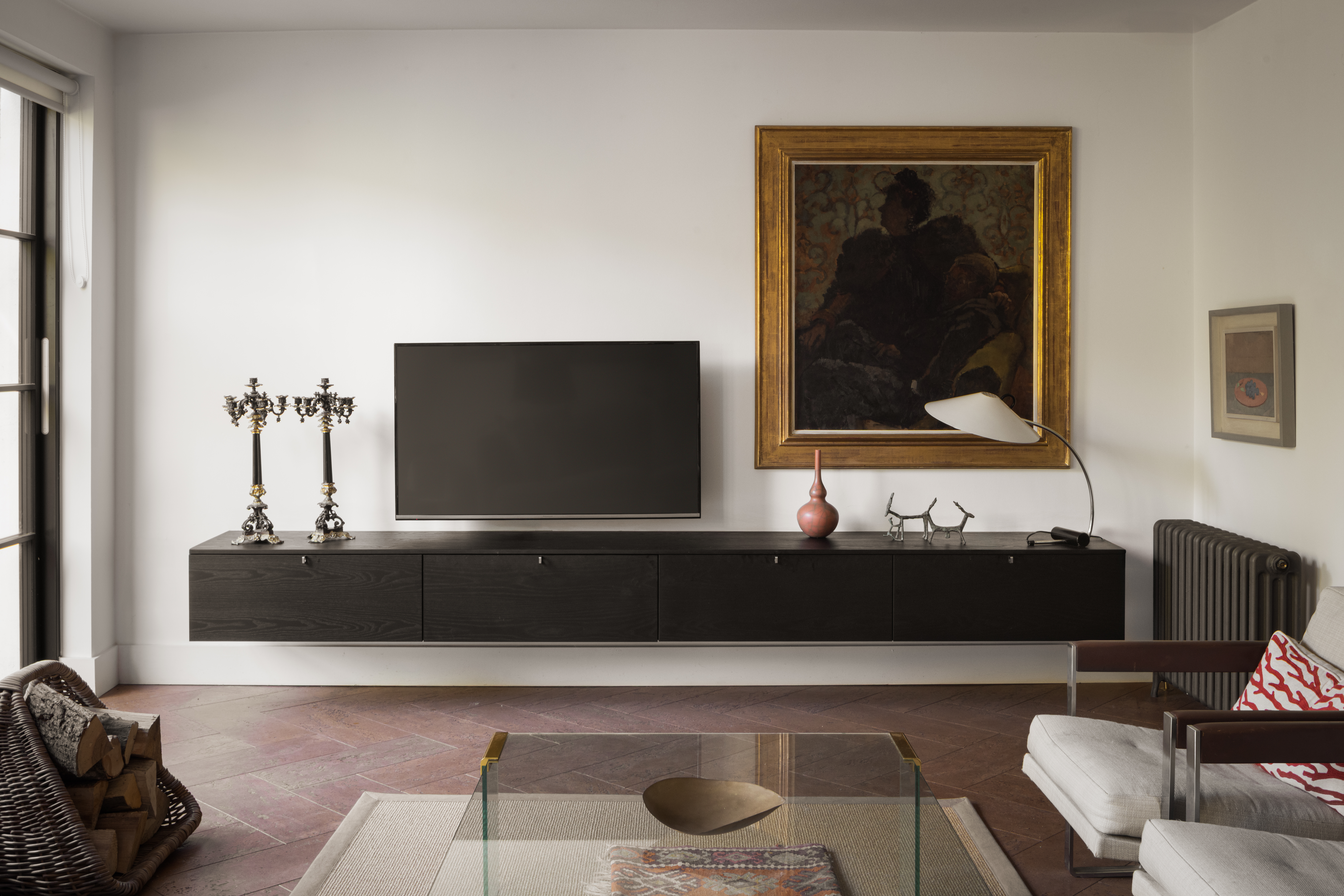 The living room features a Porro media unit, surrounded by an electric mix of antique pieces and art that brings warmth, character, and personality to the modernist framework.