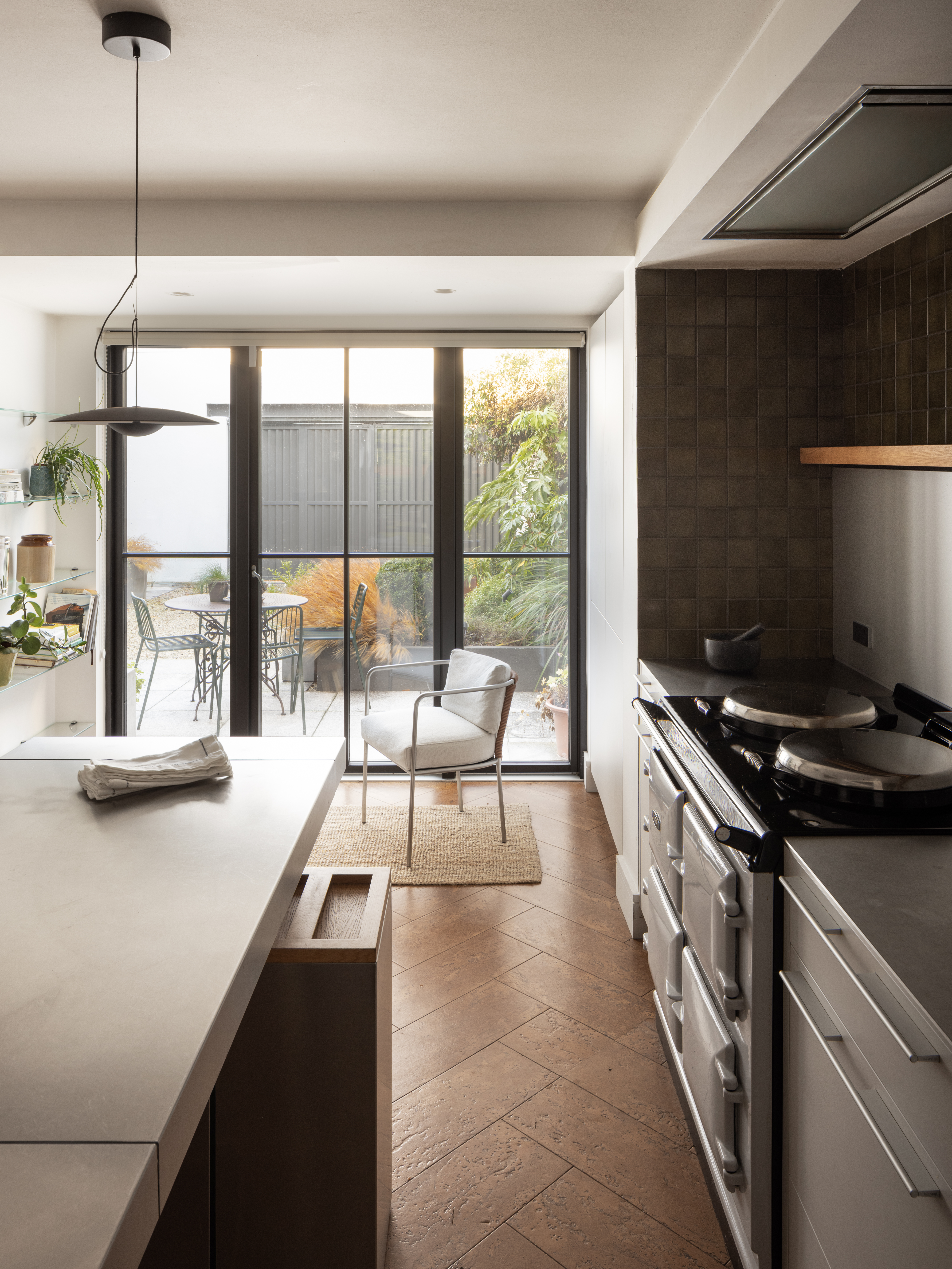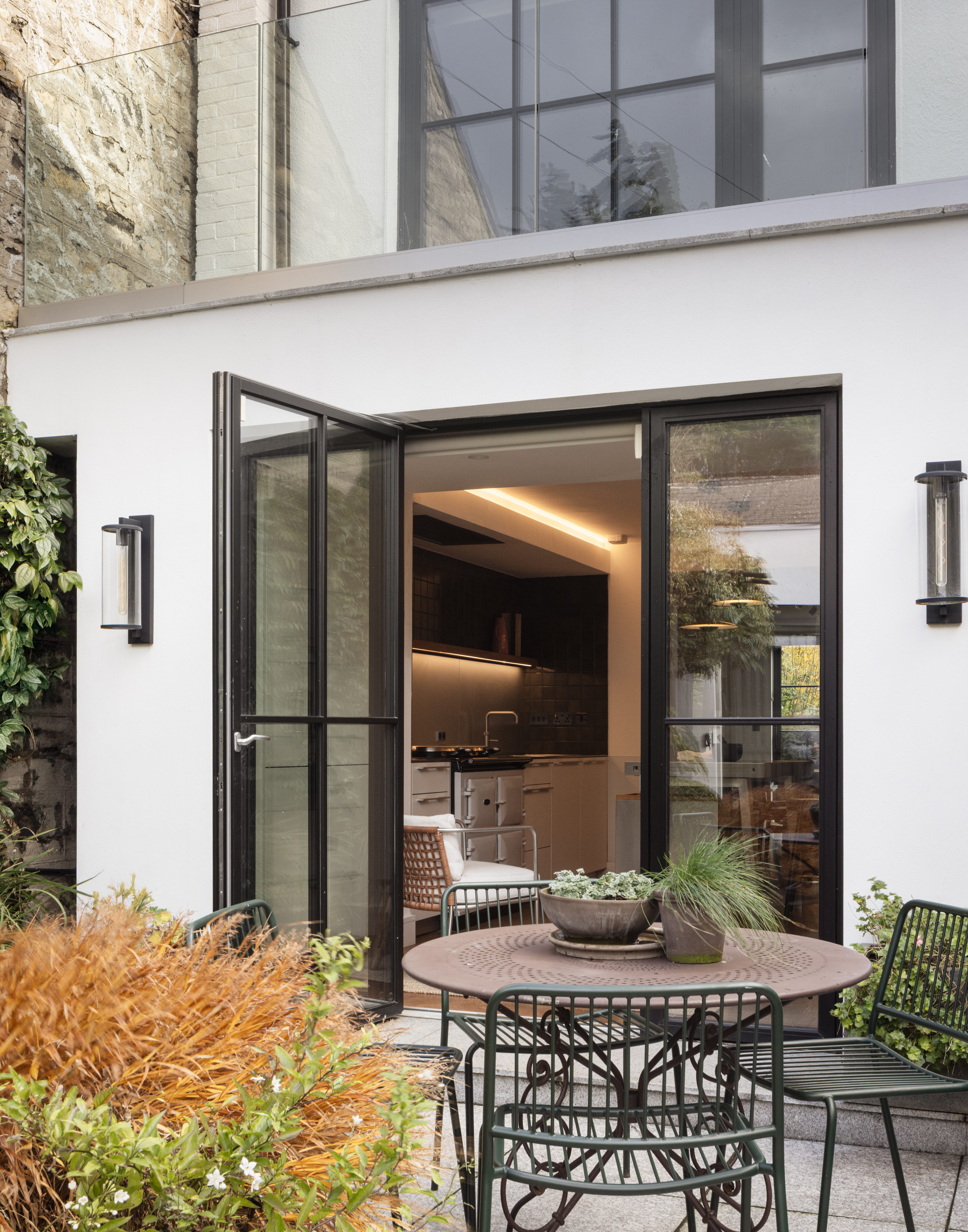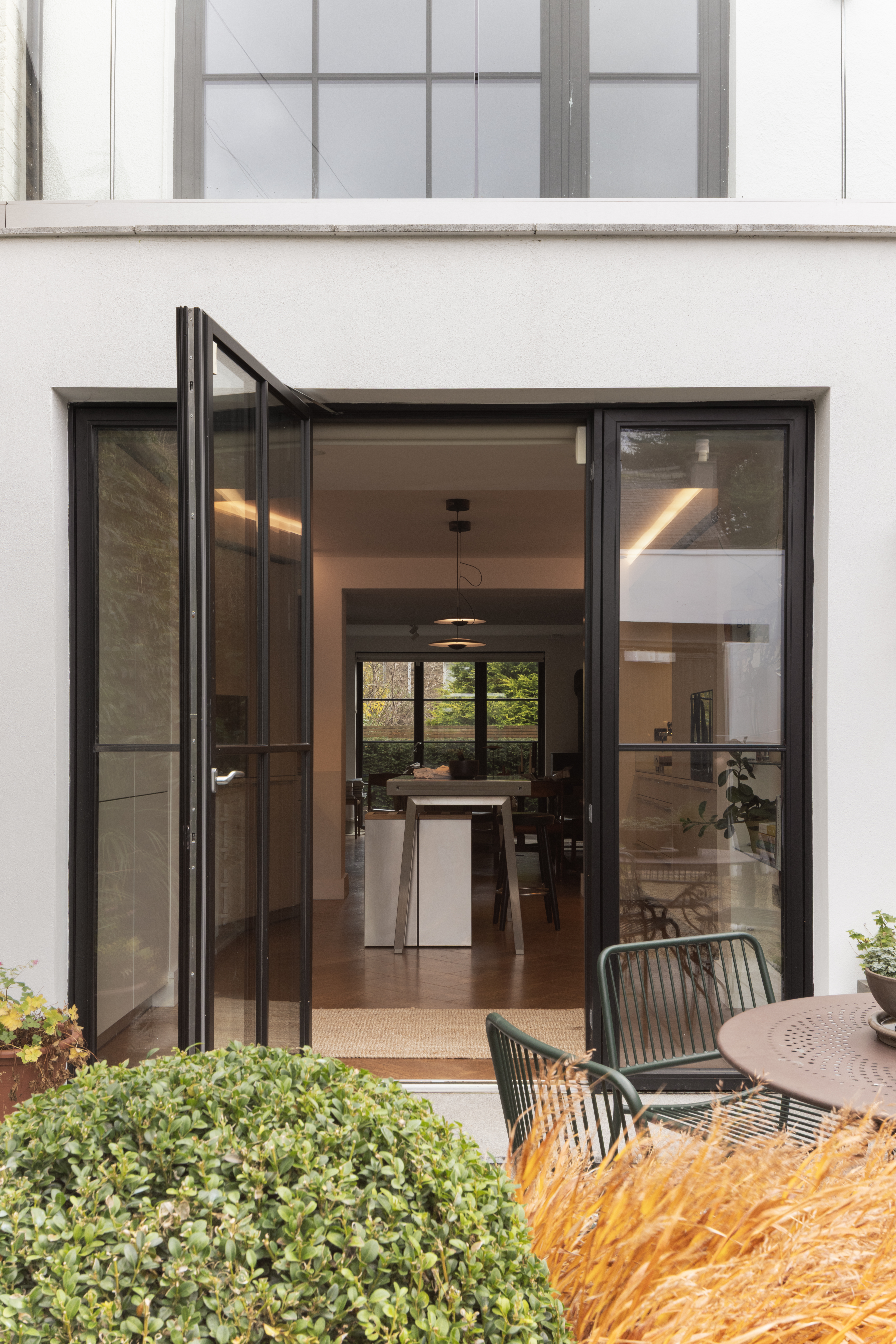 A front extension reconfigures the entrance, enlarges the kitchen, and recomposes the front elevation, establishing a clearer architectural presence within the courtyard. To the rear, carefully proportioned glazing strengthens the connection to the garden, allowing light to penetrate deeper into the plan. This relationship between inside and out is brought fully to life by garden designer Fionnuala Fallon, whose planting design and selection give the external spaces the same sense of intention and calm that defines the interior.