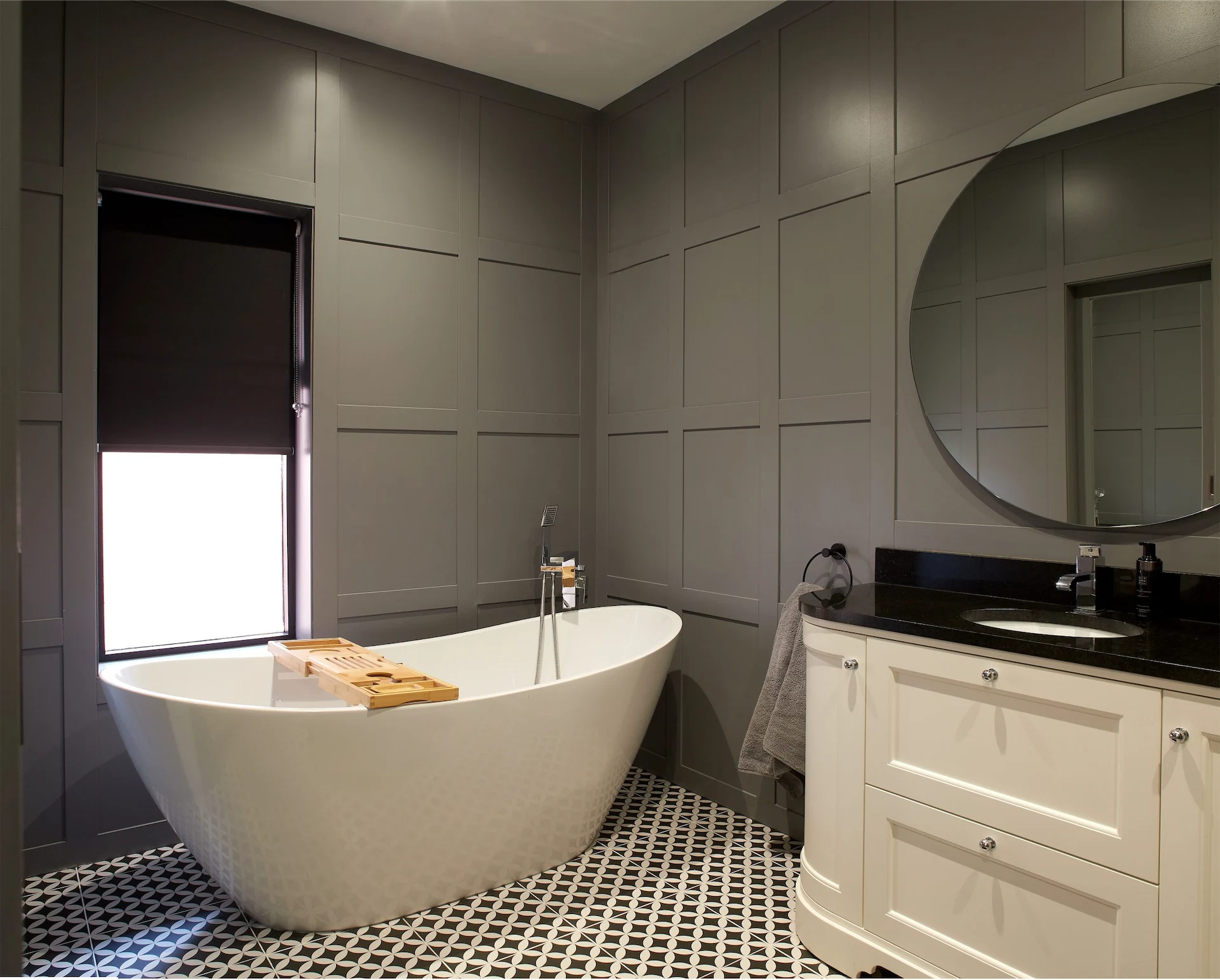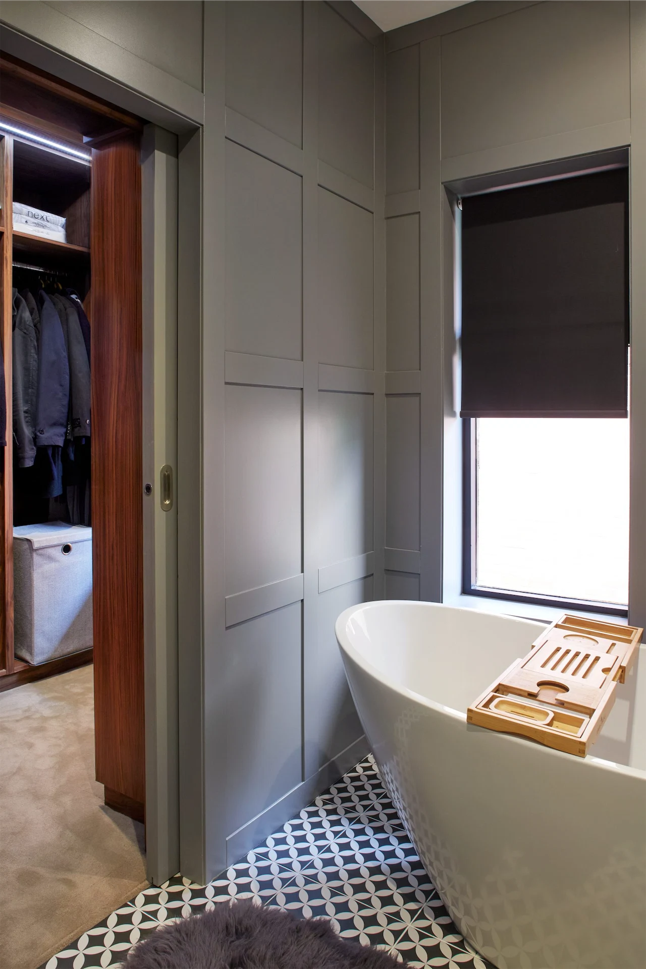 In the dining room, “the doors were replaced with bespoke crittall-style doors which open out onto a private courtyard with a trellis and seating area,” Caroline says. Bespoke joinery runs throughout the home, while upstairs the master ensuite was remodelled to create a hidden walk-in closet.