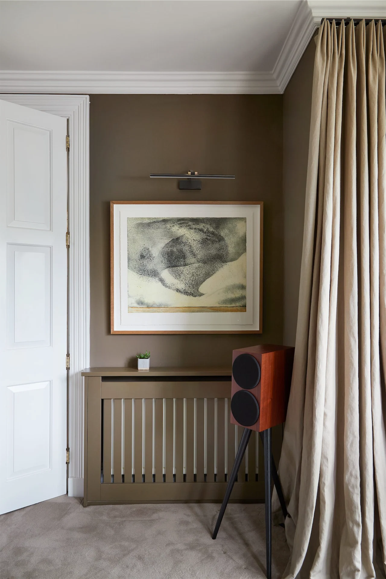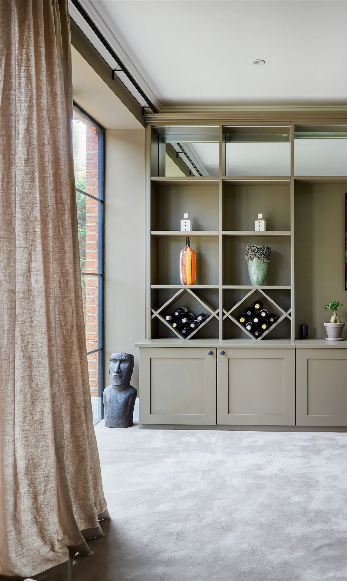 Throughout the home, a warm and welcoming feel is created through natural materials, soft textures, and soft shades. “The paints are from Little Green, Farrow & Ball and Colourtrend, the curtains are 100% French linen and are all made to measure and fitted onto silent gliss tracks. Most of the upholstery is bespoke and fabrics are a wonderful tactile melange of matt velvet, buttery leather, fluffy cashmere, linen and soft wool.”