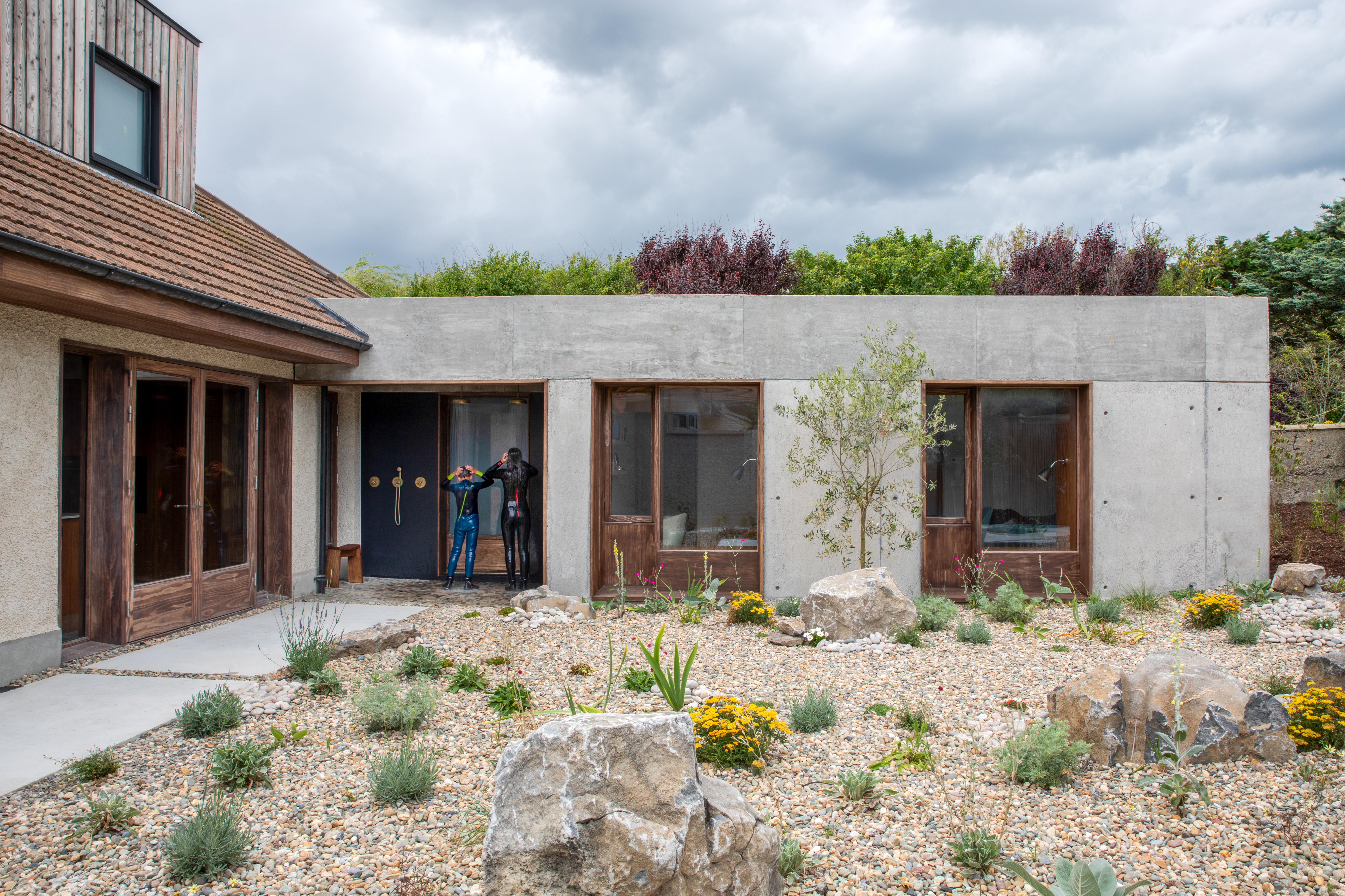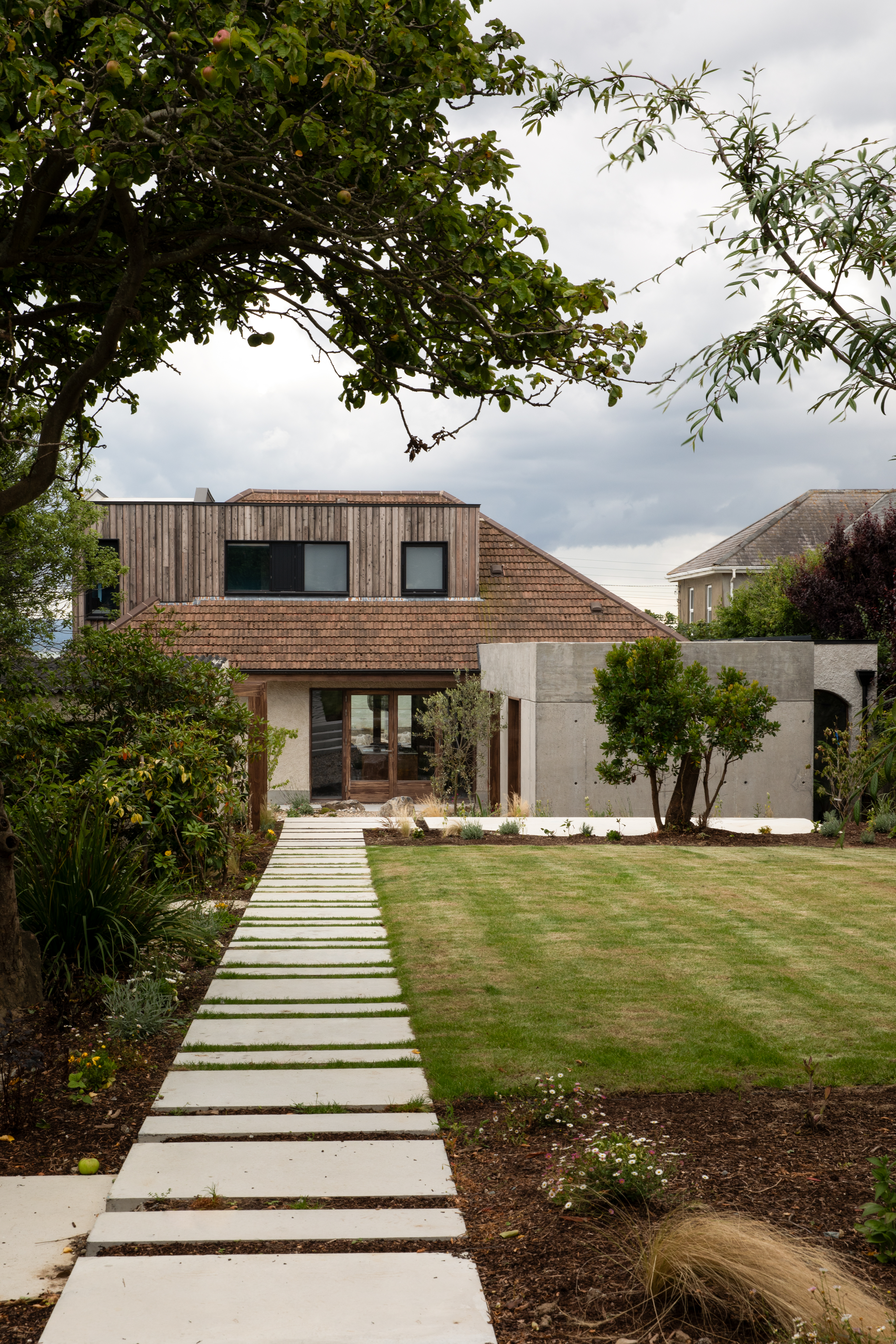 Perched on a slight slope, with sweeping views across Dublin Bay, stands a reimagined 1950s bungalow that blends the familiar with the contemporary. Originally it was one of four houses, and from the road retains a low profile, respecting its origins.