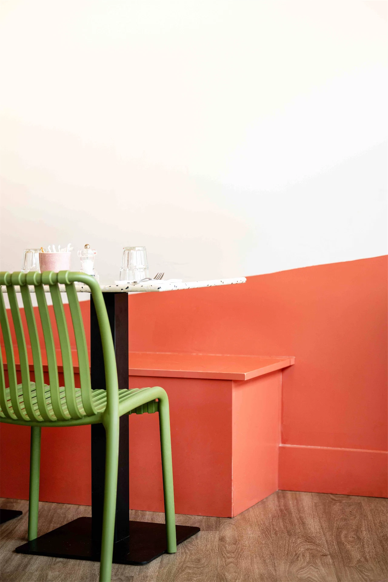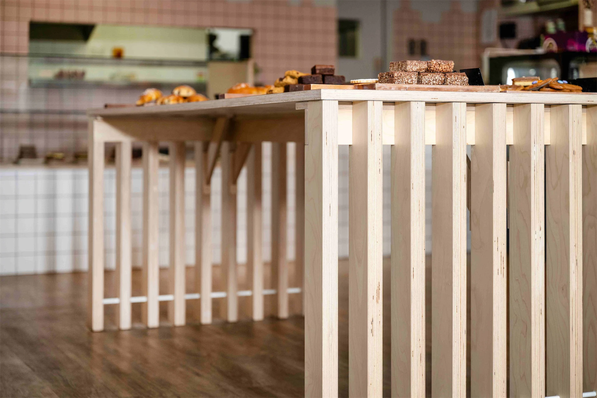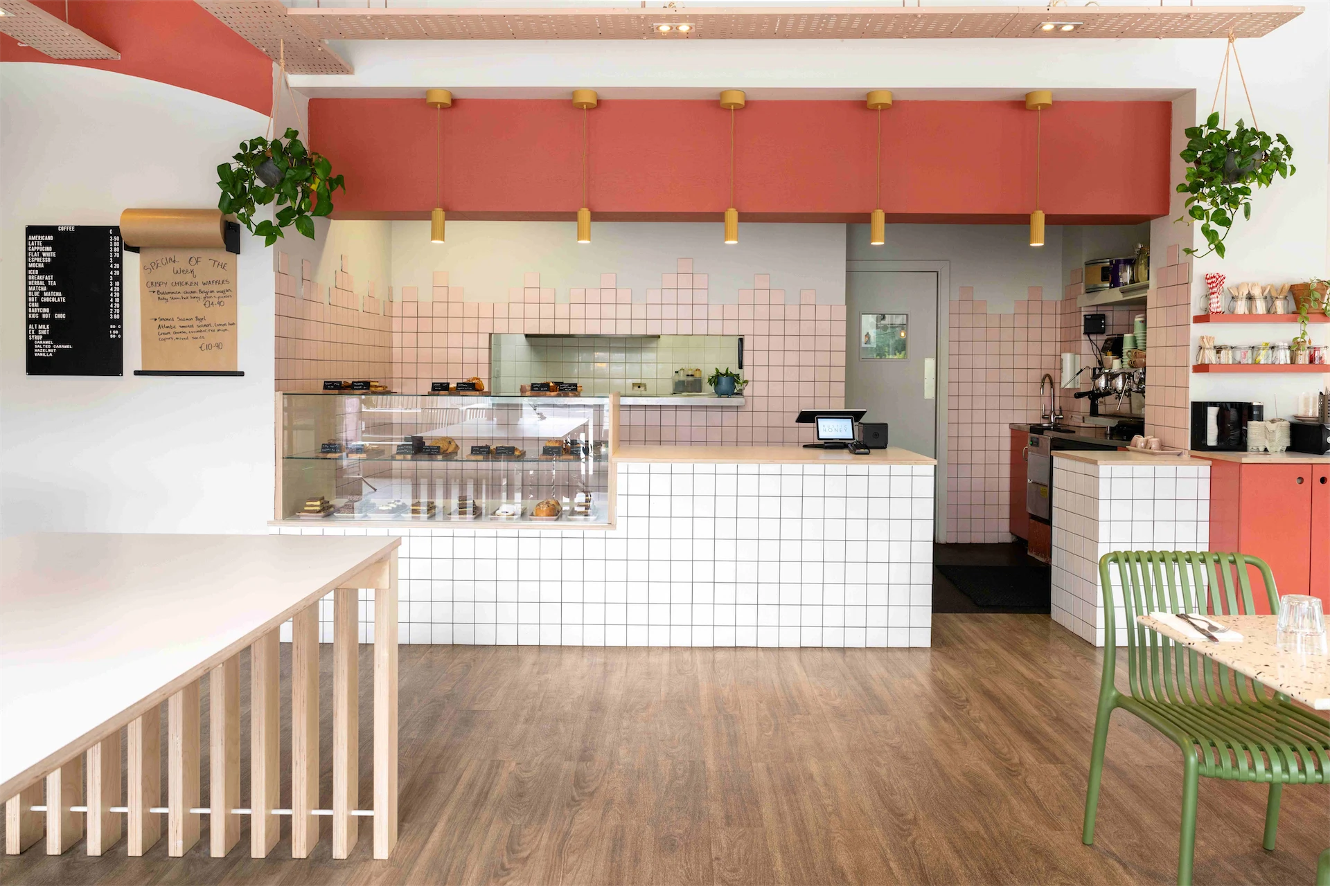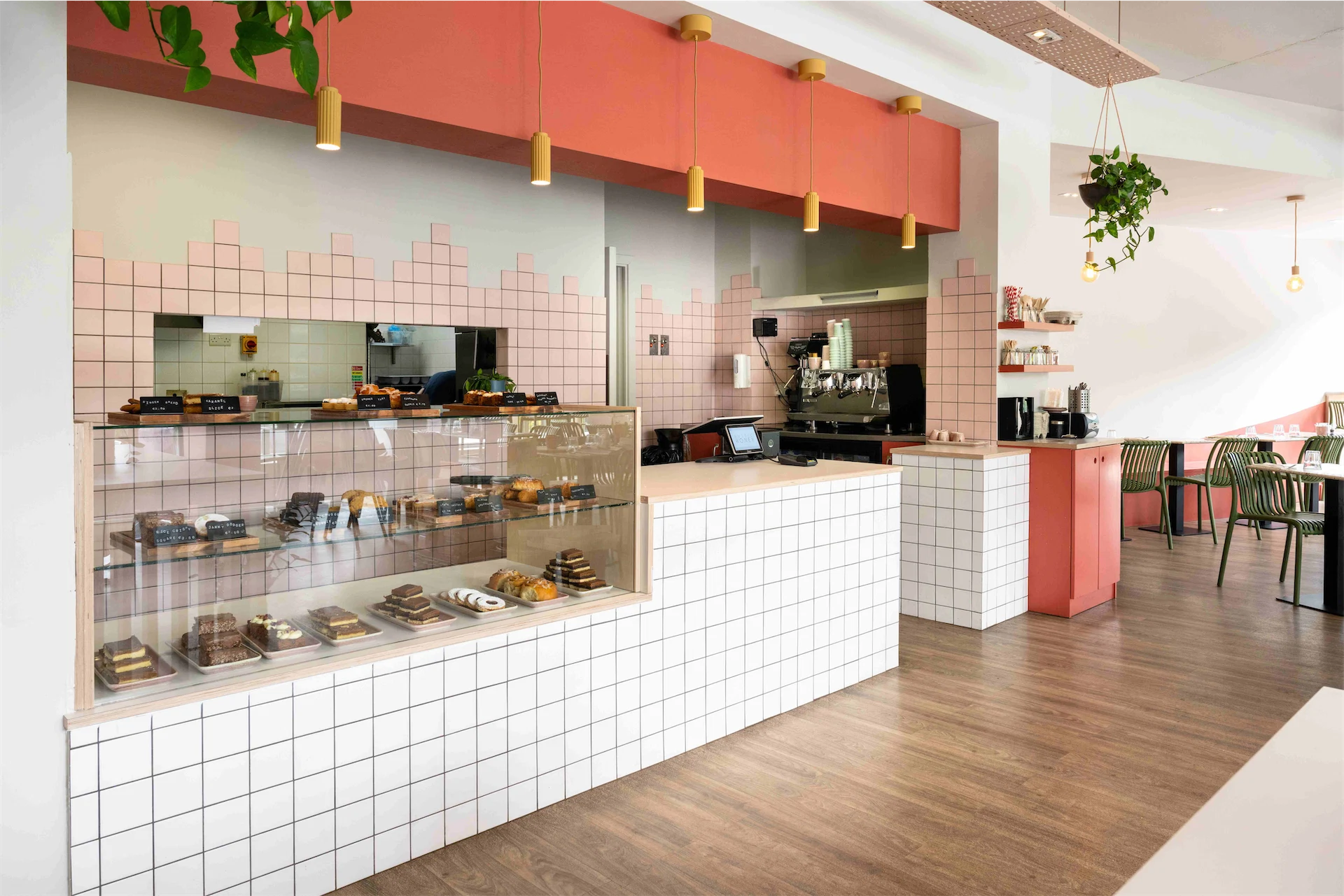 Colour was another important aspect of this design. “The transformation of the café was guided by a carefully curated selection of materials and a thoughtfully designed colour palette, drawing inspiration from the brand’s existing identity,” Lisa explains. “We aimed for a clean and bright aesthetic throughout, with birch plywood joinery adding natural warmth and soft pale pinks complemented by accents of green and mustard. A curved terracotta wall graphic became a key focal point, and an irregular tile pattern on the backdrop introduced a playful and unexpected touch to the counter area.”