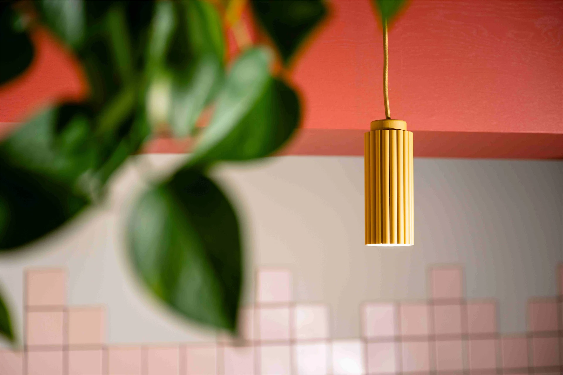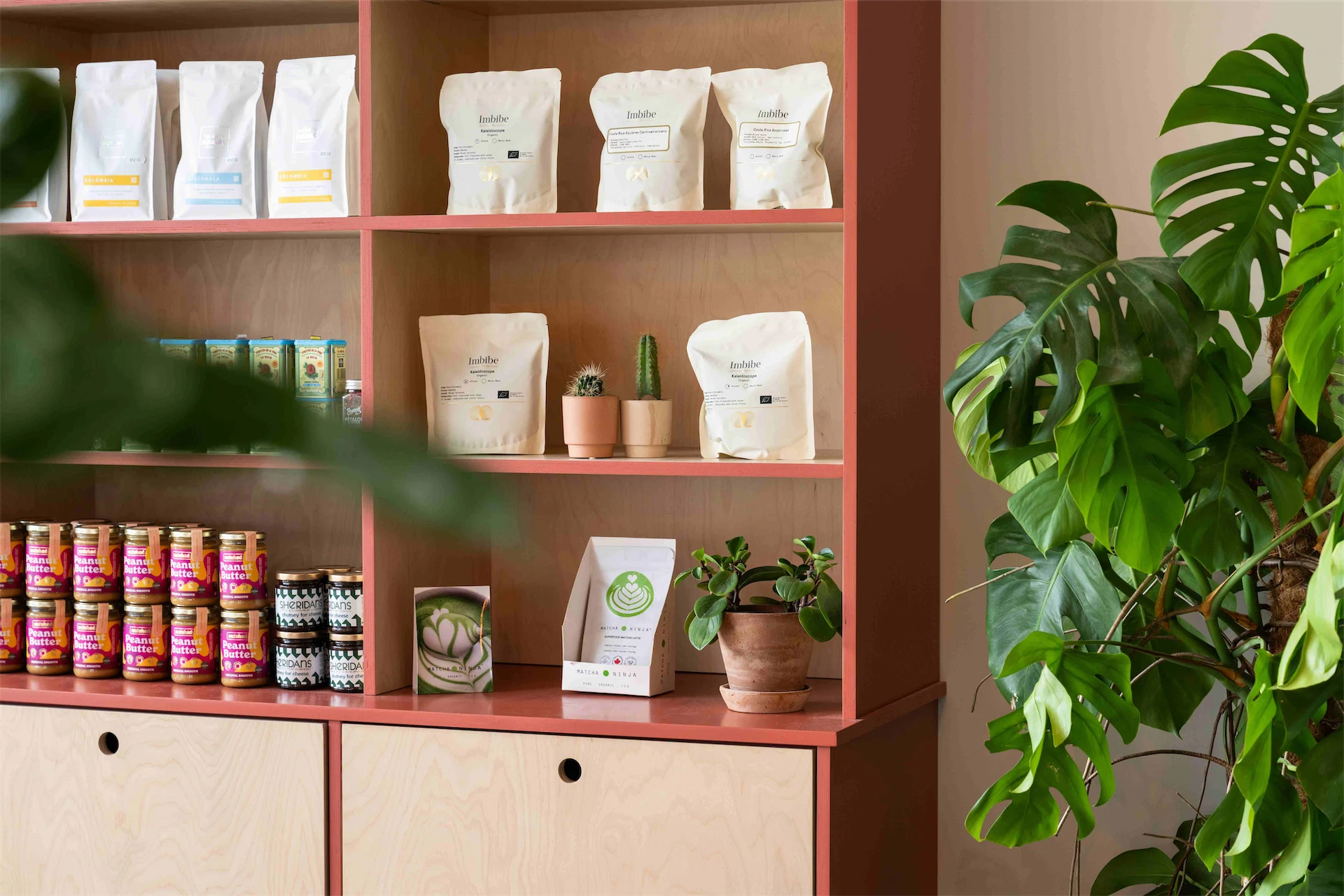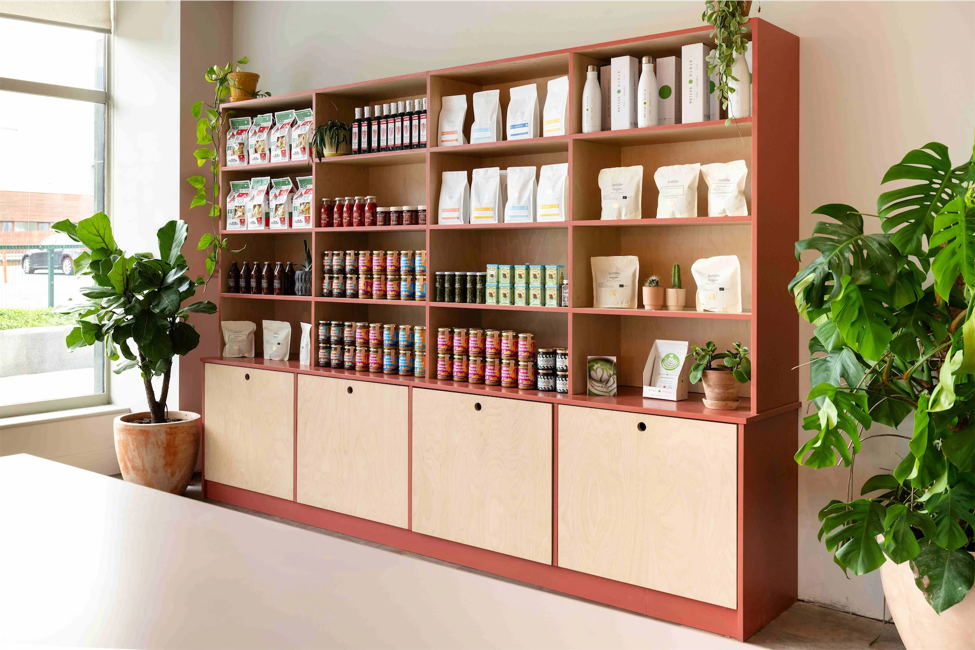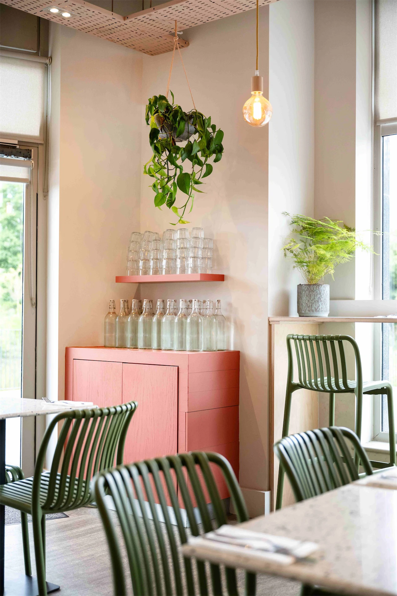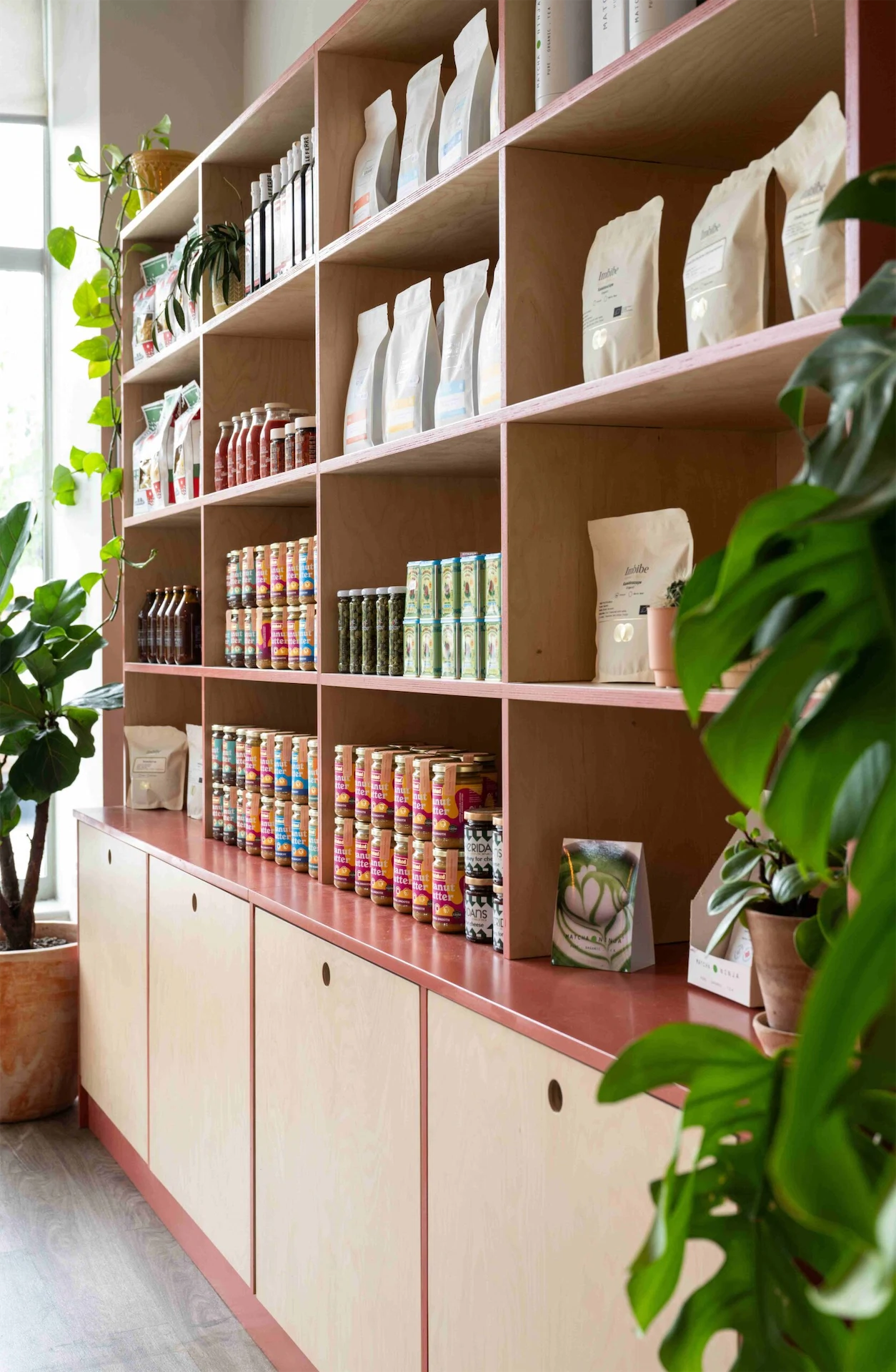 Colour was another important aspect of this design. “The transformation of the café was guided by a carefully curated selection of materials and a thoughtfully designed colour palette, drawing inspiration from the brand’s existing identity,” Lisa explains. “We aimed for a clean and bright aesthetic throughout, with birch plywood joinery adding natural warmth and soft pale pinks complemented by accents of green and mustard. A curved terracotta wall graphic became a key focal point, and an irregular tile pattern on the backdrop introduced a playful and unexpected touch to the counter area.”