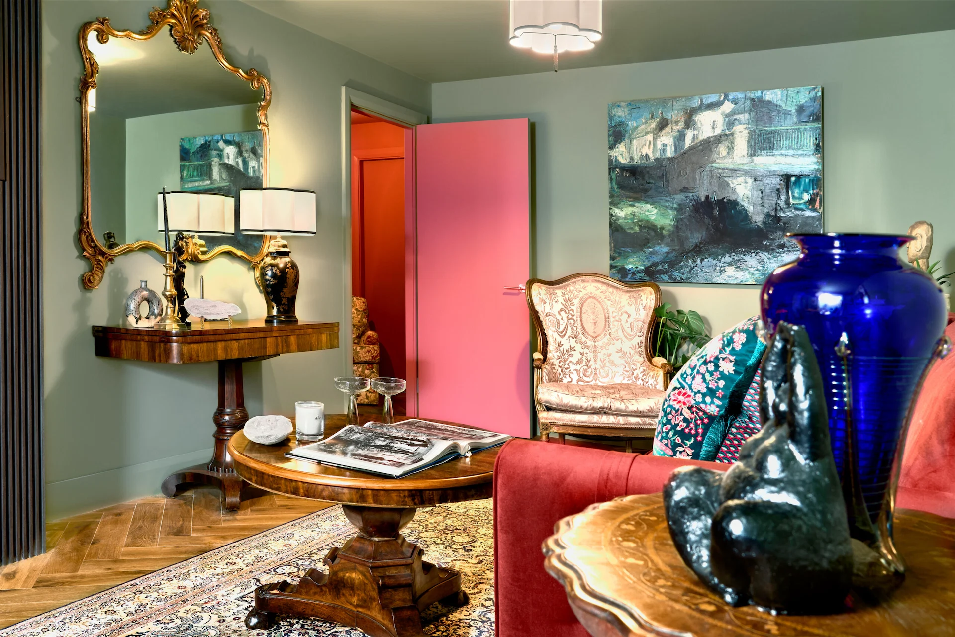 When it came to choosing a colour palette, inspiration also came from their client’s collection. “She had this beautiful armchair that was in her home when she lived in America. The fabric design was a stunning floral pattern with vibrant colours which we took for the colour palette which consisted of deep greens and strong raspberry reds for the hallway.”