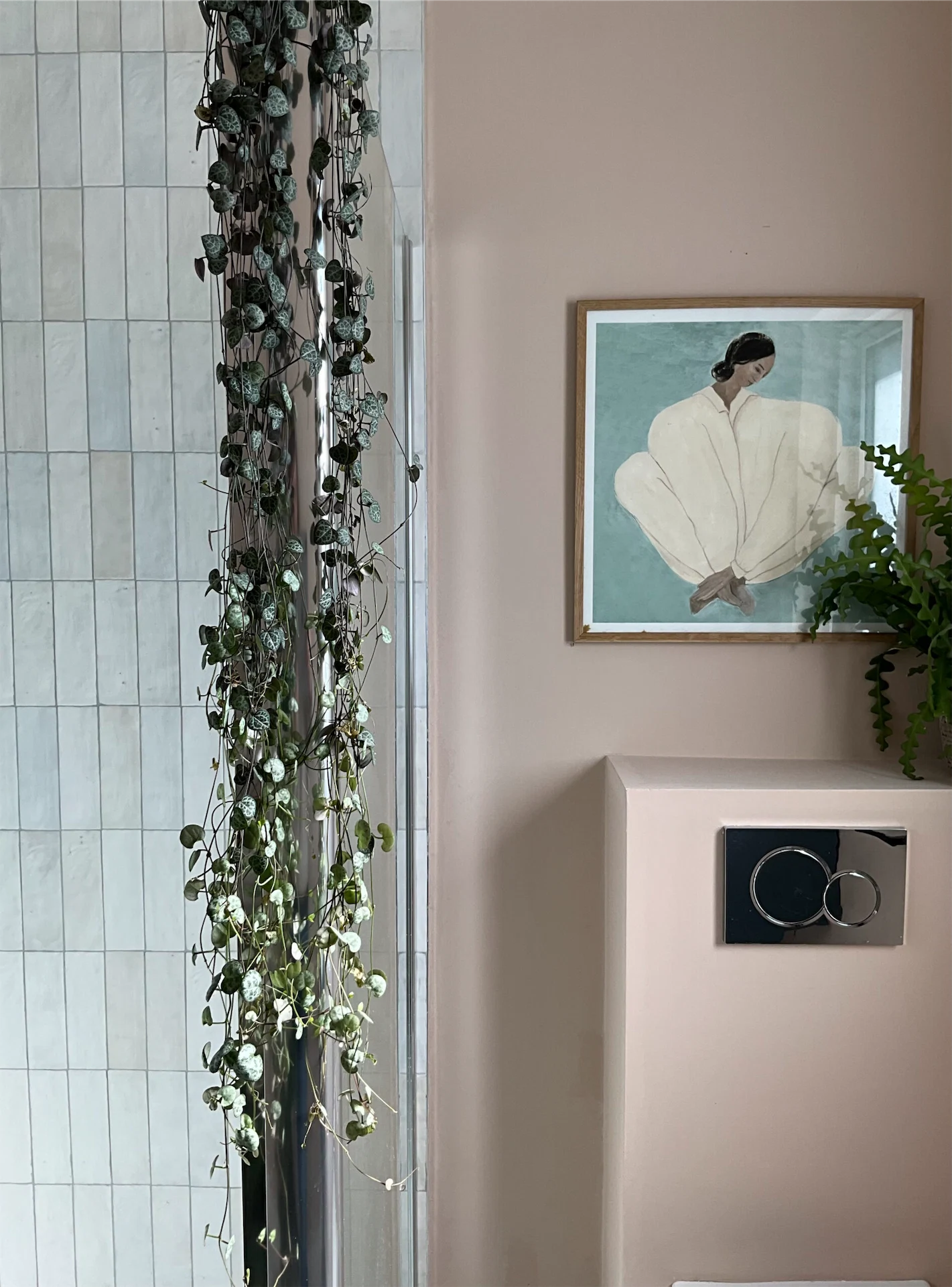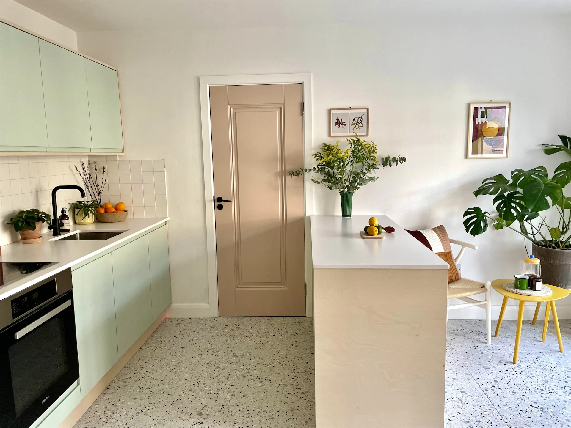 Hidden storage was incorporated into the kitchen design to maximise its functionality. “Brendan Kavanagh played a vital role, crafting bespoke cabinetry that perfectly complemented the overall aesthetic,” Lisa explains. “The painted cabinets with exposed birch ply edges provide a natural and warm contrast to the space. I opted for a fresh and airy colour palette of pink and mint with accents of wine and mustard added in, once again taking inspiration from the hanging artwork by Marina Esmeraldo.”