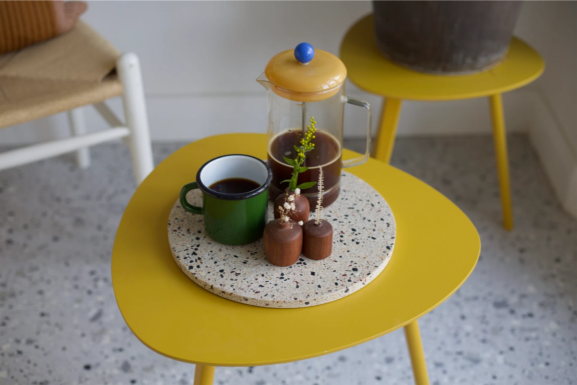 In the hall and living room, engineered oak flooring from Trunk flooring in a wide plank helps to create a sense of openness. Artwork by Alice Fitzgerald greets visitors at the entryway. In the kitchen, terrazzo tile adds pattern to the space.