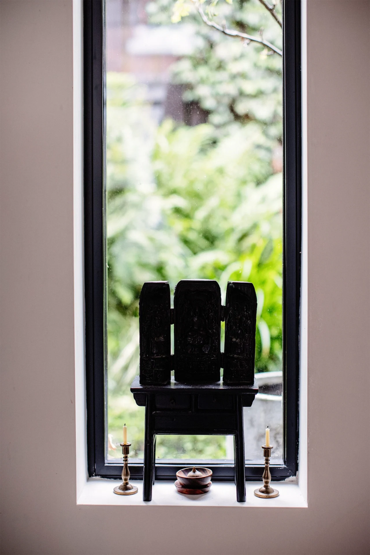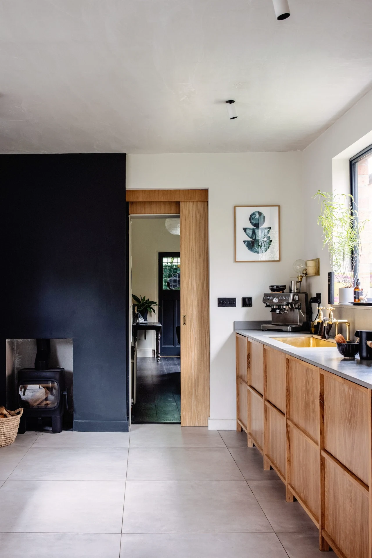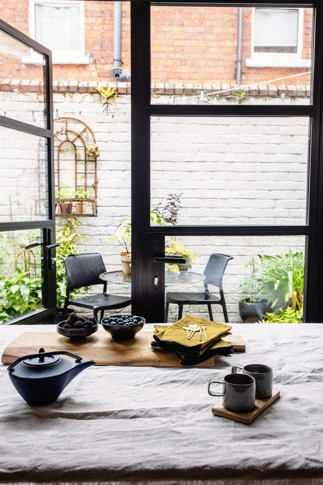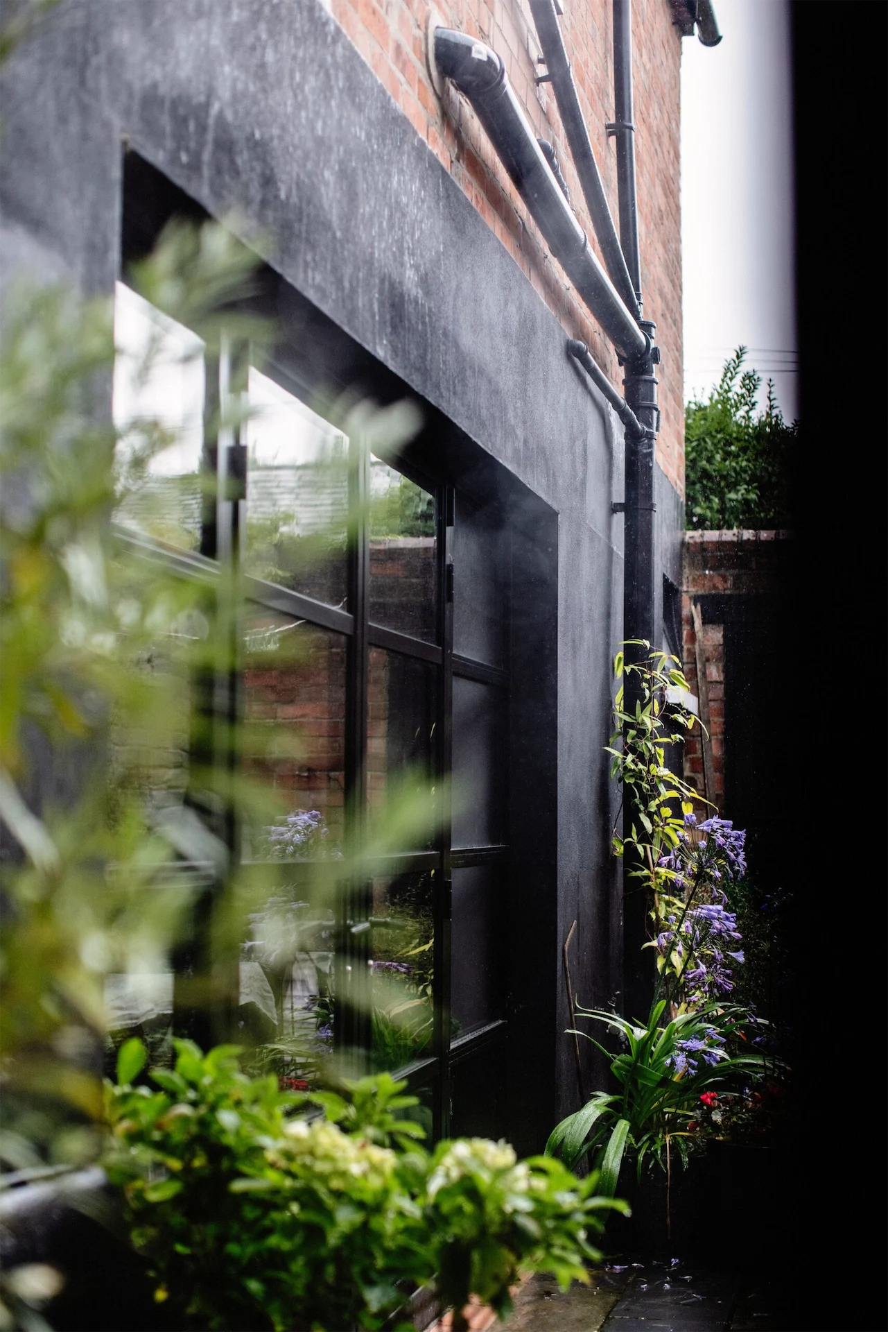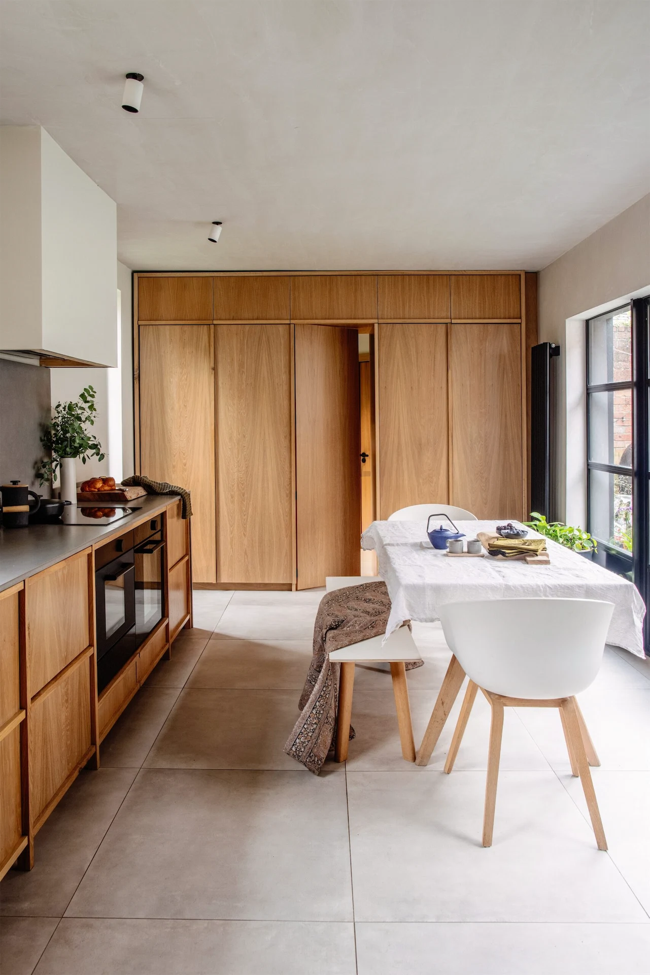 The biggest project to date has been tackling the long kitchen, separating the end of it with wooden units that conceal floor-to-ceiling storage, while one panel opens to reveal a hidden utility and bathroom. Adding everything they wanted without the need for an extension, this approach also preserved the yards on either side of this space, as well as the light and soft greenery contained within them.