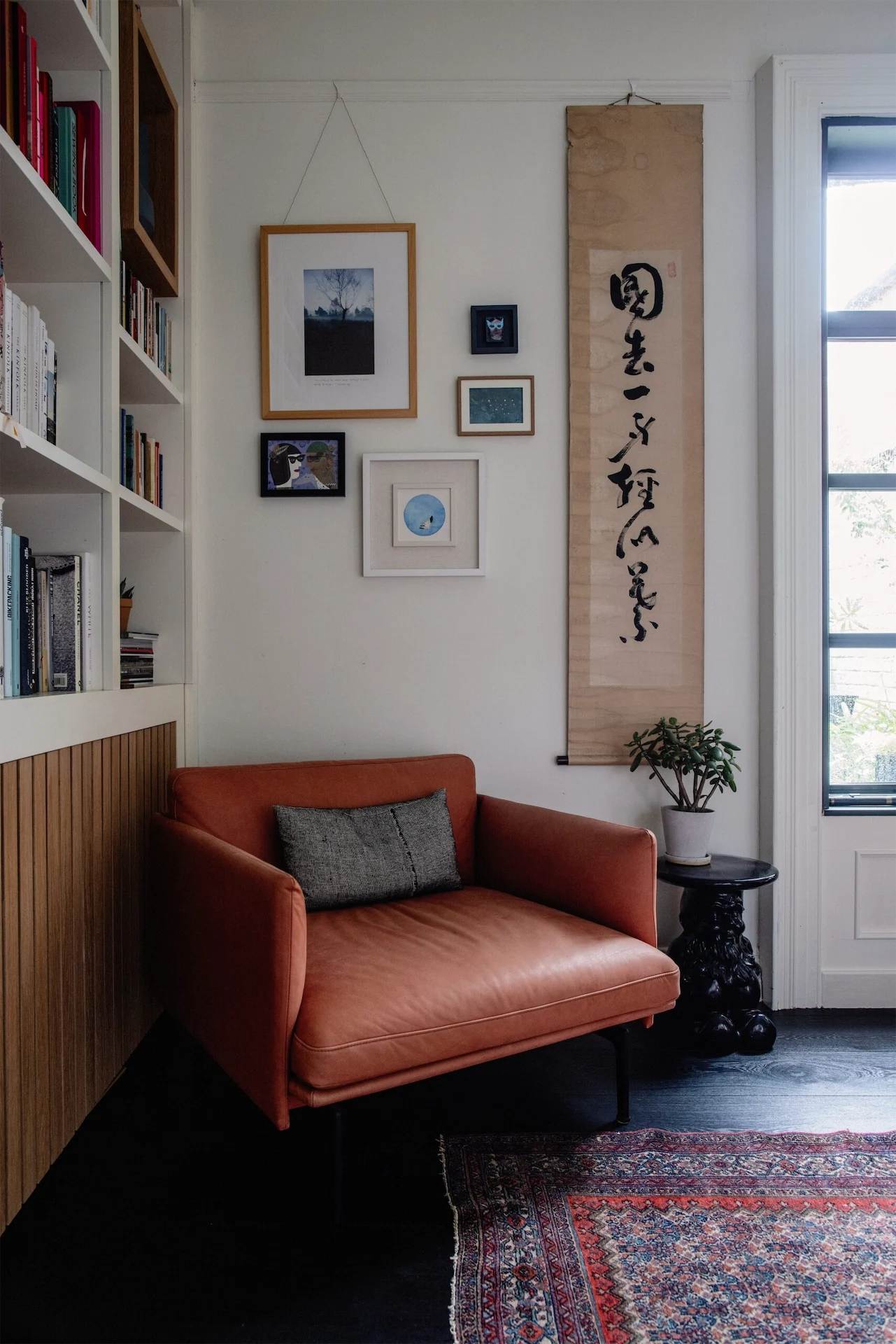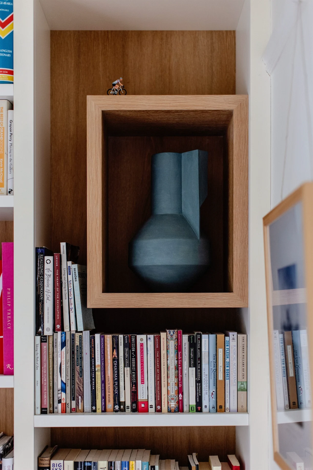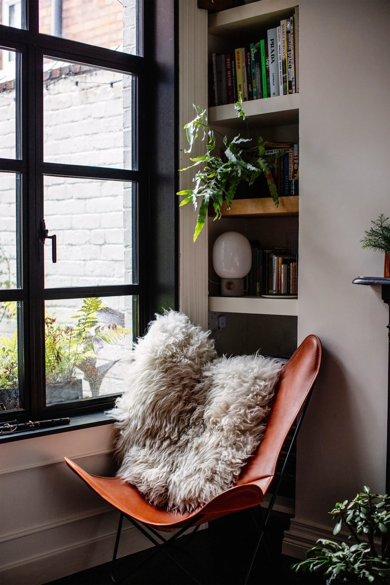 Another important space is the snug that also looks out onto the courtyard. “This room for us is all about reading and music,” Esther explains. “We have a Friday night ritual where we go in, put a record on and each take a book from the shelf. We can spend hours that way.” Floor-to-ceiling shelving on one wall and in the alcoves beside the fireplace was added for books and records, with a special oak insert for a Derek Wilson vessel.