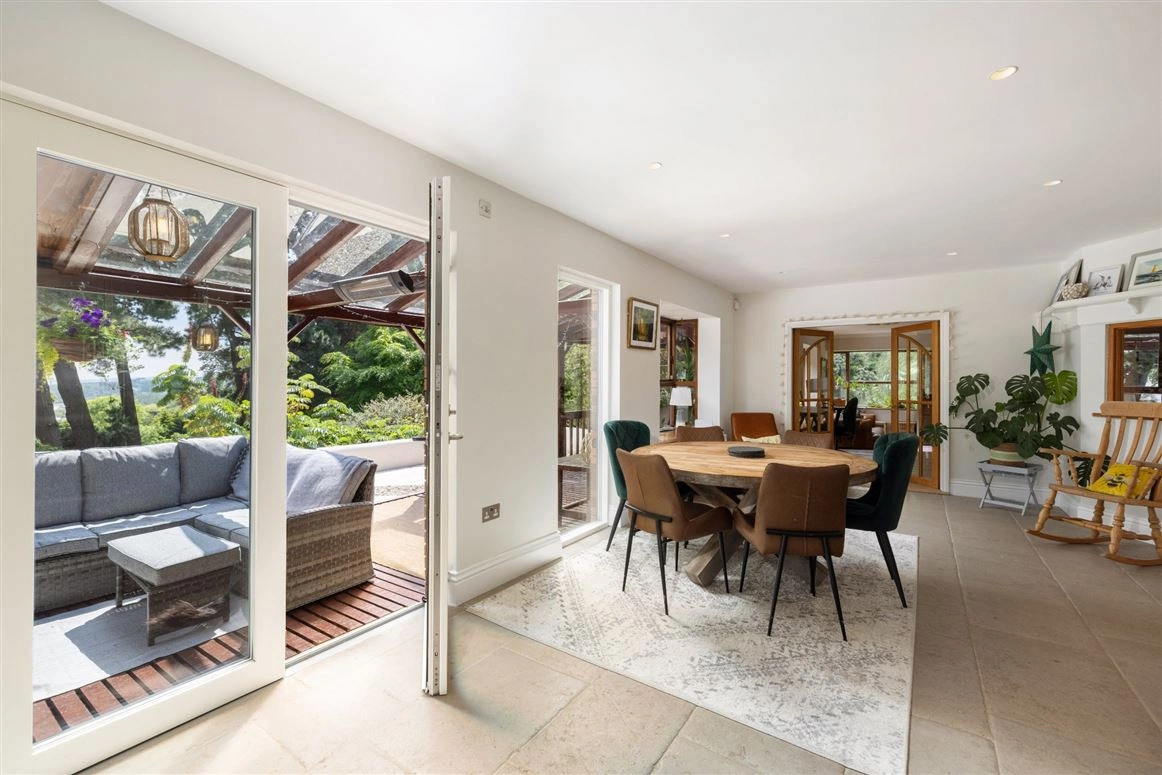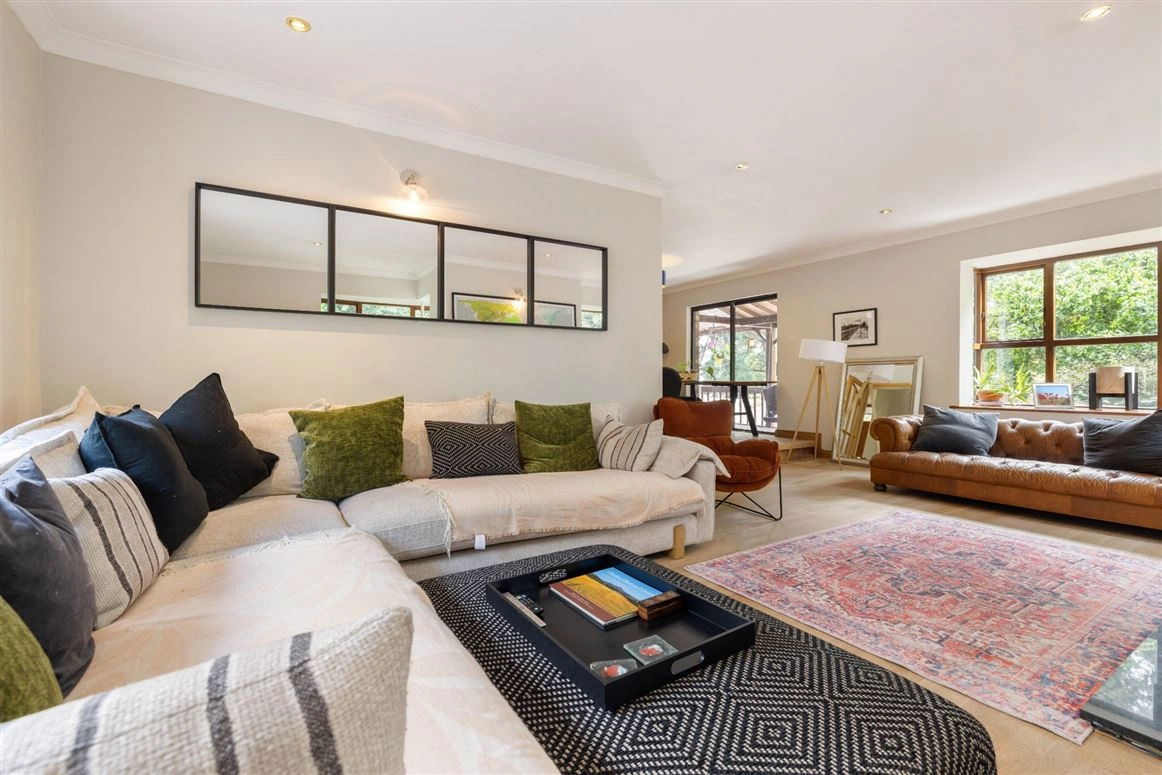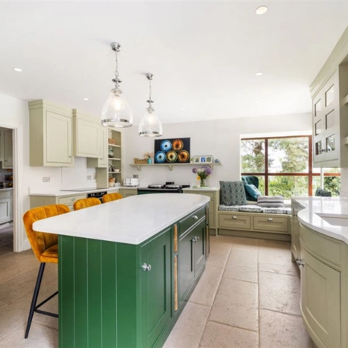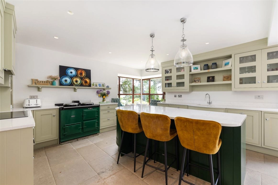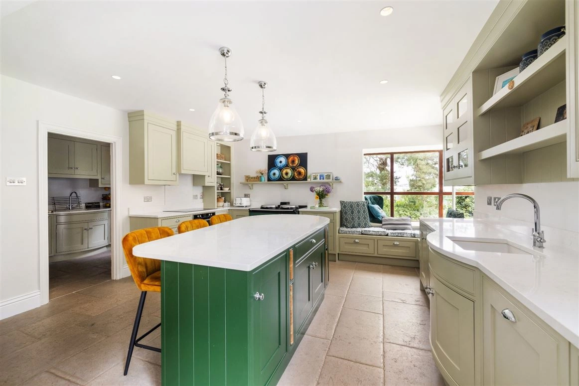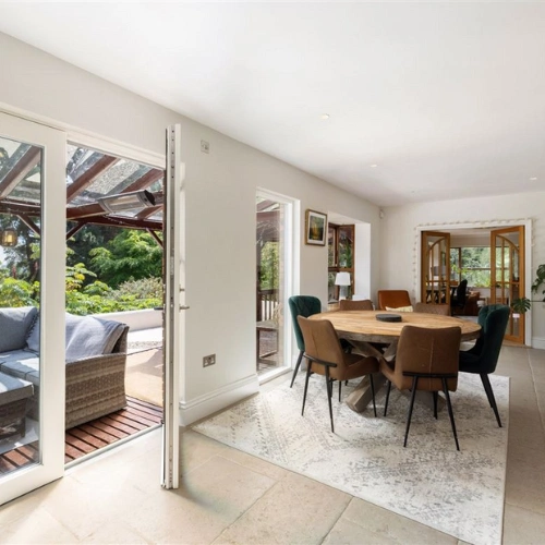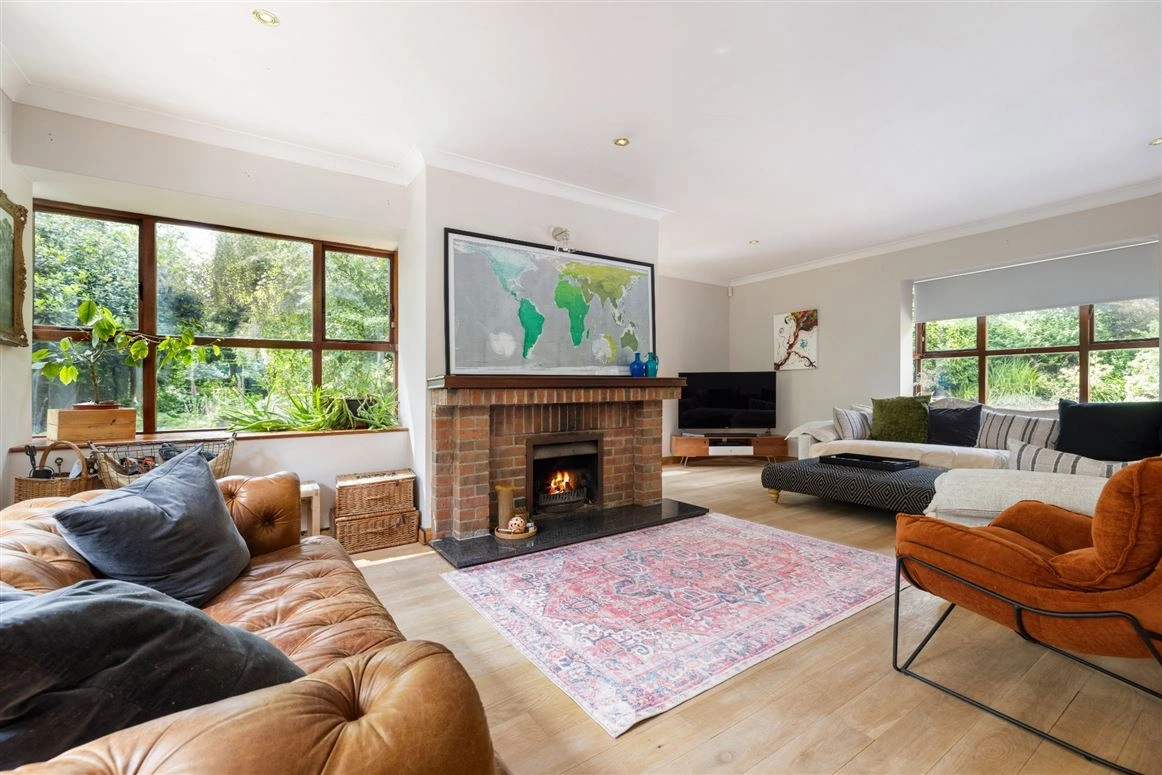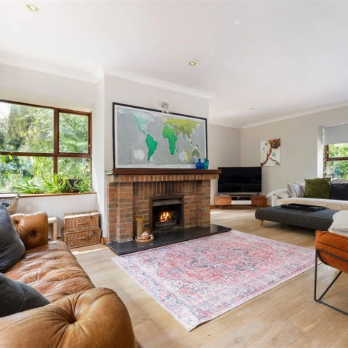 A double-height entrance hall greets you upon entering the property, setting the tone for the rest of the home. The expansive L-shaped living space is bathed in natural light courtesy of triple-aspect windows and features an inviting open fire, ideal for cosy nights in.