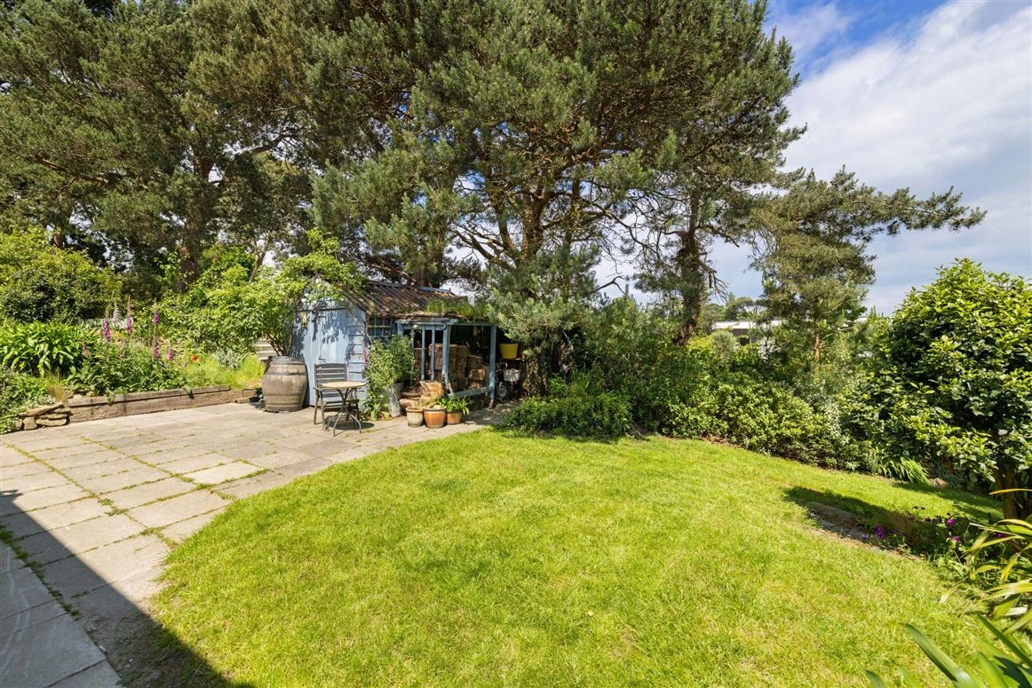 Wrought iron gates open onto a tarmacadam drive which leads up to the front of the property. Light-coloured patio tiles guide the way around the home to the rear where the gardens extend to approximately one acre.
