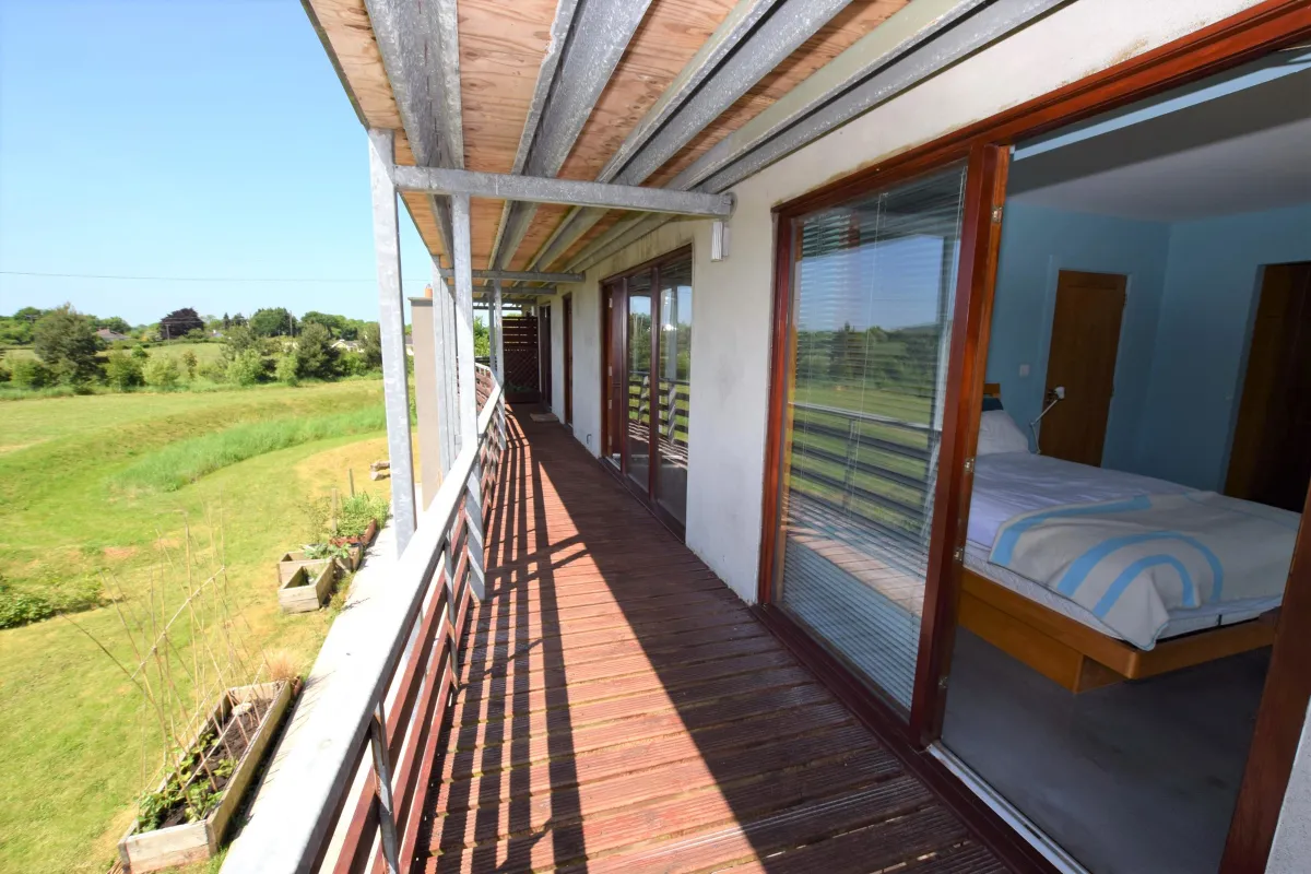 Upstairs, a generous feature balcony extends along the south-facing length of the house. The overhanging loggia (covered roof) shades the house from summer sun and shelters in wintery weather.